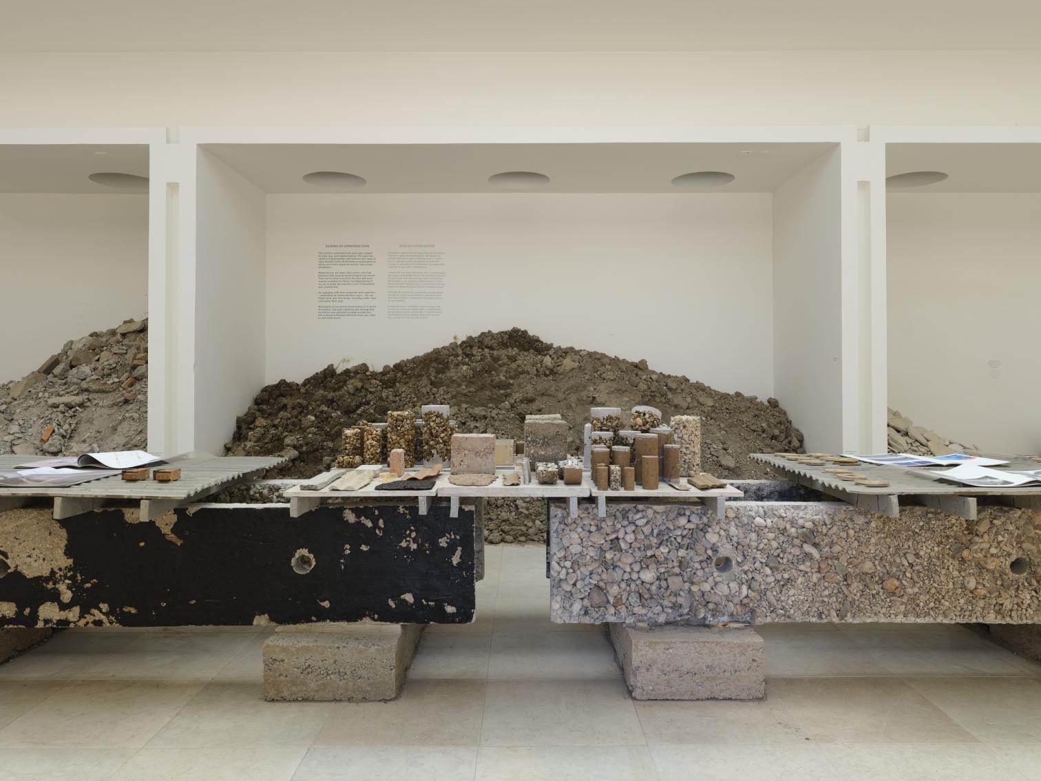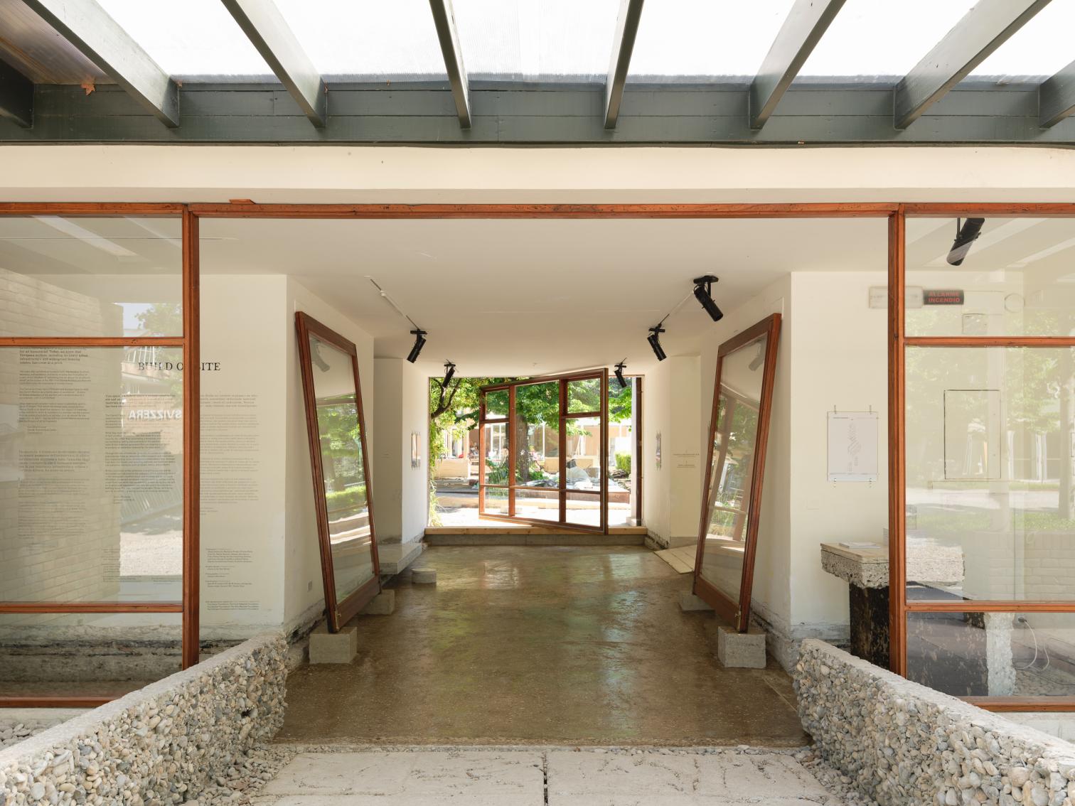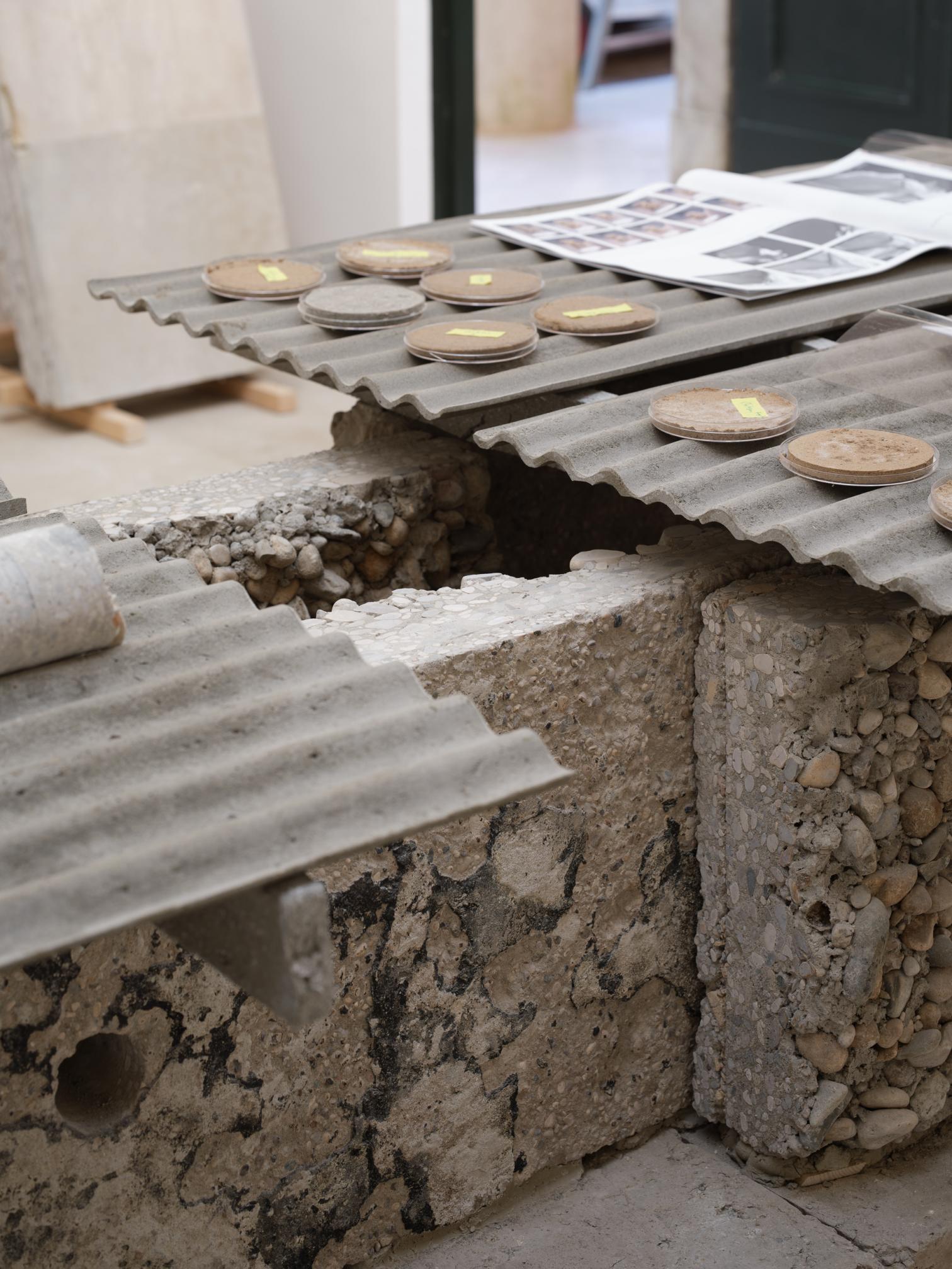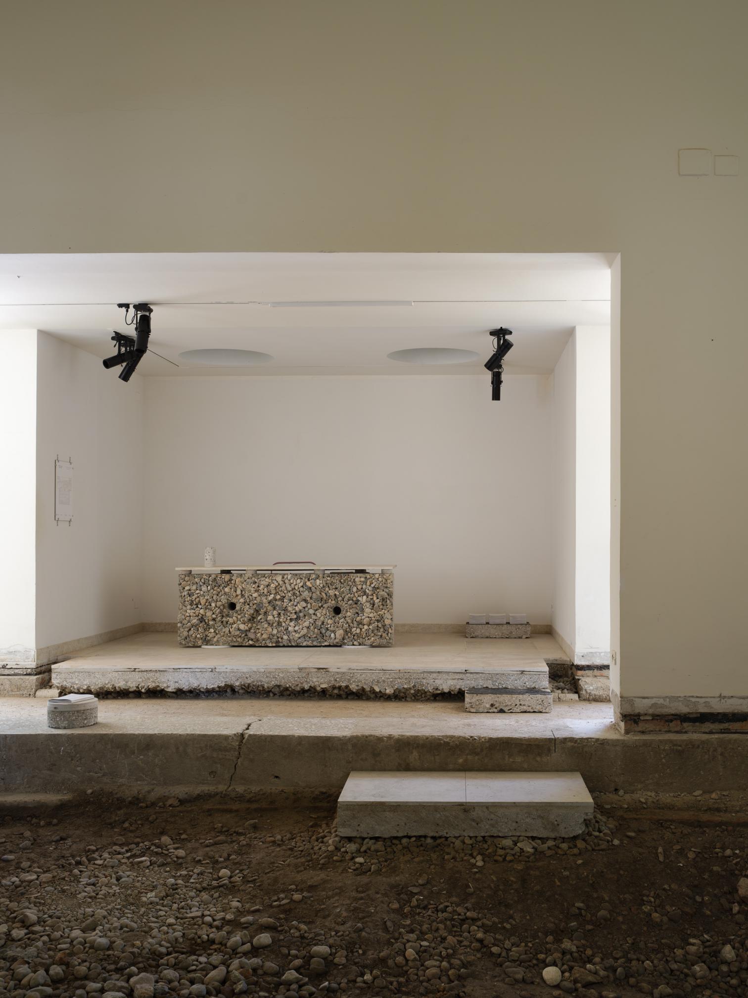 Iniciadas las labores a finales de 2024, mientras dure la Bienal los visitantes tendrán la sensación de entrar en una reforma a medio hacer, casi como en una pausa de los albañiles. Por los rincones se amontonan los escombros, las armaduras, las carpinterías desvencijadas. En las partes sin pavimento, el suelo que se pisa es irregular y queda centímetros por debajo de la cota de calle. Y, sin embargo, aquí no hay ni polvo, y ninguna operación es azarosa: esto no deja de ser una exposición. Por las salas en distinto estado de desmontaje se traza un recorrido cuidado donde bancos, rampas, peanas y una mesa de muestras se han diseñado ingeniosamente con los propios materiales de la restauración: recursos, en palabras del comisario, ‘hiperlocales’.