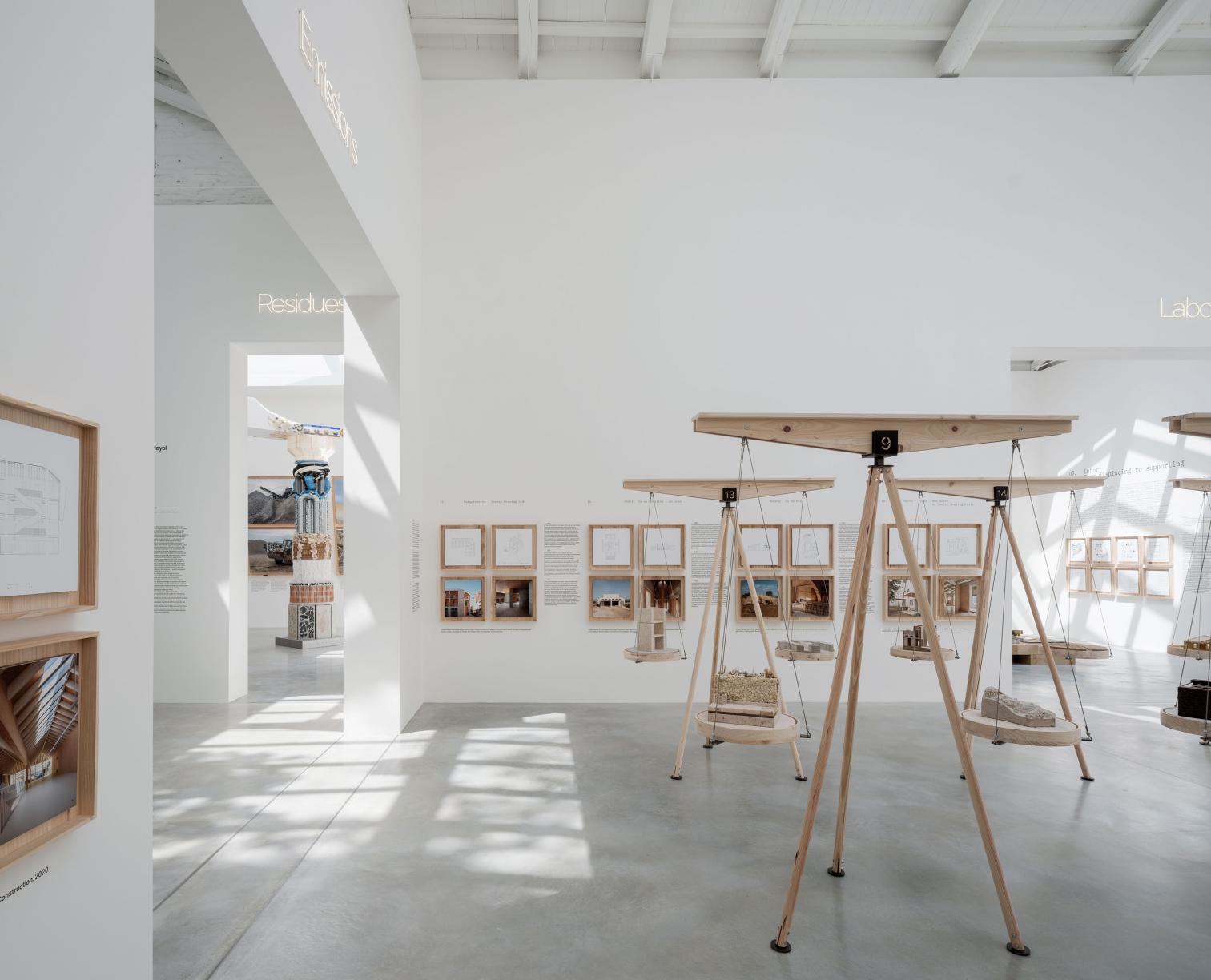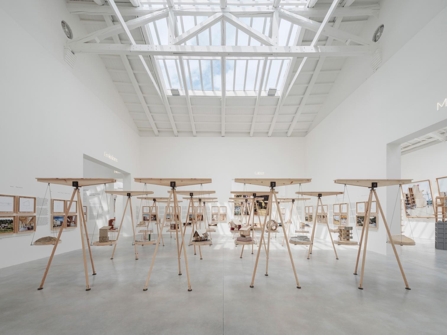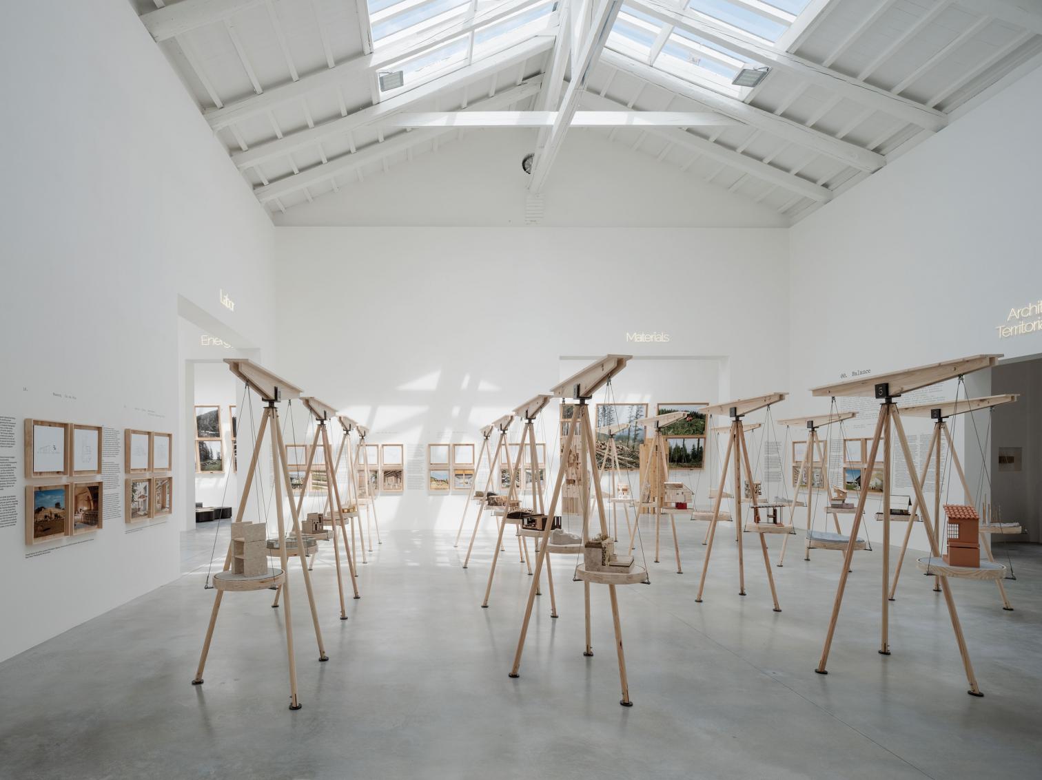 Sin embargo, el punto fuerte del pabellón es, sin duda, su sala central, donde se aprecia que en España —y sobre todo en algunas de sus geografías— hay una generación de arquitectos que lleva tiempo fomentando un modelo de construcción más responsable con el medio, con unas operativas que antes de proponer miran a su entorno, y que se sirven principalmente de los recursos —sean materiales o técnicos— que tienen a su alrededor. El equilibrio entre las arquitecturas y el territorio de estas prácticas ‘internalizadas’ se evidencia en el montaje expositivo: balanzas compensadas por dos maquetas del mismo proyecto, una que muestra los materiales y procesos empleados y otra de escala territorial que representa su origen. La selección de trabajos comprende pequeñas reformas y conjuntos sociales, casas privadas y parques públicos, construcciones de marés y de madera; con ello se demuestra que estos vínculos son independientes de escalas, clientes o materiales, y que, con voluntad, la arquitectura puede ser parte activa de un cambio de clima positivo.