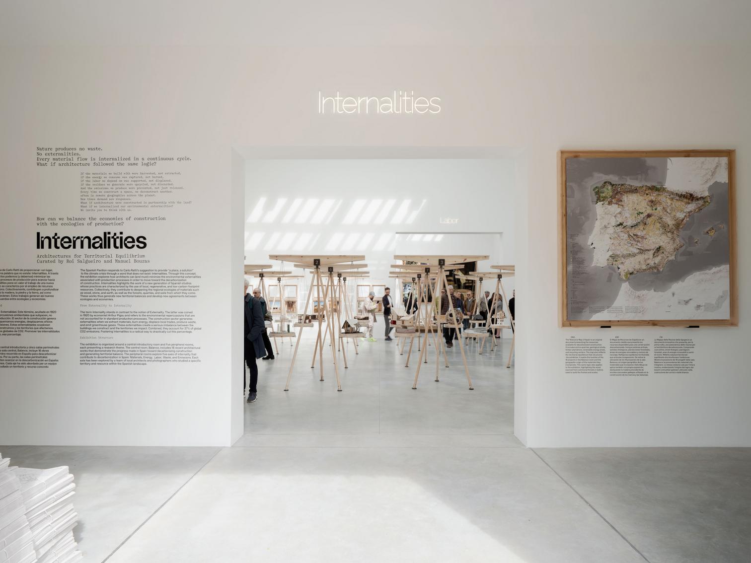 Sin caer en el orgullo patrio, si en los Giardini había una propuesta que parecía consciente de las contradicciones de este modelo de exposición, y en general del día a día de la profesión, esa era la de Roi Salgueiro y Manuel Bouzas para el pabellón de España. Los dos comisarios han centrado su mirada en la capacidad que tiene la arquitectura para generar equilibrios territoriales y, no contentos con este abstracto punto de partida, han acuñado una nueva palabra para explicarlo: ‘internalidad’. Es cierto que podría sonar como otro de los inveterados discursos buenistas, que, enarbolando la bandera de la ecología o la sostenibilidad, se basan en principios difícilmente cuantificables, y que al final alcanzan resultados muy alejados de la vanguardia. Sin embargo, aquí el neologismo resulta casi pertinente, ya que han armado un relato bien articulado en torno a una cuestión trascendental: si la naturaleza no produce desperdicios, y todos los materiales participan de un ciclo continuo, ¿no debería la arquitectura intentar minimizar las consecuencias asociadas a su producción?