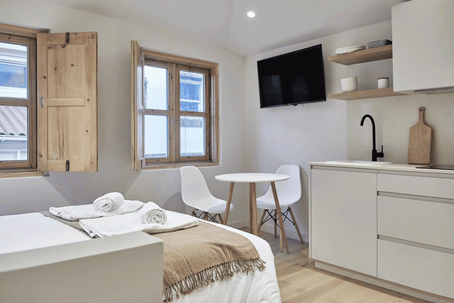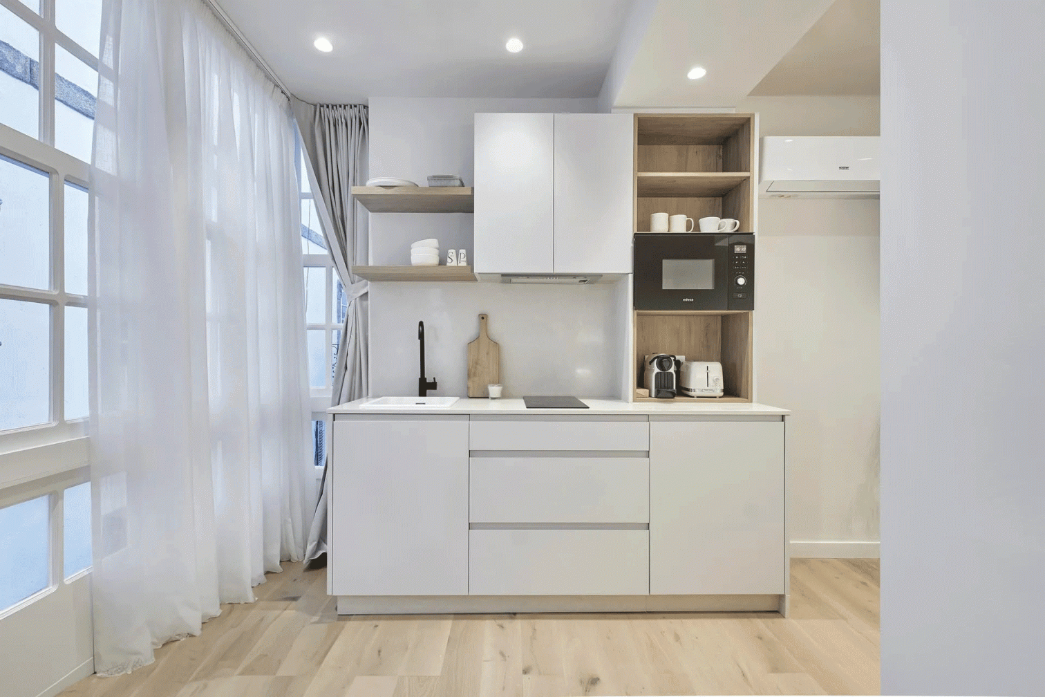Si bien se ha apostado por mantener la esencia tradicional del inmueble, la reforma también ha incorporado elementos modernos que garantizan la comodidad de los huéspedes. Los apartamentos cuentan ahora con aseos y cocinas totalmente equipadas con electrodomésticos de última generación, calefacción, aire acondicionado y un avanzado sistema de iluminación, logrando así espacios idóneos para una estancia inolvidable en A Coruña.