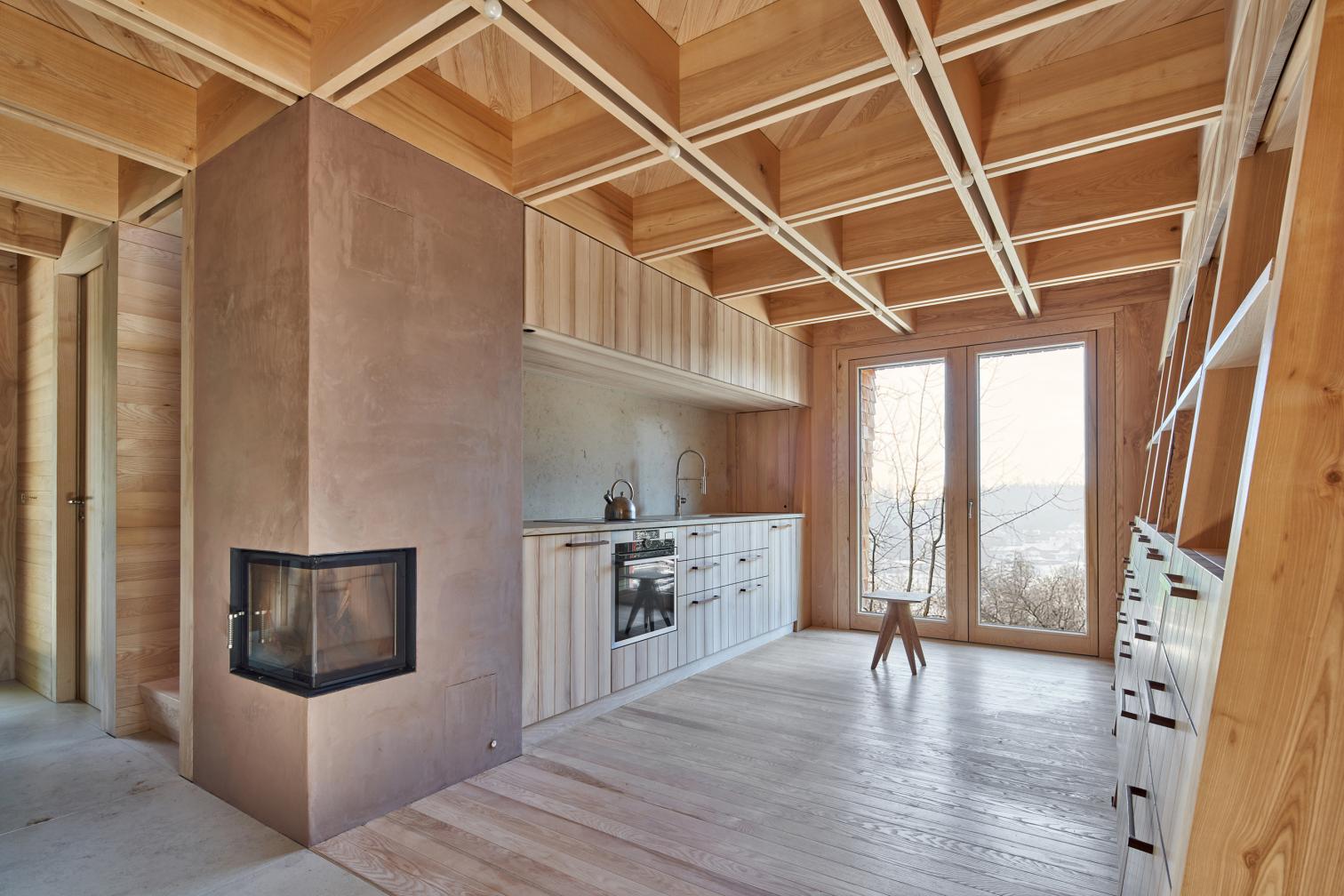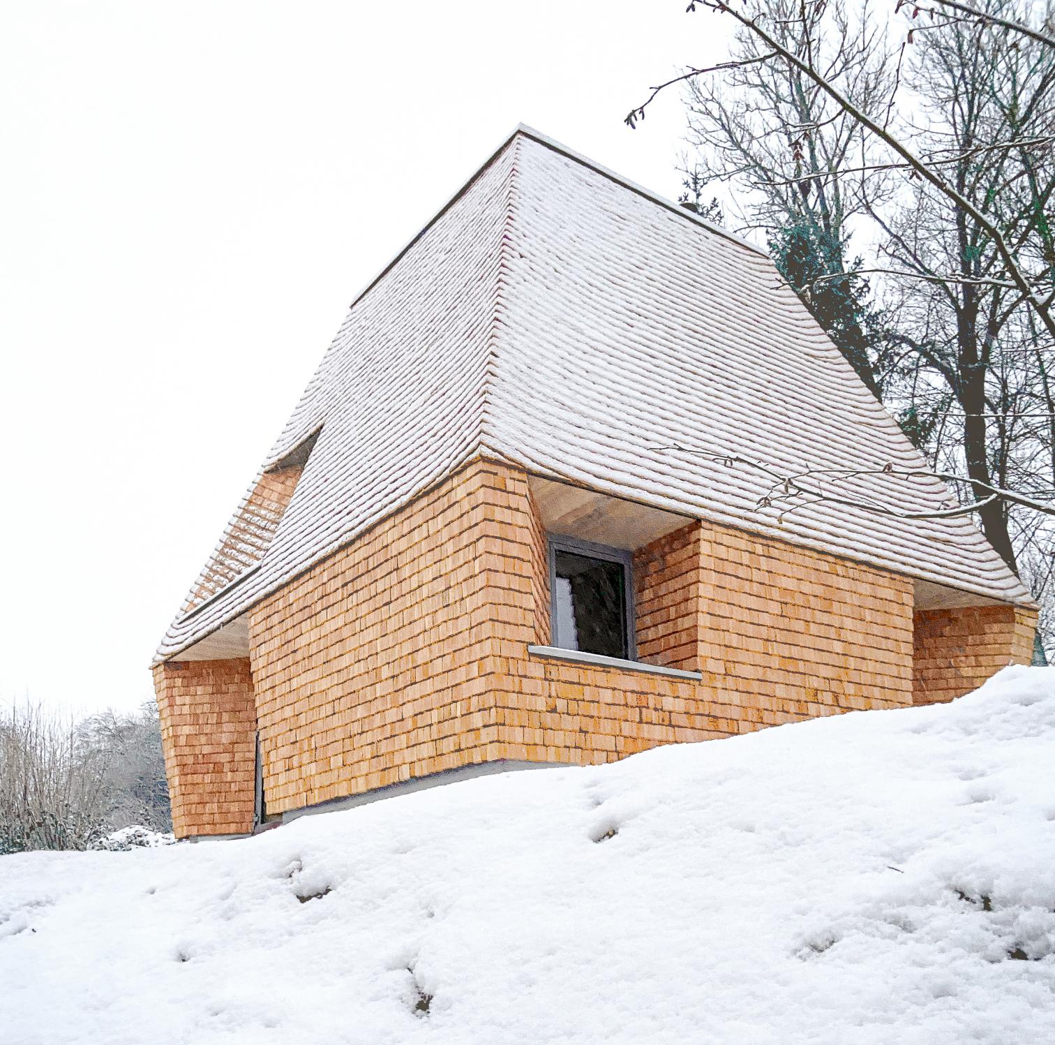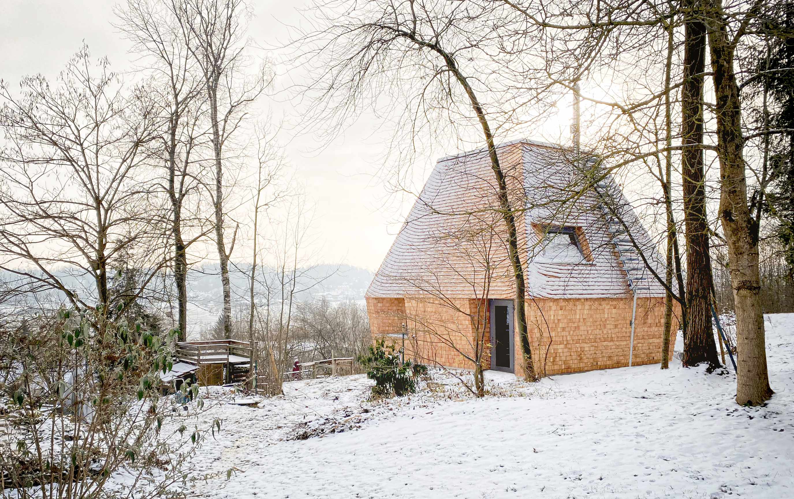 La casa está construida íntegramente en madera cerca de Augsburgo (Baviera), con vistas del valle de Schmutter. Desmontable, de dos plantas y con 7 metros de altura, la vivienda ha sido diseñada con un enfoque meticuloso en cada detalle, garantizando la máxima calidad constructiva mientras se minimiza la generación de residuos. Para lograrlo, se ha evitado el uso de elementos encolados, recurriendo exclusivamente a madera maciza ensamblada mediante uniones mecánicas y fresado CNC (Control Numérico Computarizado), combinando la maestría de la carpintería tradicional con las técnicas avanzadas de fabricación digital en una construcción contemporánea.