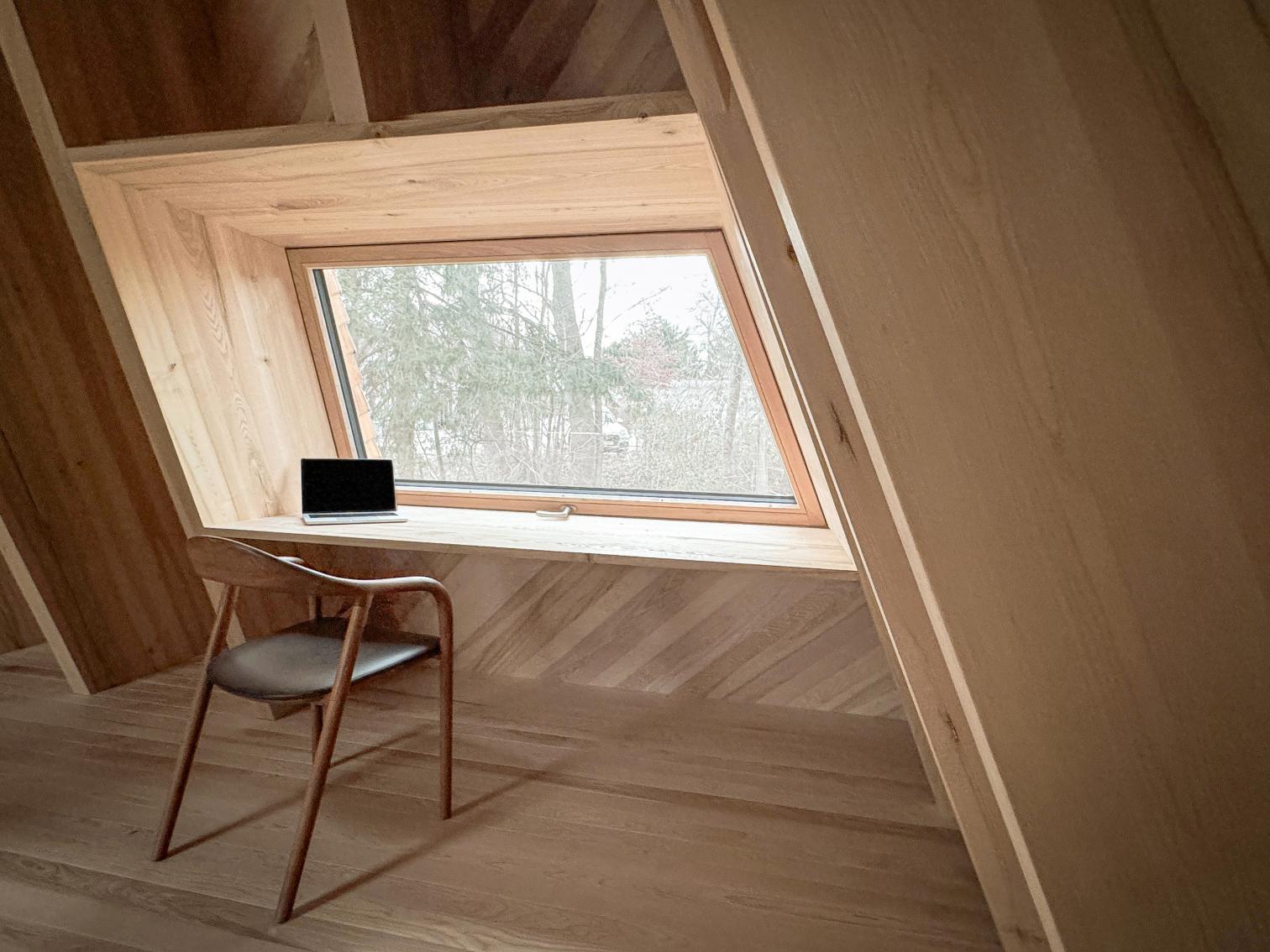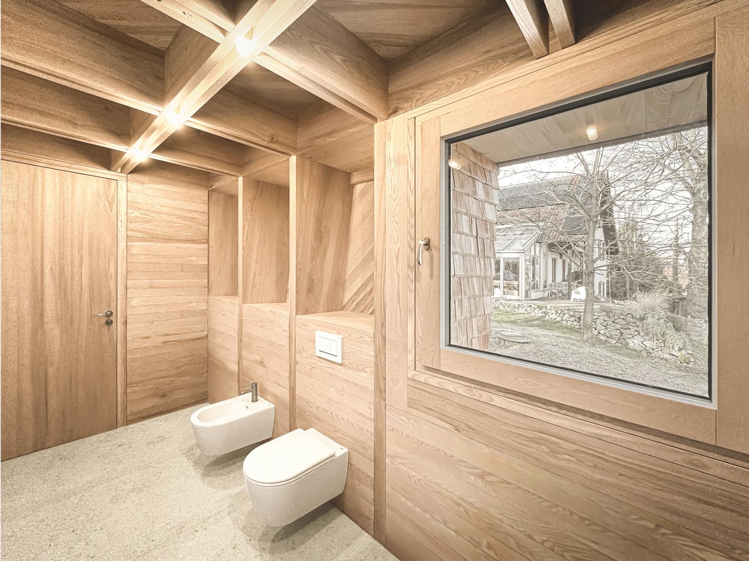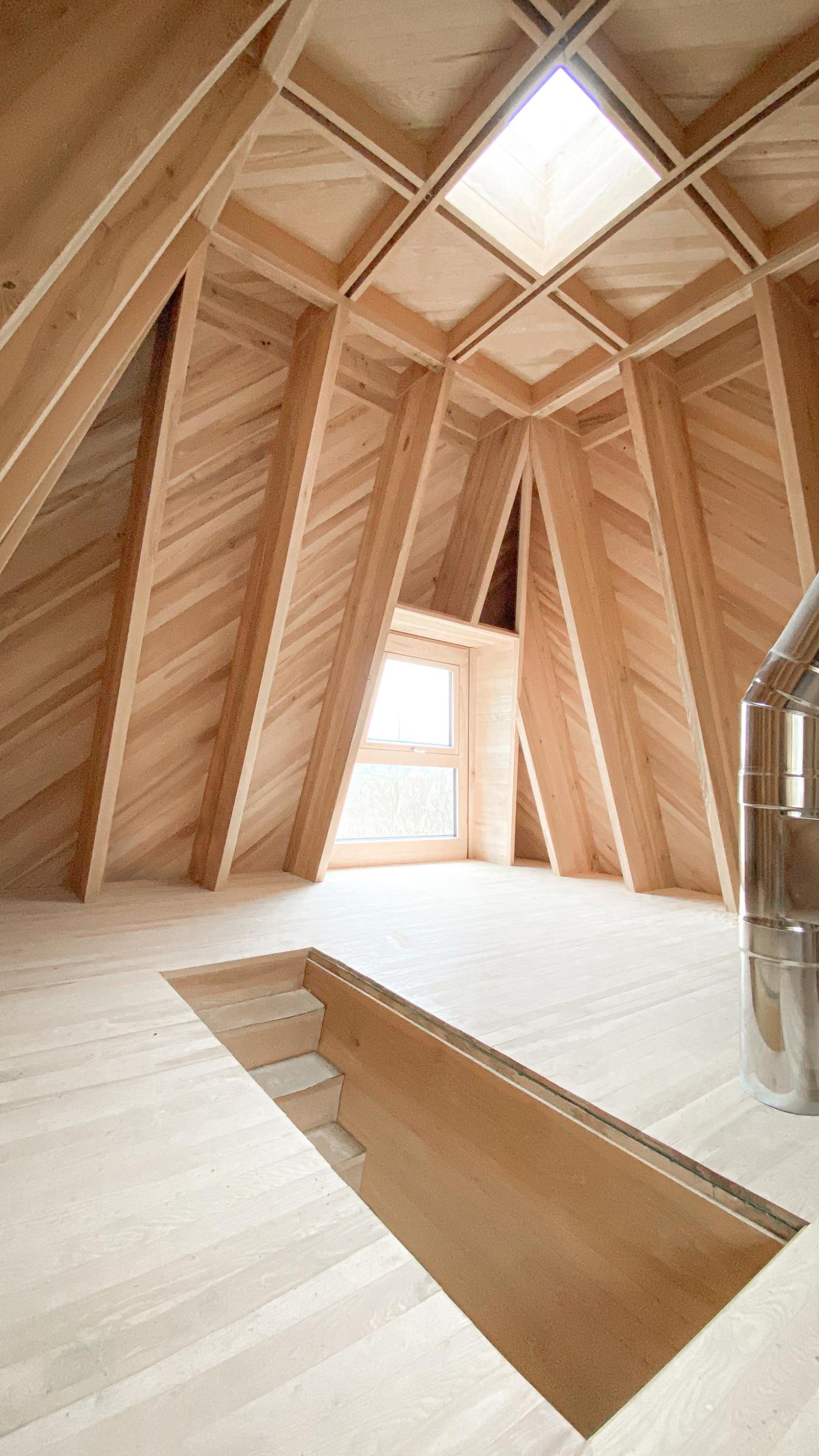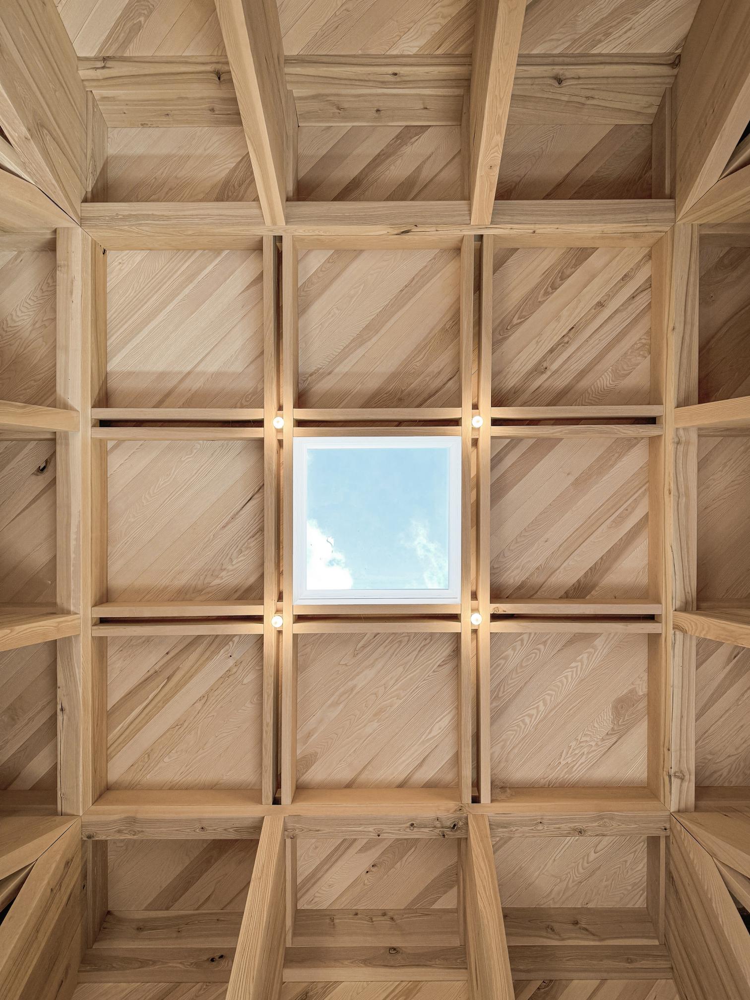 Los componentes se ensamblan sin adhesivos que contengan formaldehído ni conexiones metálicas galvanizadas. Las juntas de cola de milano aseguran la estabilidad de los soportes, mientras que las vigas del techo artesonado descansan sobre los mismos, inclinados hacia afuera en un ángulo de 7 grados para generar un alero amplio.