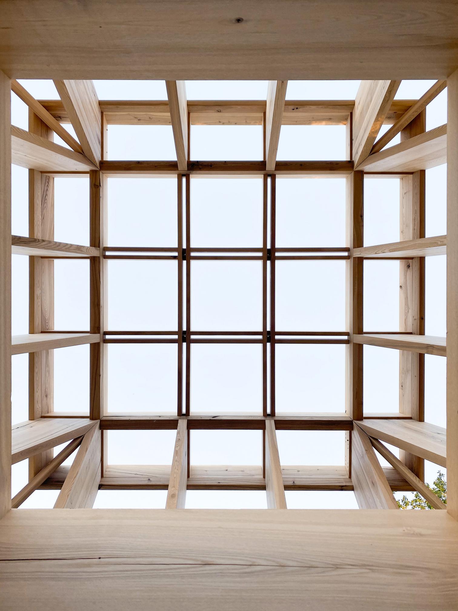 Las intersecciones de las vigas se realizan mediante espigas de madera, las cuales no solo aportan resistencia estructural, sino que también permiten el paso de cables para la iluminación a través de un orificio vertical.