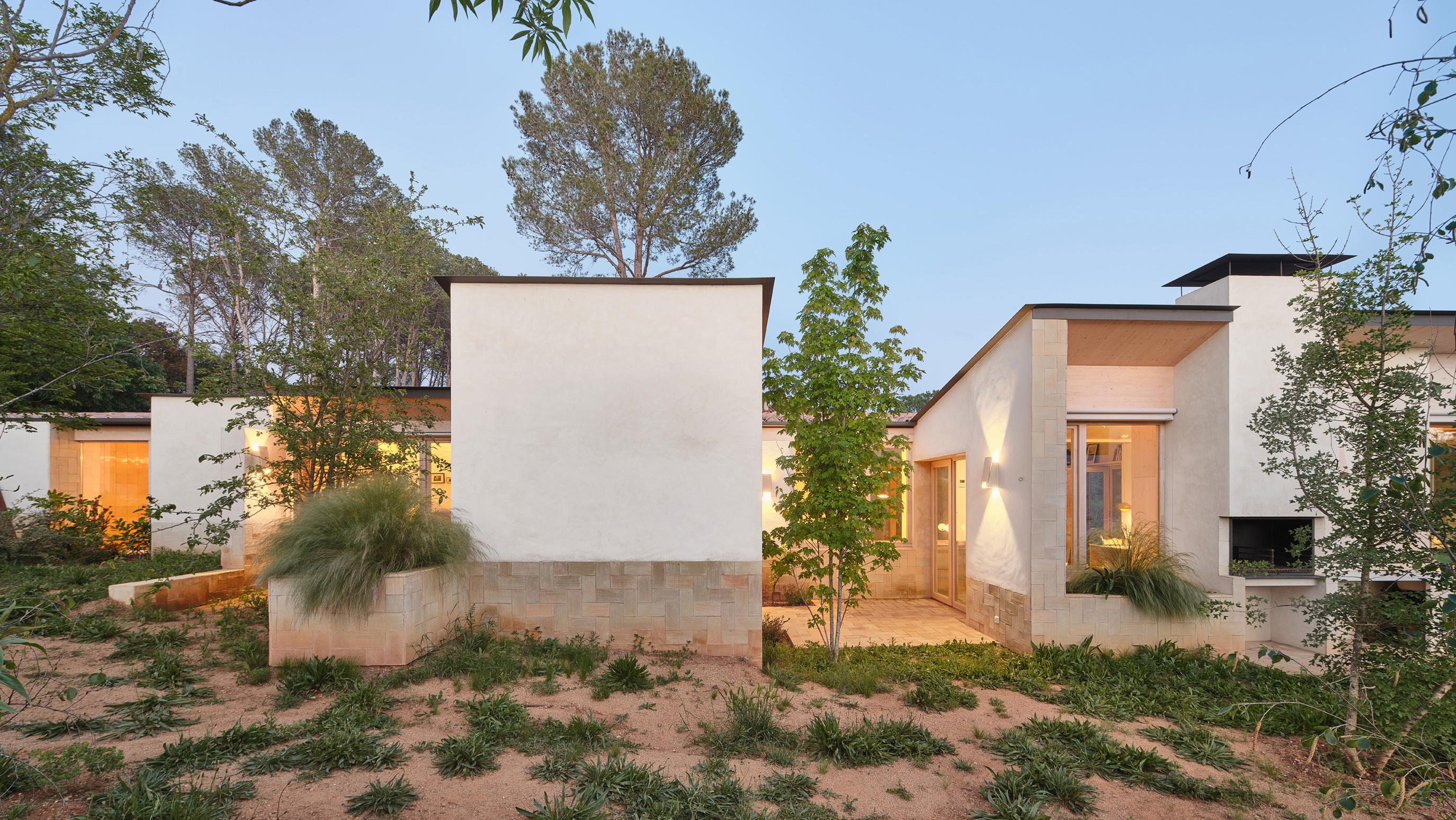 Sobre una base de piedra, los volúmenes se distribuyen entre patios y jardines, estableciendo una estrecha relación con el entorno. El recorrido interior está definido por un cuidado trabajo de materiales y por las conexiones que se generan entre las estancias y el exterior. Las formas de las cubiertas permiten crear ambientes con distintas alturas, aportando riqueza espacial.