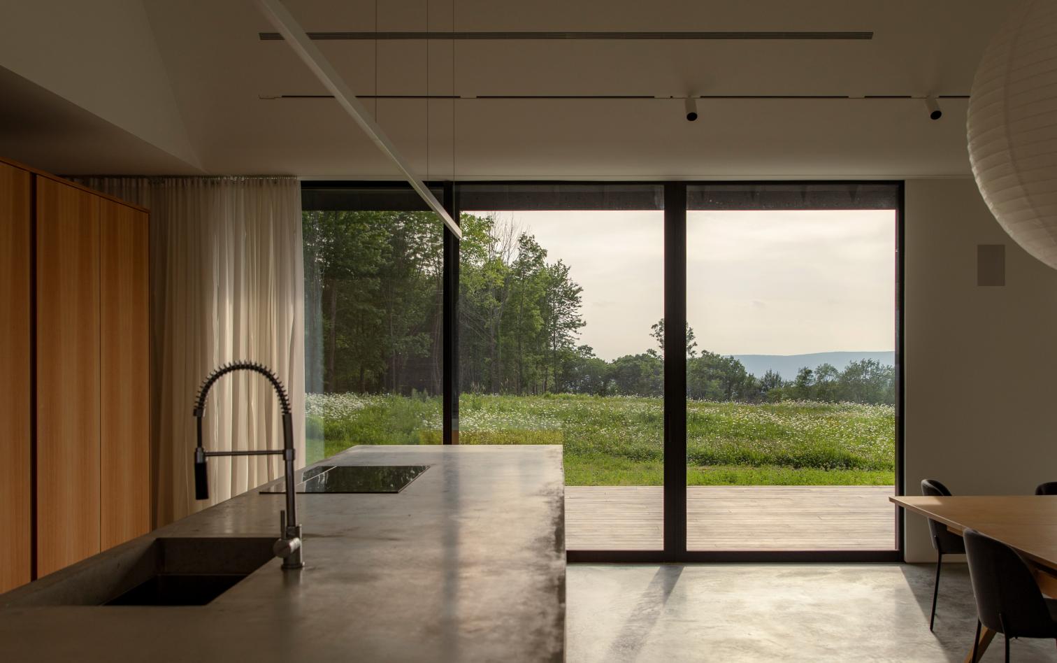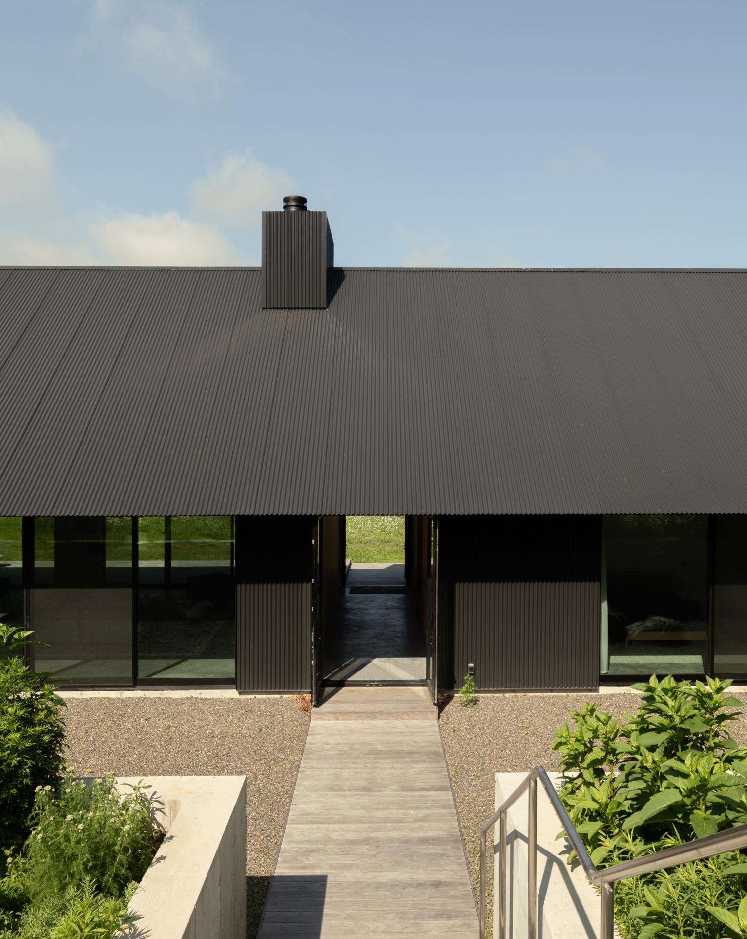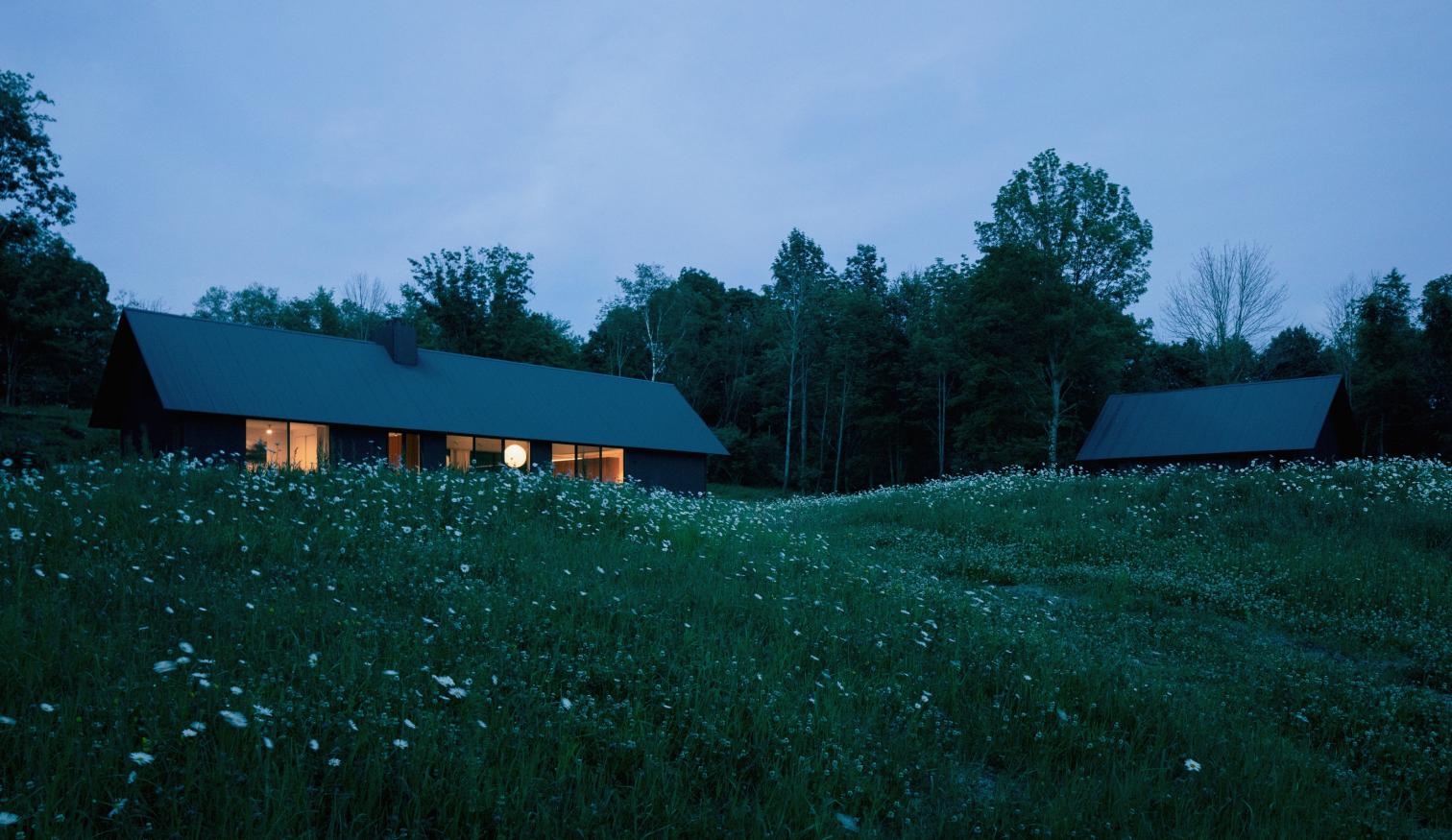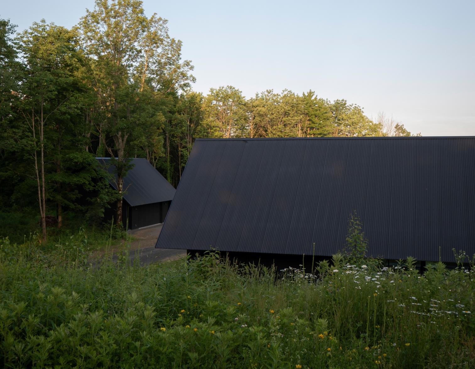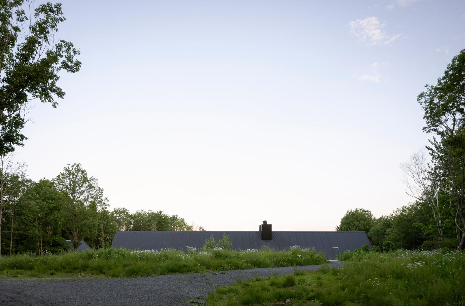 Obra de la firma de Brooklyn Group Projects Architecture, la casa se encuentra en una amplia parcela en Millerton, en el estado de Nueva York, con vistas a las montañas de Catskill. La construcción está situada en el nivel inferior de una pradera, siguiendo la línea de la cresta en la cota más alta de la propiedad, para evitar talar árboles y proteger el edificio de los vientos predominantes. El área plana resultante, retenida por un muro de hormigón, funciona como un íntimo patio delantero al aire libre, que contrasta con la extensión del prado.