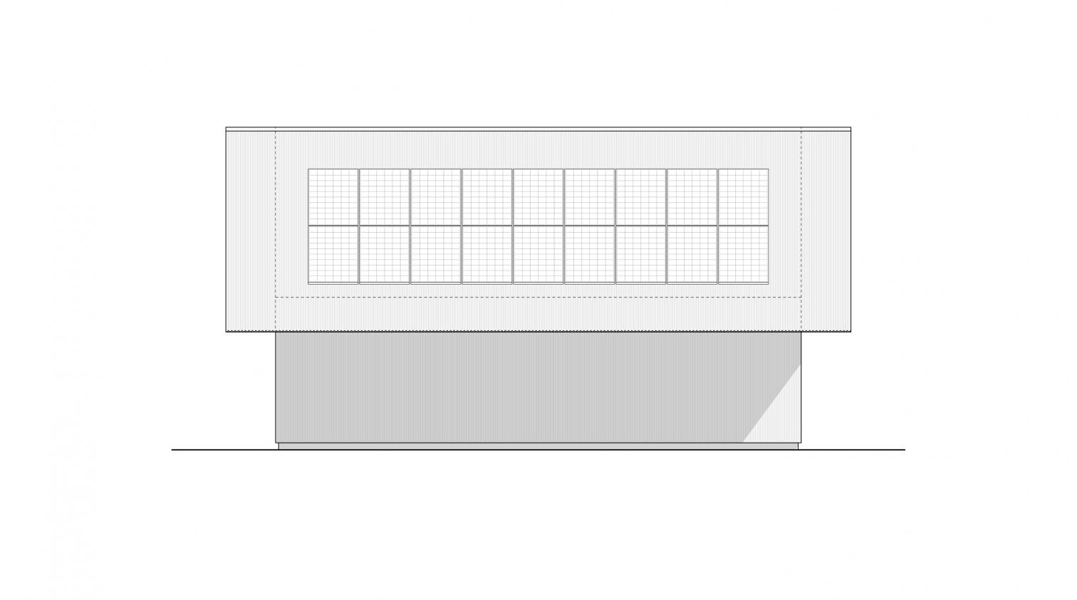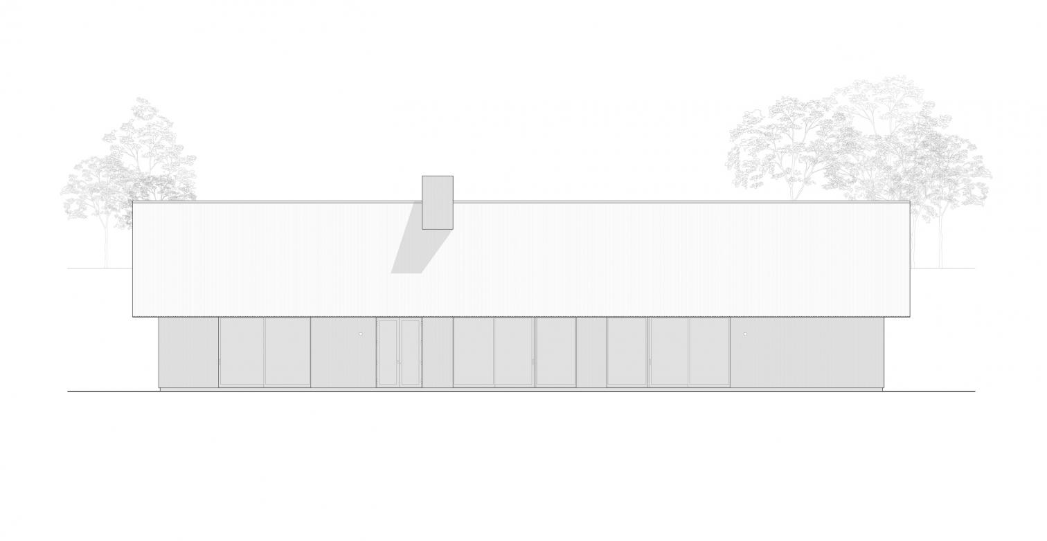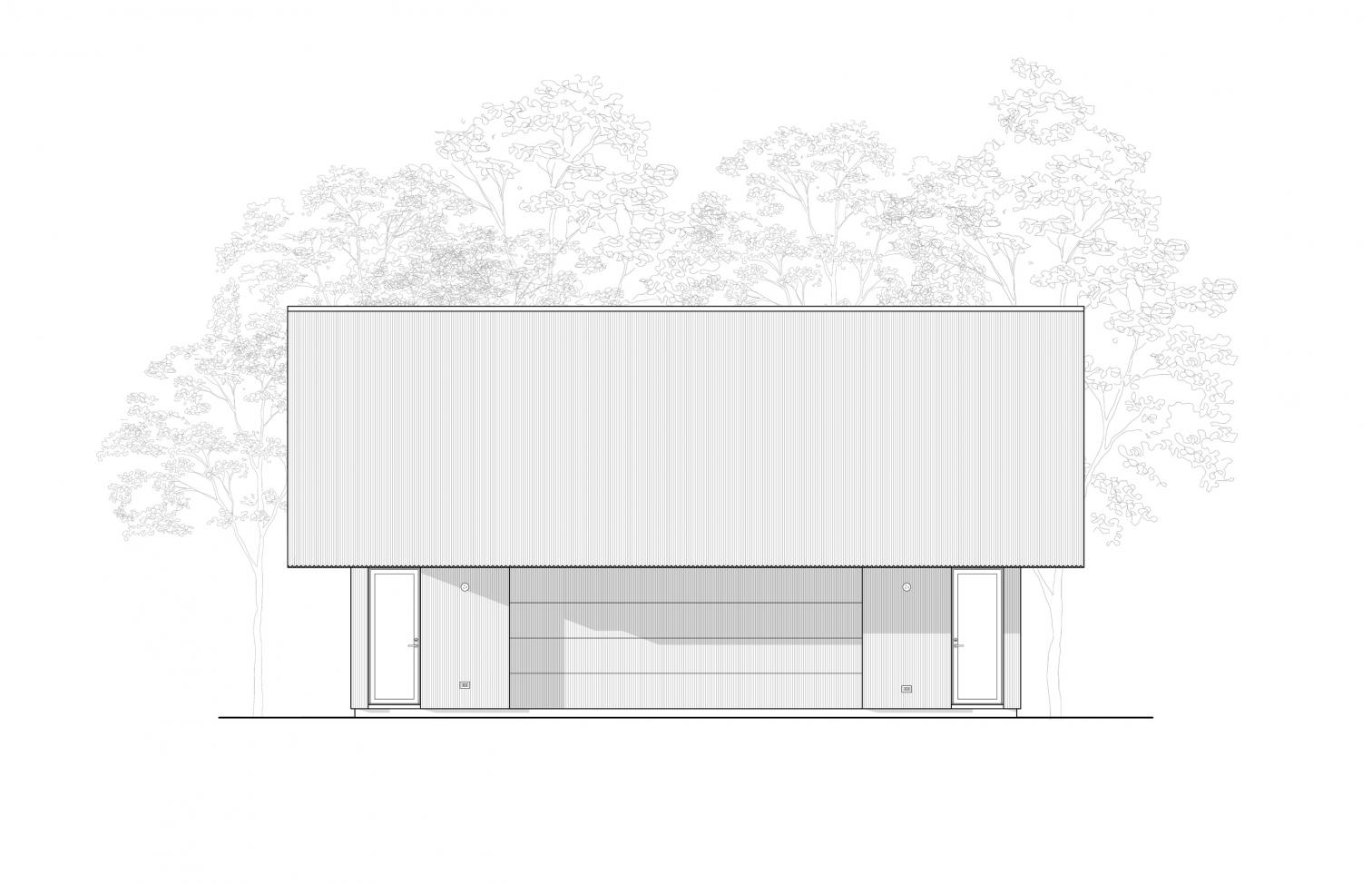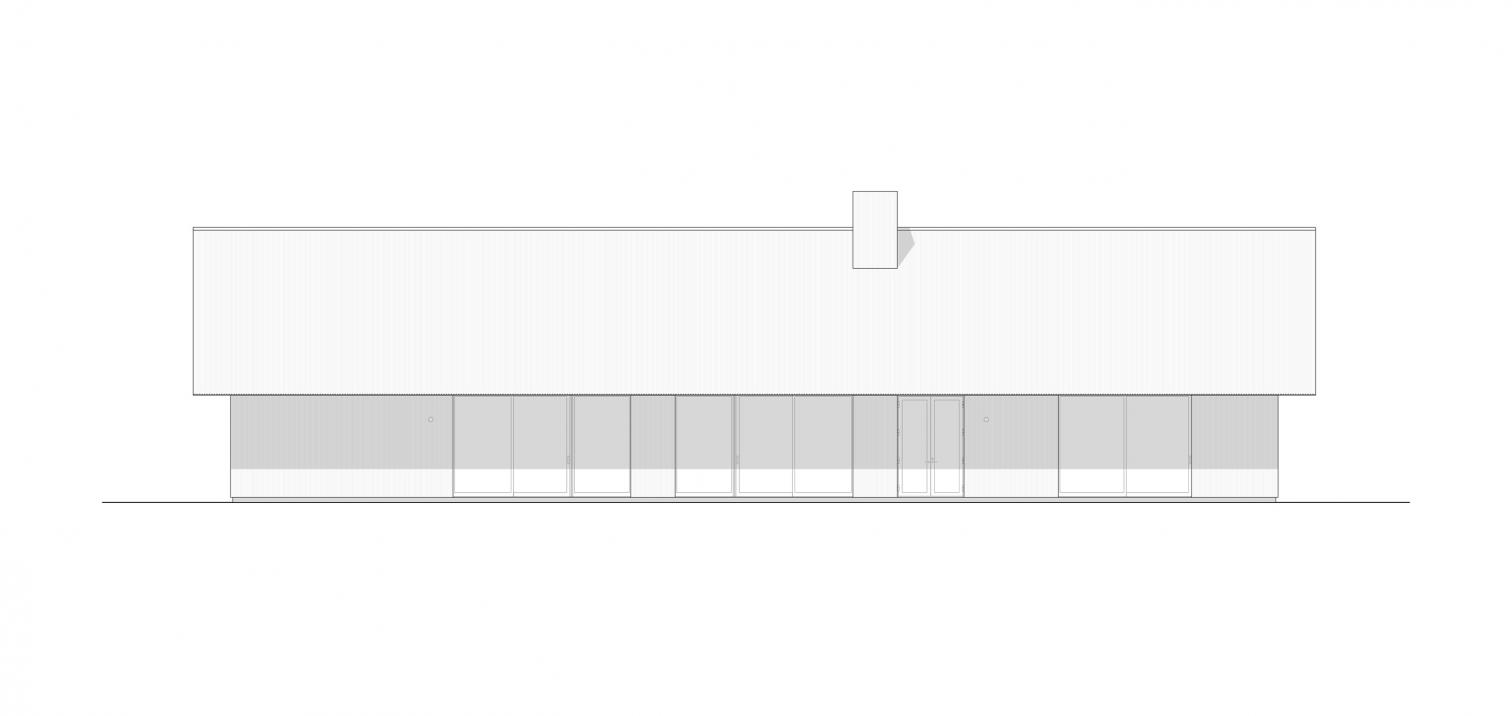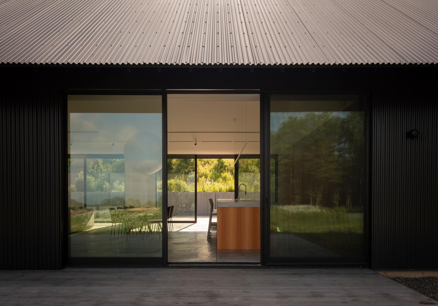 El revestimiento de metal corrugado en color negro otorga coherencia visual al conjunto de formas sencillas. Las cubiertas inclinadas a semejanza de las construcciones agrícolas presentan aleros abiertos que muestran las vigas pintadas en color negro, aportando ritmo al proyecto.