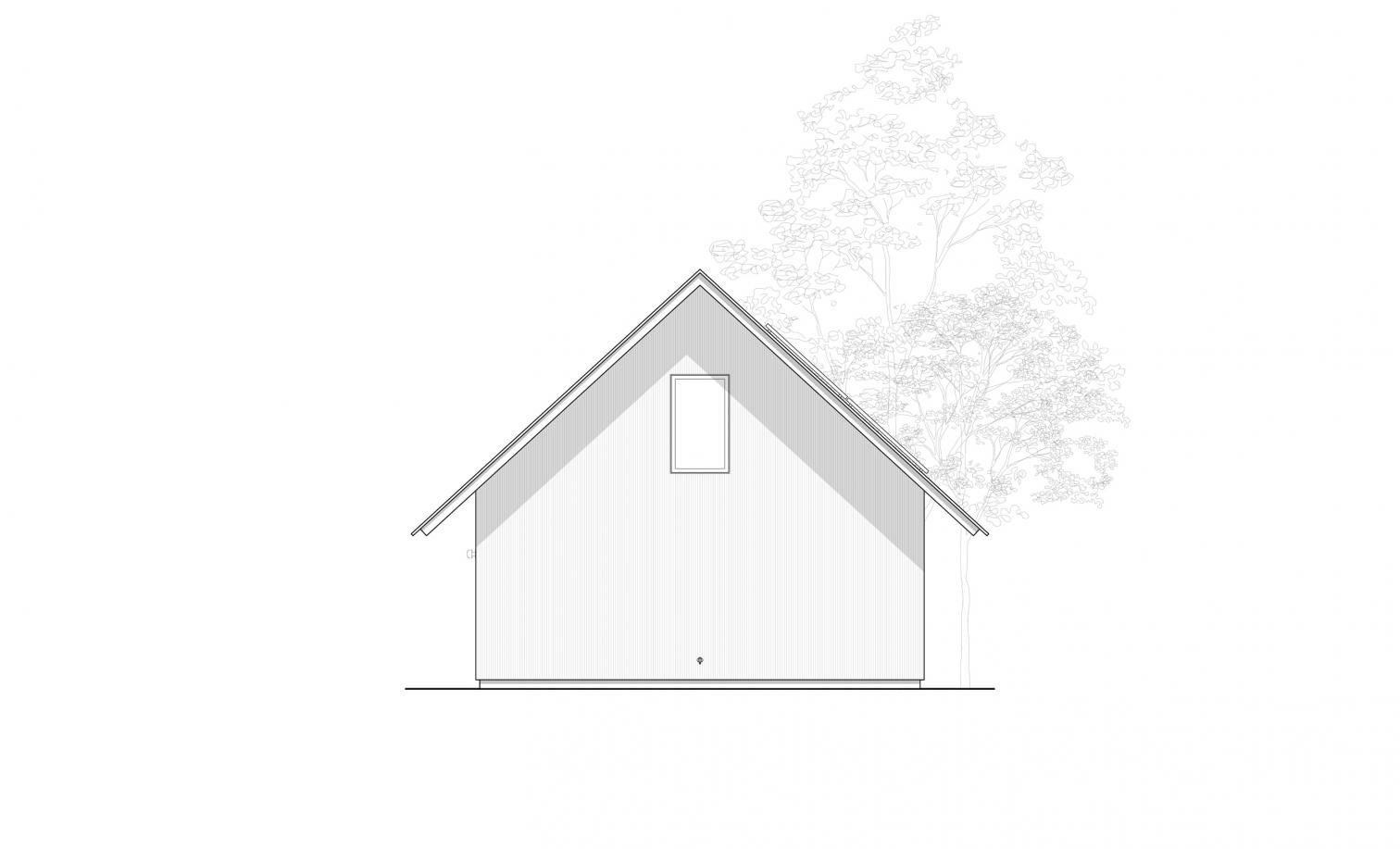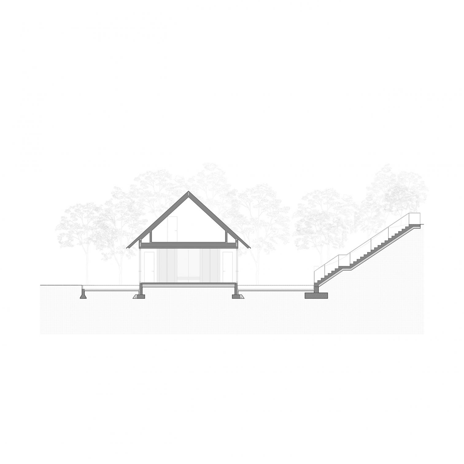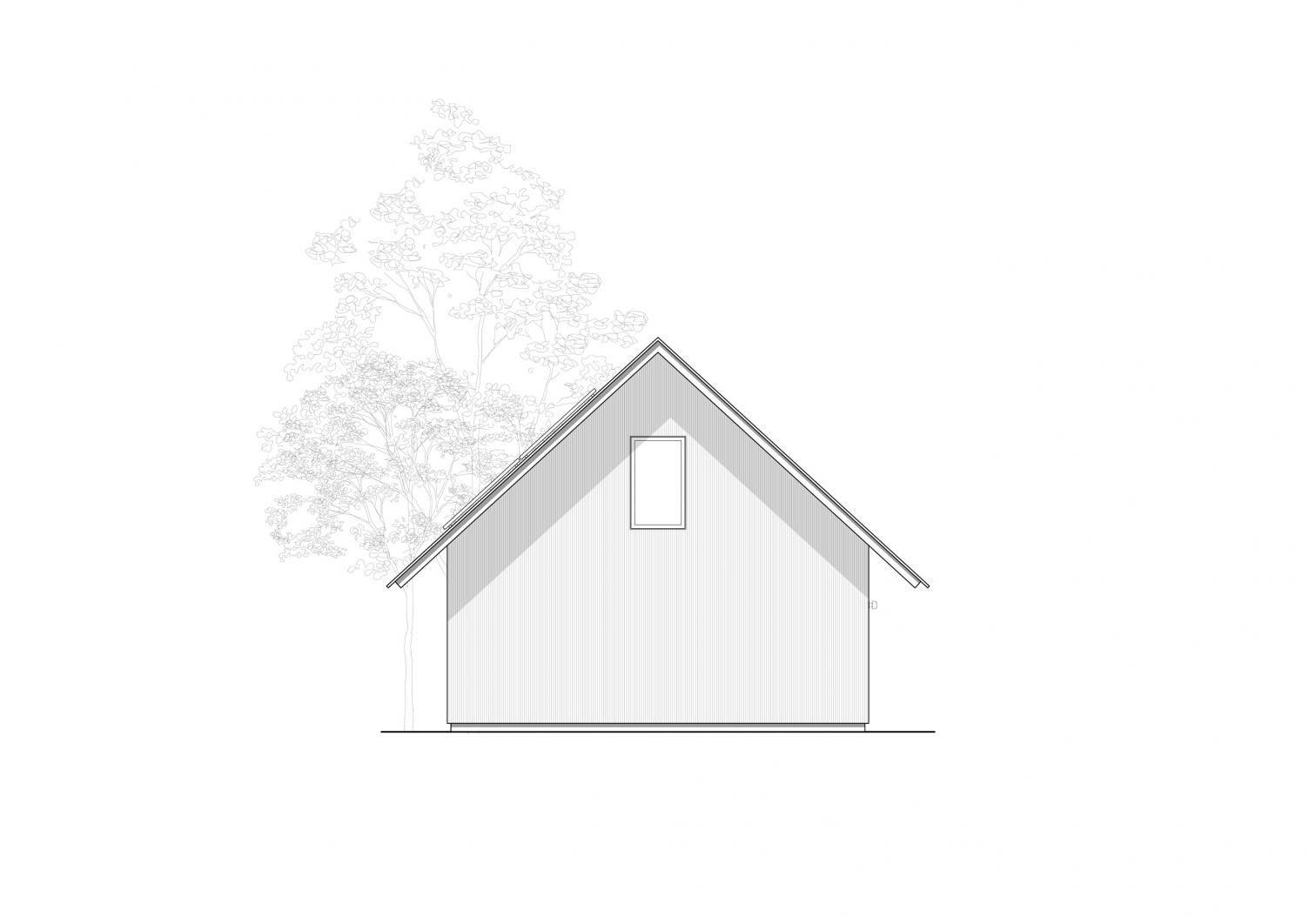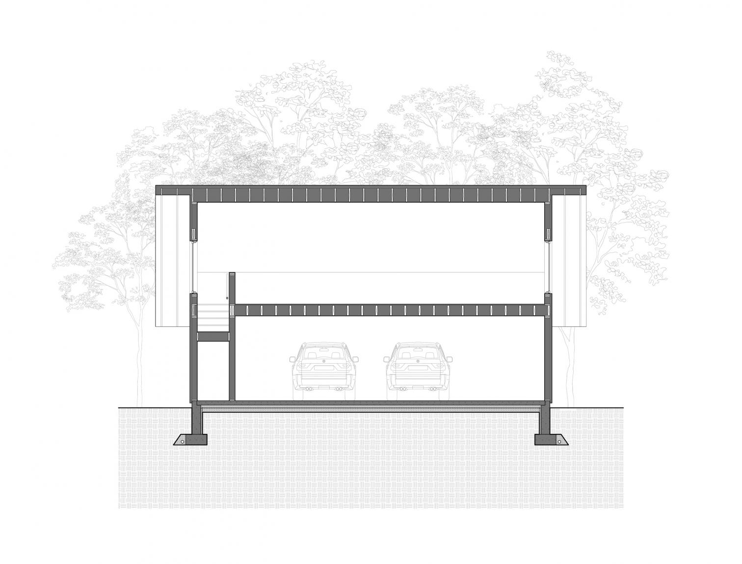 El revestimiento de metal corrugado en color negro otorga coherencia visual al conjunto de formas sencillas. Las cubiertas inclinadas a semejanza de las construcciones agrícolas presentan aleros abiertos que muestran las vigas pintadas en color negro, aportando ritmo al proyecto.