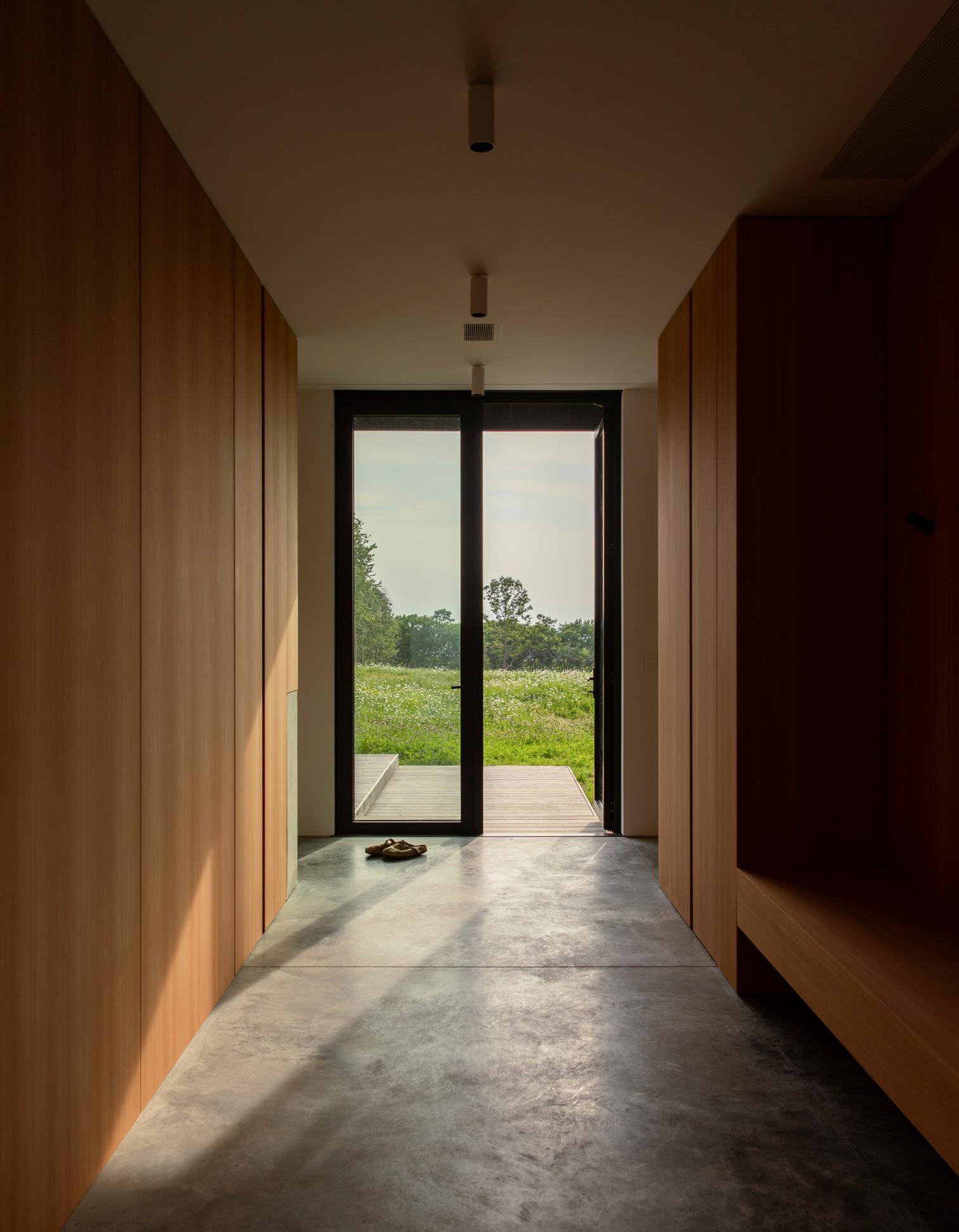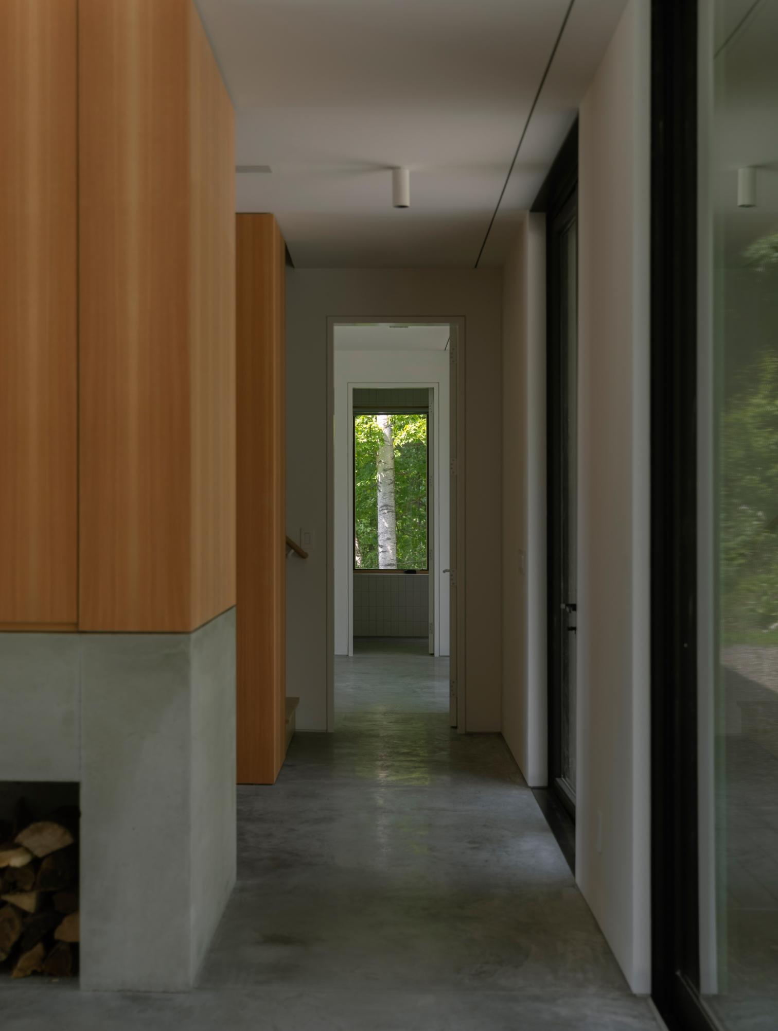El vestíbulo central separa los espacios comunes en el sur de los dormitorios principales en el norte. Cuatro bloques lineales están destinados a funciones específicas: albergar la escalera al ático, enmarcar la chimenea, ofrecer superficies para la cocina y ocultar electrodomésticos. Estos bloques tienen diferentes alturas, proporciones y materiales, combinando madera de abeto y elementos de hormigón.