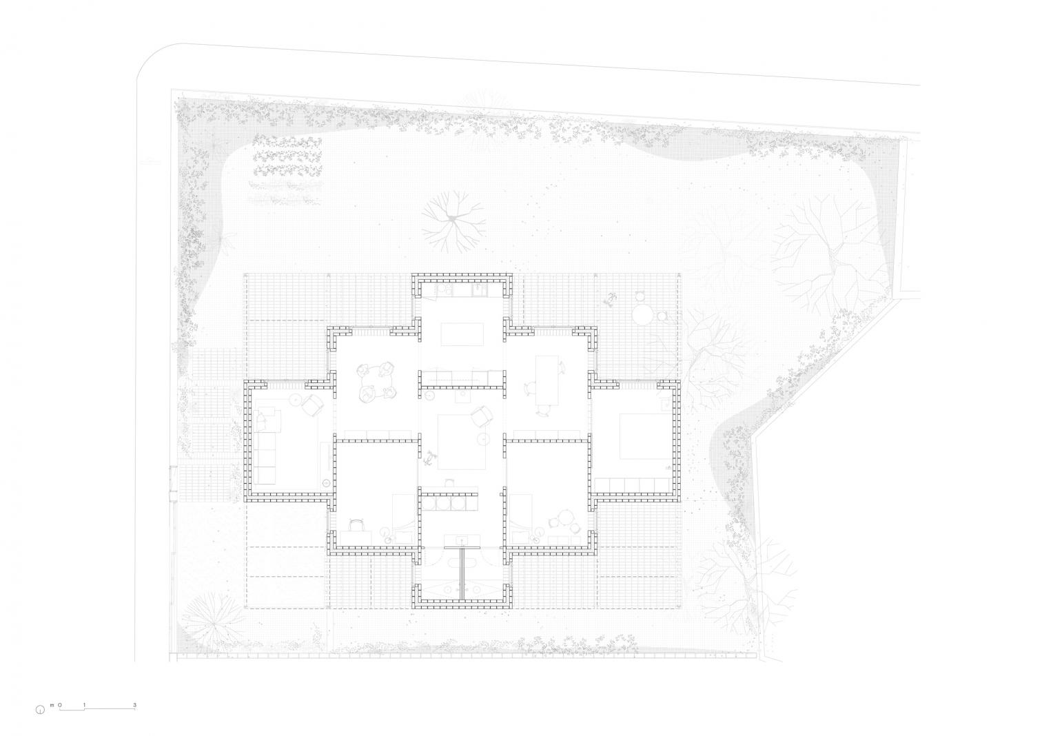 El diseño incluye pérgolas vegetales que prolongan la retícula estructural hacia el exterior, fortaleciendo el vínculo con la naturaleza. En el núcleo del hogar, un módulo central más alto facilita la captación solar en invierno y la ventilación cruzada en verano, favoreciendo un clima interior confortable todo el año.