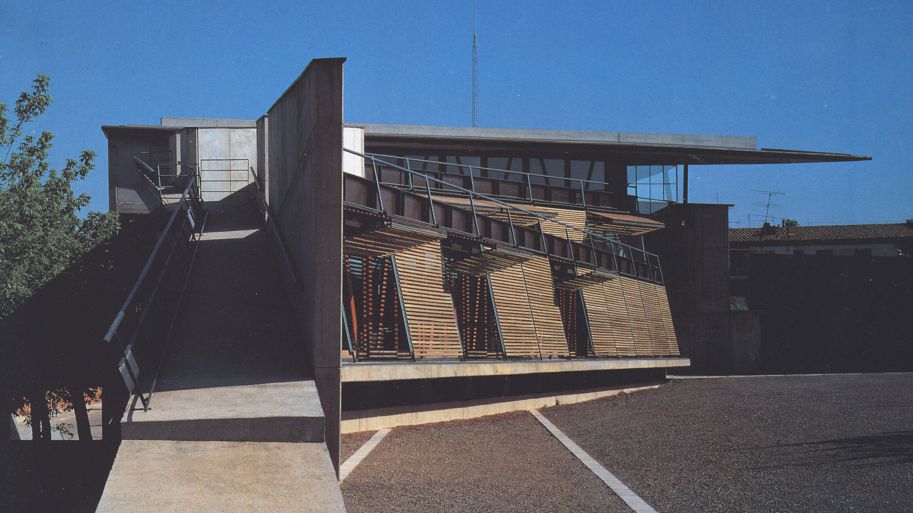 La construcción se ha emplazado en una esquina para abarcar su jardín desde sus terrazas, y para ser vista desde el camino como una rampa de acceso a ellas. Desde el pueblo, en cambio, el edificio se muestra como una sala abierta tras un alto muro. Tres plataformas colgadas en abanico sobre un diedro de muros de hormigón configuran los espacios trapezoidales para lugares de recreo, deportes y juegos. Pero la estructura que se articula en placas horizontales y verticales, su construcción en acero y hormigón y la discontinuidad de la edificación en huecos y lucernarios hacen de este pequeño centro un complejo y sorprendente ejercicio de libertad y también de voluntad, de voluntad optimista…[+]