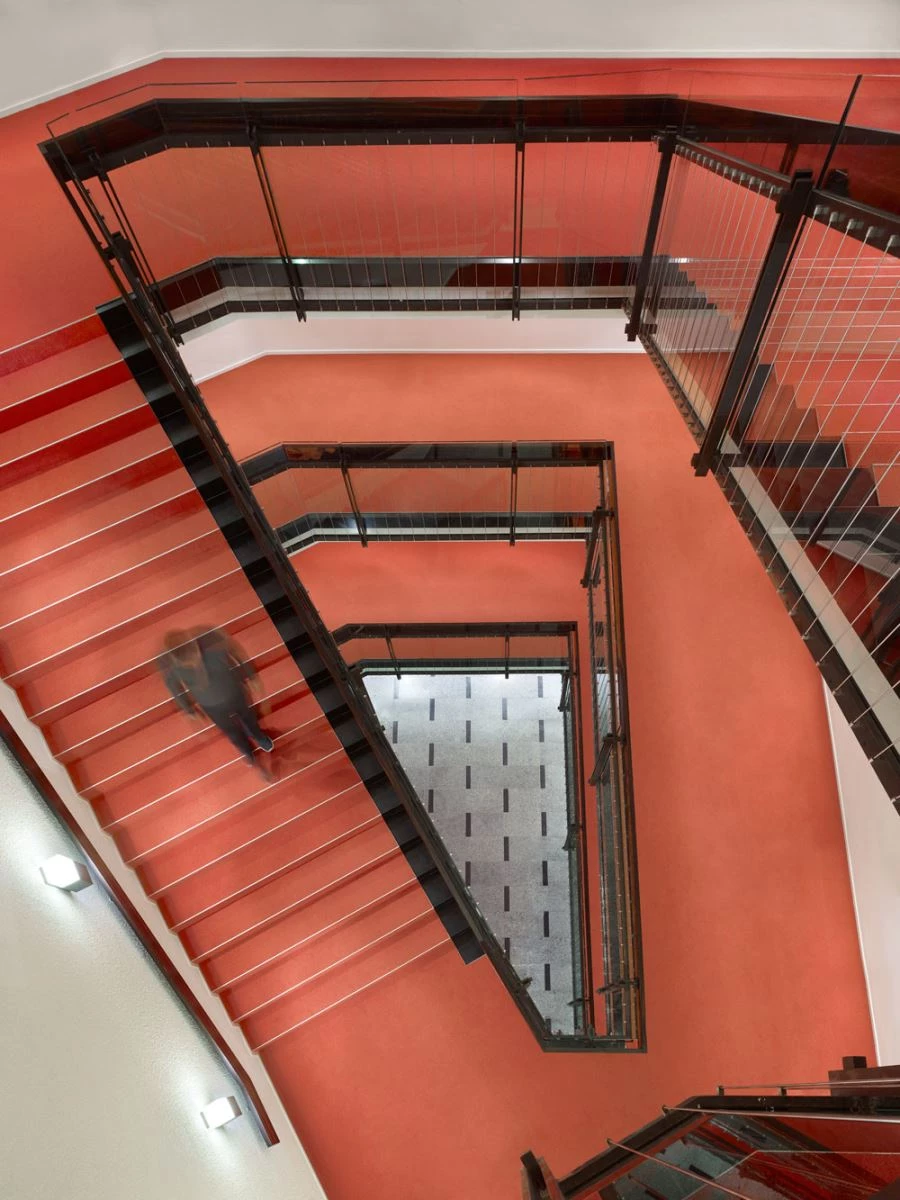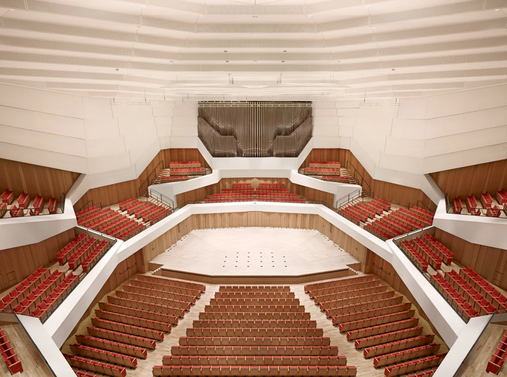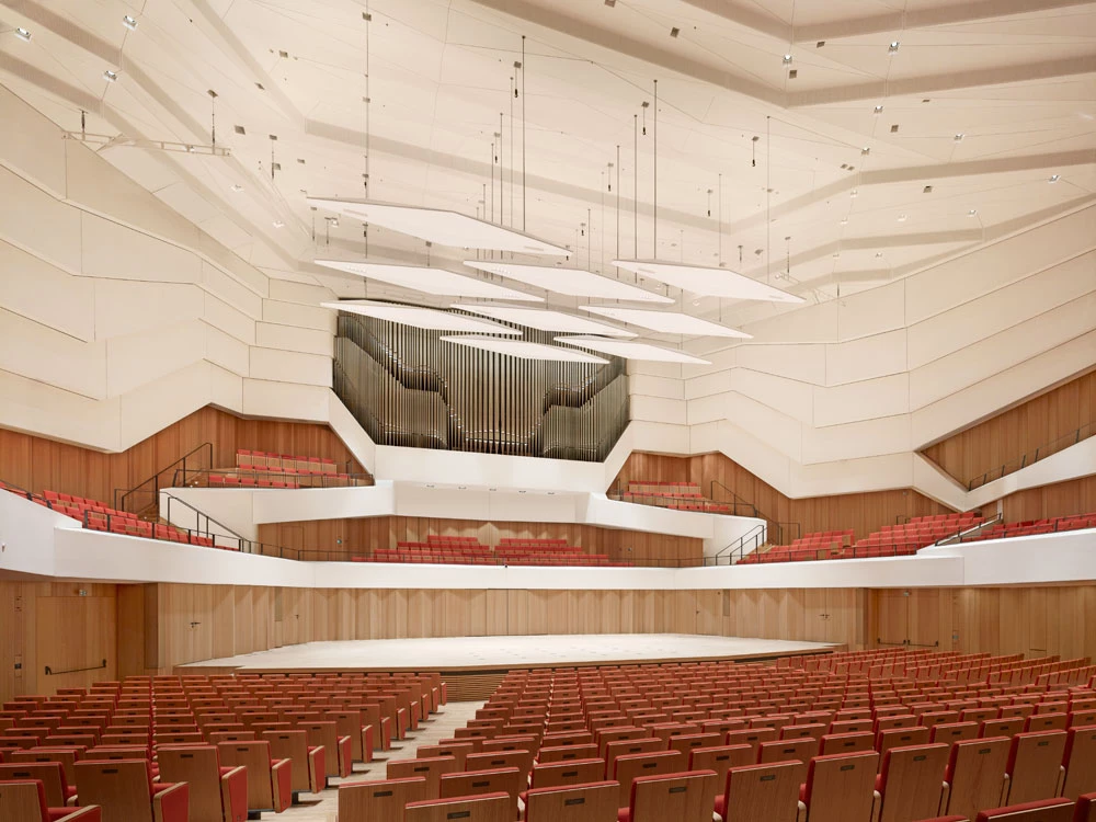 Por otro lado, el nuevo edificio que alberga la biblioteca y la sala de conciertos —con capacidad para 1.800 espectadores— dialoga con la construcción existente, sin imitar sus formas ni contraponiéndose radicalmente a ella. Para ello, se ha prestado especial atención a detalles como el color, los materiales y la geometría, manteniendo el rojo como sello identificativo de la institución.
