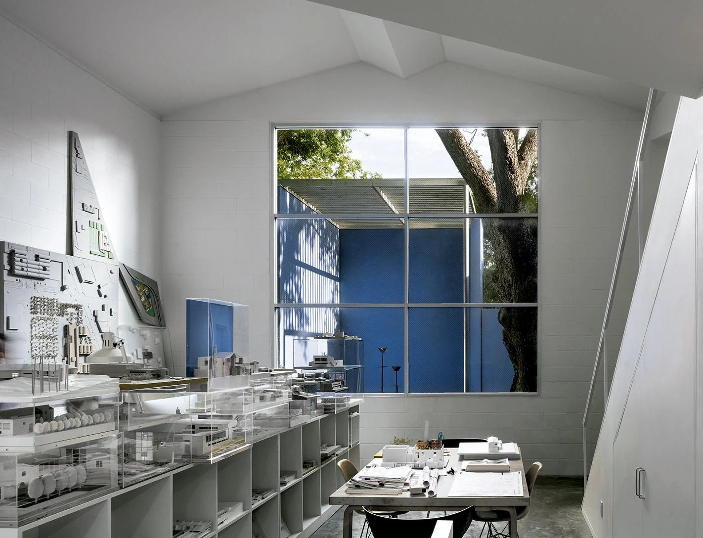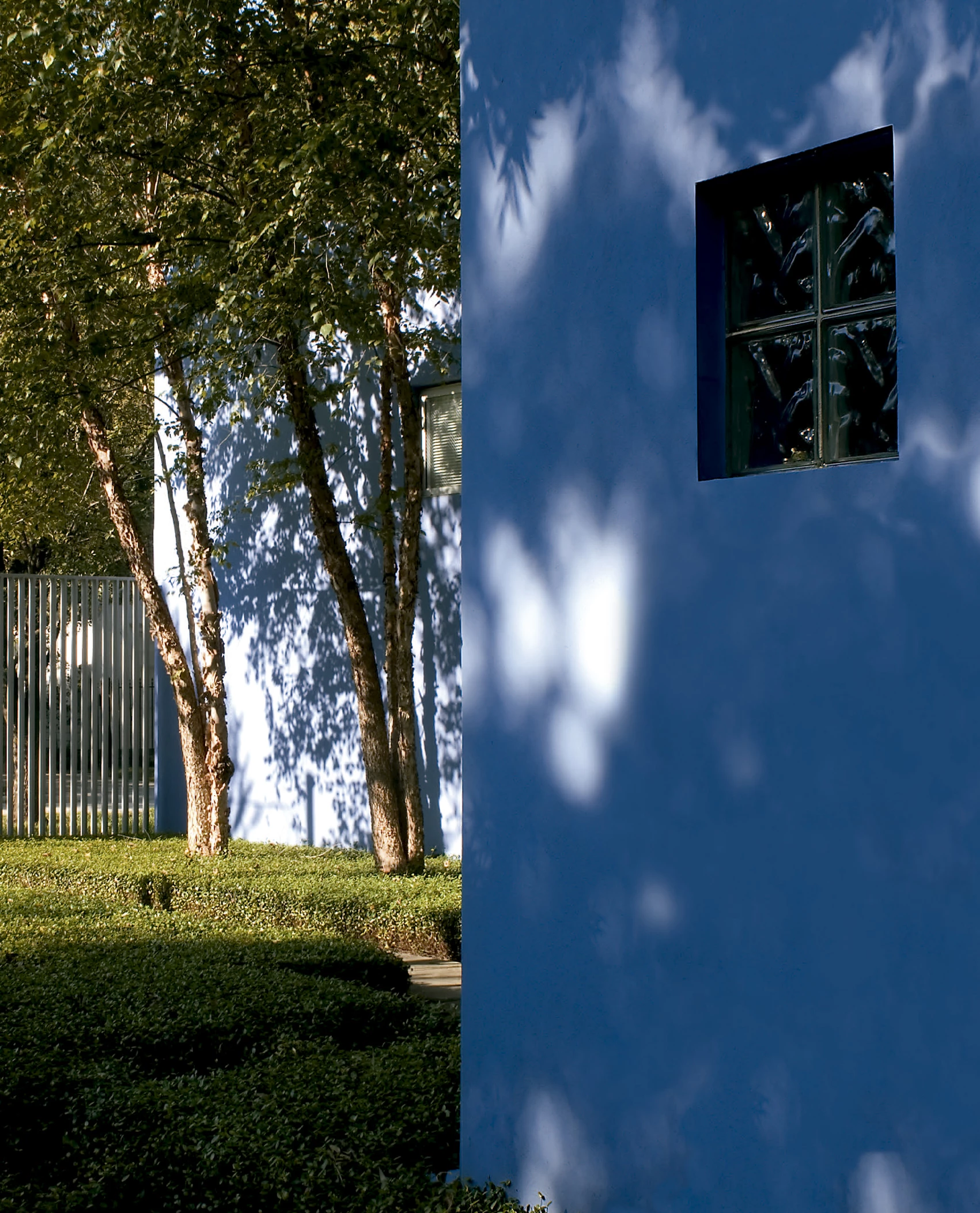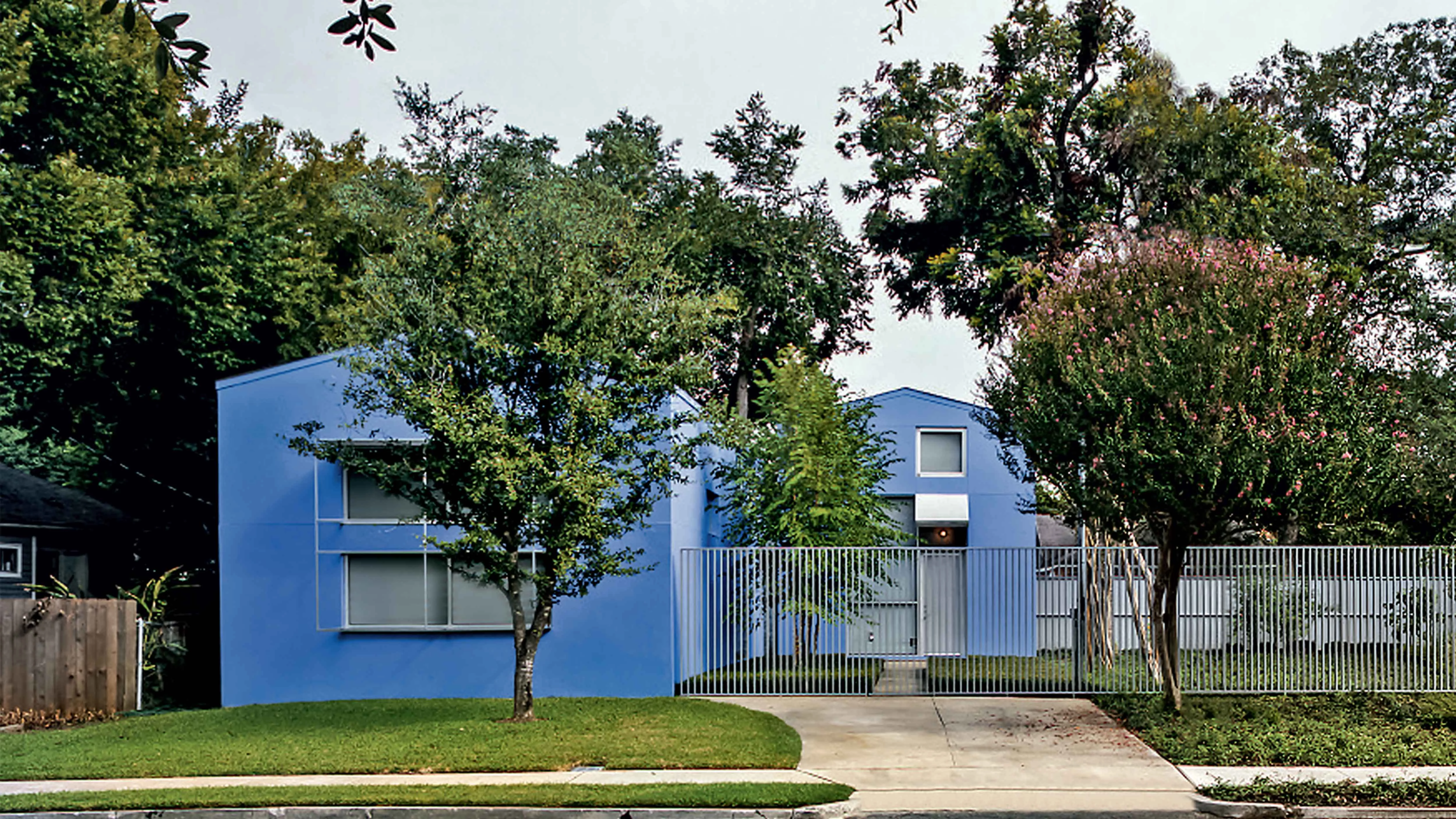 Este trabajo de variación formal y tipológica ha sido posible gracias a la sencilla geometría ortogonal de las piezas, que ha resultado muy versátil en cada una de las etapas de la intervención para responder a las necesidades de la vida, el trabajo y todas las circunstancias asociadas o imprevistas. Construidos con muros de fábrica de bloques de hormigón acabados al exterior con un suave estuco, los edificios están pintados de un intenso azul lavanda que evoca los muchos matices que suele presentar el cielo de Houston. En torno a ellos, delimitando el perímetro del solar, se levanta una valla de acero que acentúa la sensación de privacidad. En el interior de la parcela, el conjunto de piezas se entrelaza con los árboles preexistentes y los recién plantados, y también con los patios y la luz, para enriquecer al cabo las experiencias de la vida cotidiana.