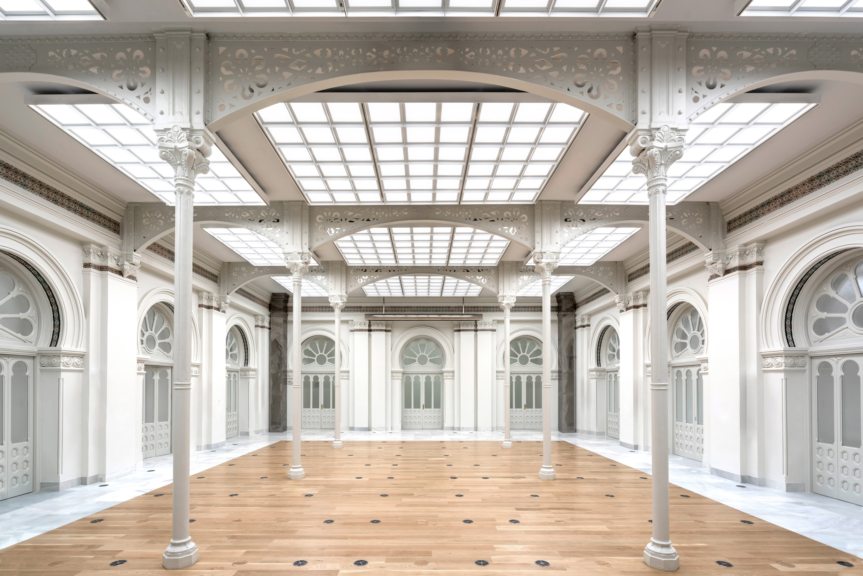 El antiguo techo de pavés, demolido antes de la reforma, ha sido reinterpretado mediante una iluminación artificial que remite al lucernario original y permite descubrir la estructura de hierro roblonado hasta ahora oculta. Cuatro columnas técnicas de acero inoxidable pulido introducen reflejos que prolongan visualmente las cenefas cerámicas y las molduras históricas, reforzando así la continuidad entre pasado y presente en una intervención que conjuga memoria y modernidad.