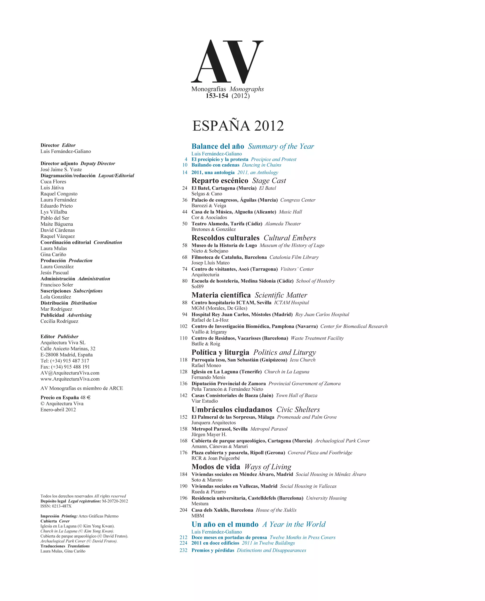 A caballo entre lo viejo y lo nuevo estuvieron muchas de las noticias positivas de un año ominoso que vio sin embargo completarse Madrid-Río, una obra paisajística ejemplar ejecutada por un equipo dirigido por Ginés Garrido; el polémico Metropol Parasol de Jürgen Mayer en Sevilla y el innovador Matadero de Madrid (una adaptación para usos culturales realizada por un grupo de jóvenes arquitectos, entre los cuales Arturo Franco, Churtichaga Quadra-Salcedo, Langarita Navarro, Carnicero, Vila y Virseda o Antón García-Abril), dos ejemplos opuestos de intervención en entornos patrimoniales; o el Museo de Lugo y el Ayuntamiento de Lalín, dos edificios públicos en la Galicia interior que se sumaron a otros logros de sus autores respectivos —Nieto Sobejano y Mansilla Tuñón— en el terreno del diálogo con la historia: la inauguración de la ampliación del Museo de San Telmo en San Sebastián y la obtención del premio FAD por el hotel-restaurante Atrio en el casco antiguo de Cáceres. Y ningún ejemplo mejor de ese diálogo que el Museo de Arte Romano de Rafael Moneo, que celebró sus 25 años mientras en la misma Mérida se terminaban dos obras de arquitectos emergentes que señalan caminos muy divergentes entre sí: el laconismo material del entorno del templo de Diana, de José María Sánchez García, y la policromía en policarbonato de la Factoría Joven, de Selgas Cano, una pareja que culminó también su celebrado Auditorio y Palacio de Congresos El Batel, en Cartagena.