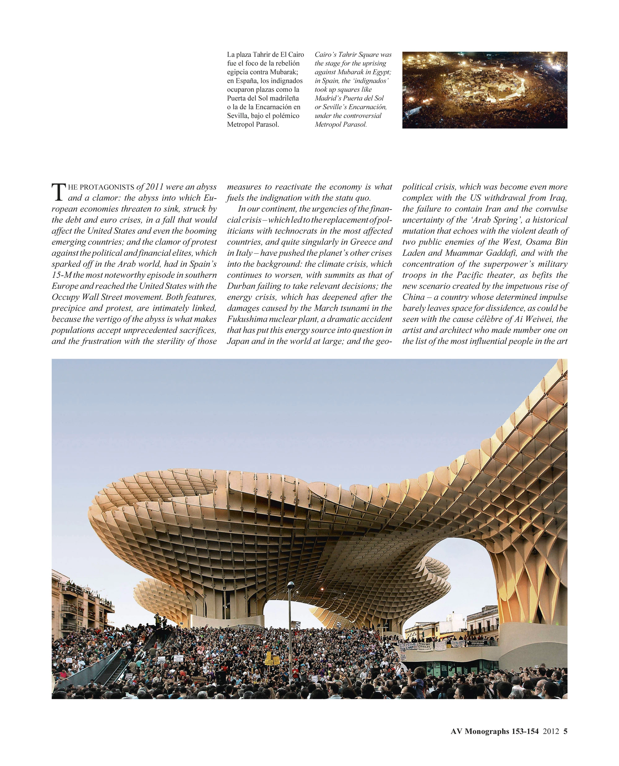 Los protagonistas de 2011 han sido un abismo y un clamor: el abismo en que amenazan con precipitarse las economías europeas, golpeadas por la crisis de la deuda y la moneda común, en una caída que tendría repercusiones en Estados Unidos e incluso en los pujantes países emergentes; y el clamor de protesta contra las élites políticas y financieras, que incendió el mundo árabe, tuvo en el 15-M español el episodio más notorio de la Europa meridional y alcanzó Estados Unidos con la denuncia popular de Wall Street. Ambos rasgos, precipicio y protesta, están además íntimamente vinculados, porque es el vértigo del abismo el que hace aceptar a las poblaciones sacrificios inéditos, y la frustración con la esterilidad de esas medidas para reanimar la economía lo que alimenta la indignación con el statu quo.