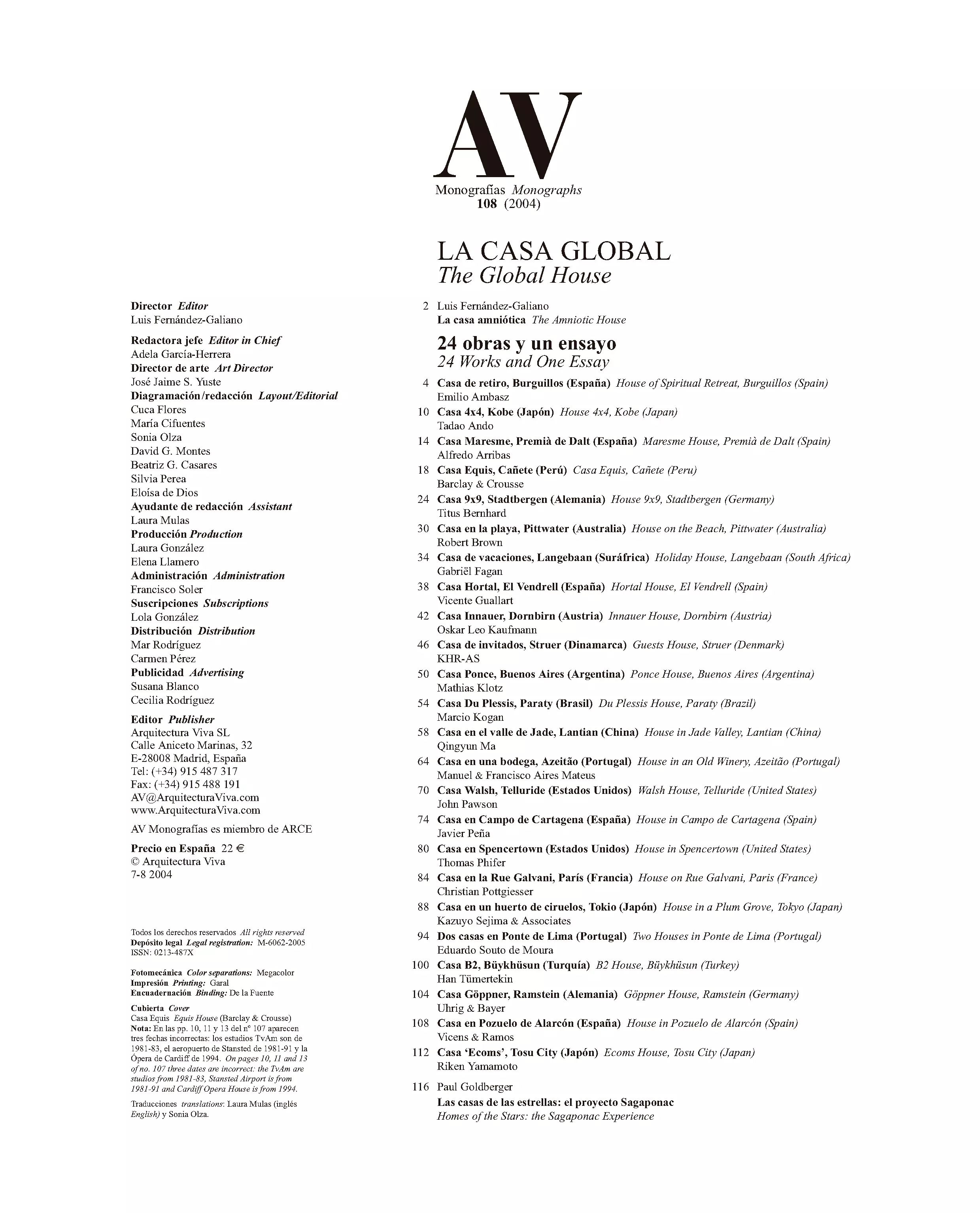 La casa global es la casa amniótica. Flotamos con los ojos cerrados en el líquido salino de la intimidad para protegernos del fragor del mundo, y el proyecto doméstico se perfila como obra del aislamiento ensimismado. Hemos buscado casas en los cinco continentes, y el resultado final de esa exploración planetaria no es tanto un catálogo de materiales y de hábitos —en línea con la antropología resistente del regionalismo climático— como la constatación esperable de que la casa es un laboratorio universal de experimentos técnicos y estéticos. Sin embargo, la variedad amable de figuraciones y ensayos no acierta a ocultar la unidad esencial de este tipo residencial, enhebrado por el blindaje familiar y la expresión individual. Introvertida y singular, la casa del globo es un vientre narcisista donde paradójicamente se clona la diferencia.