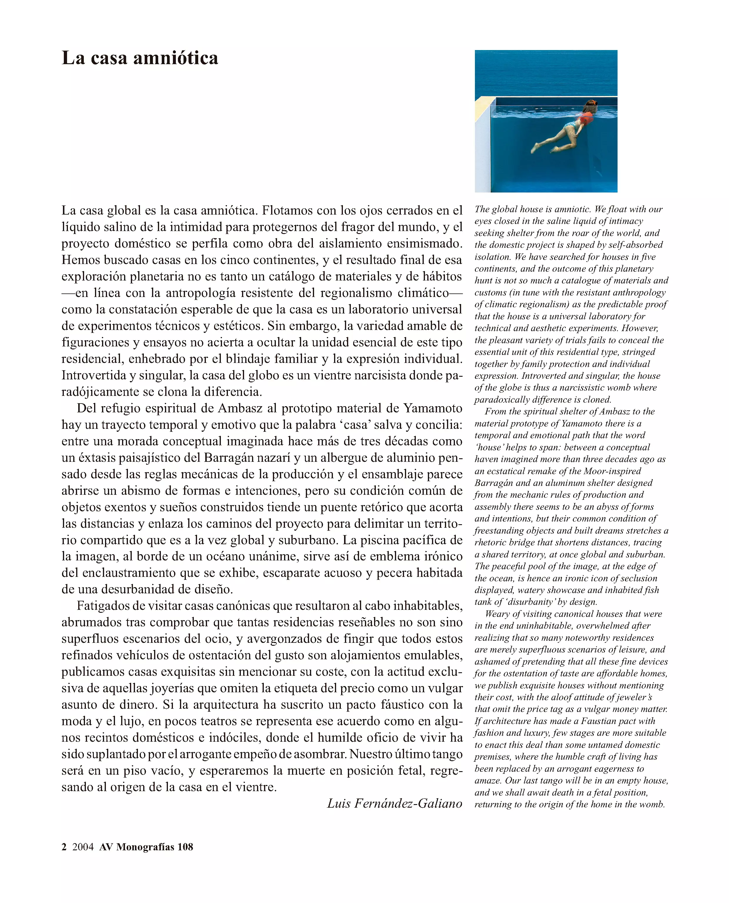 Fatigados de visitar casas canónicas que resultaron al cabo inhabitables, abrumados tras comprobar que tantas residencias reseñables no son sino superfluos escenarios del ocio, y avergonzados de fingir que todos estos refinados vehículos de ostentación del gusto son alojamientos emulables, publicamos casas exquisitas sin mencionar su coste, con la actitud exclusiva de aquellas joyerías que omiten la etiqueta del precio como un vulgar asunto de dinero. Si la arquitectura ha suscrito un pacto fáustico con la moda y el lujo, en pocos teatros se representa ese acuerdo como en algunos recintos domésticos e indóciles, donde el humilde oficio de vivir ha sido suplantado por el arrogante empeño de asombrar. Nuestro último tango será en un piso vacío, y esperaremos la muerte en posición fetal, regresando al origen de la casa en el vientre.