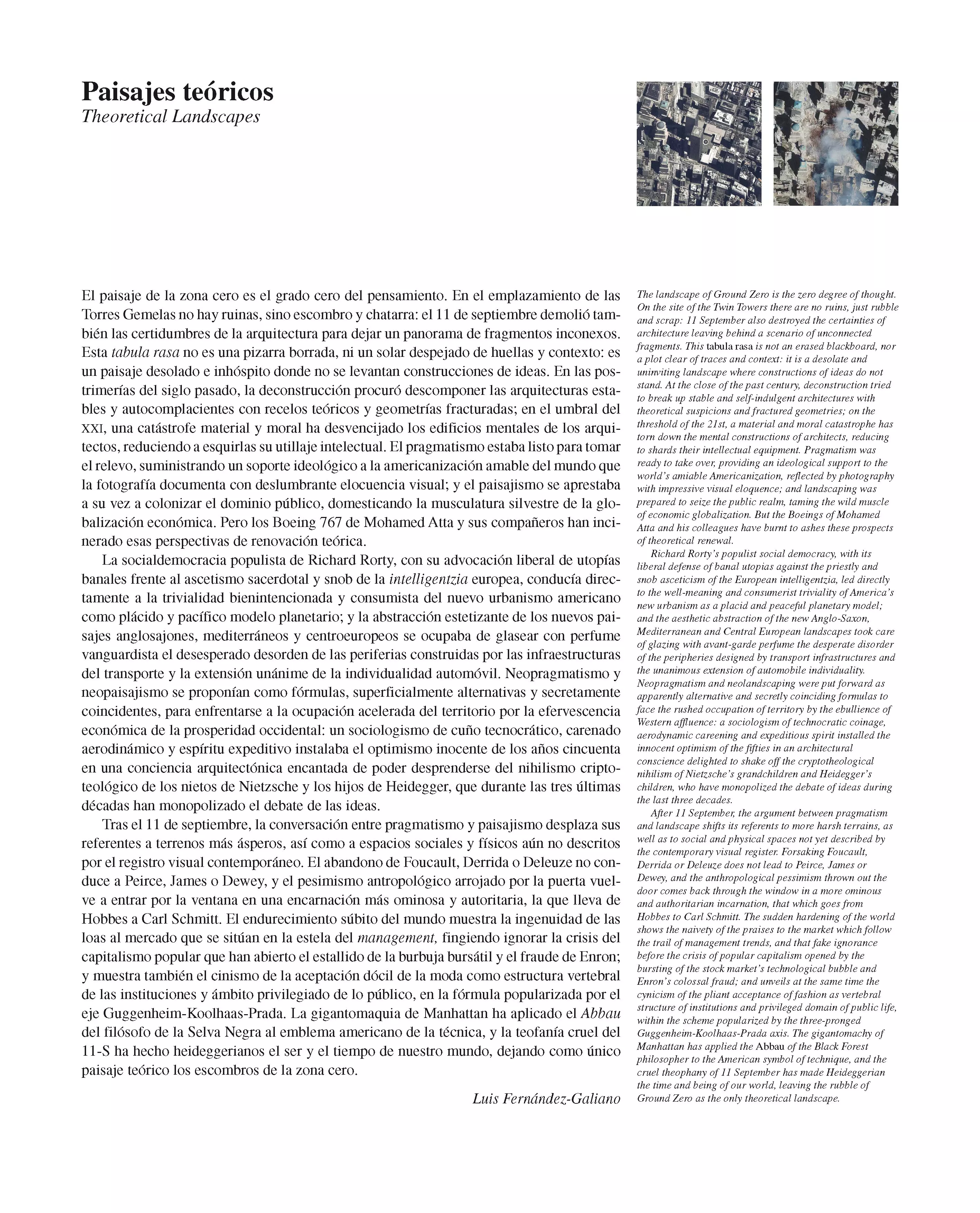 El paisaje de la zona cero es el grado cero del pensamiento. En el emplazamiento de las Torres Gemelas no hay ruinas, sino escombro y chatarra: el 11 de septiembre demolió también las certidumbres de la arquitectura para dejar un panorama de fragment