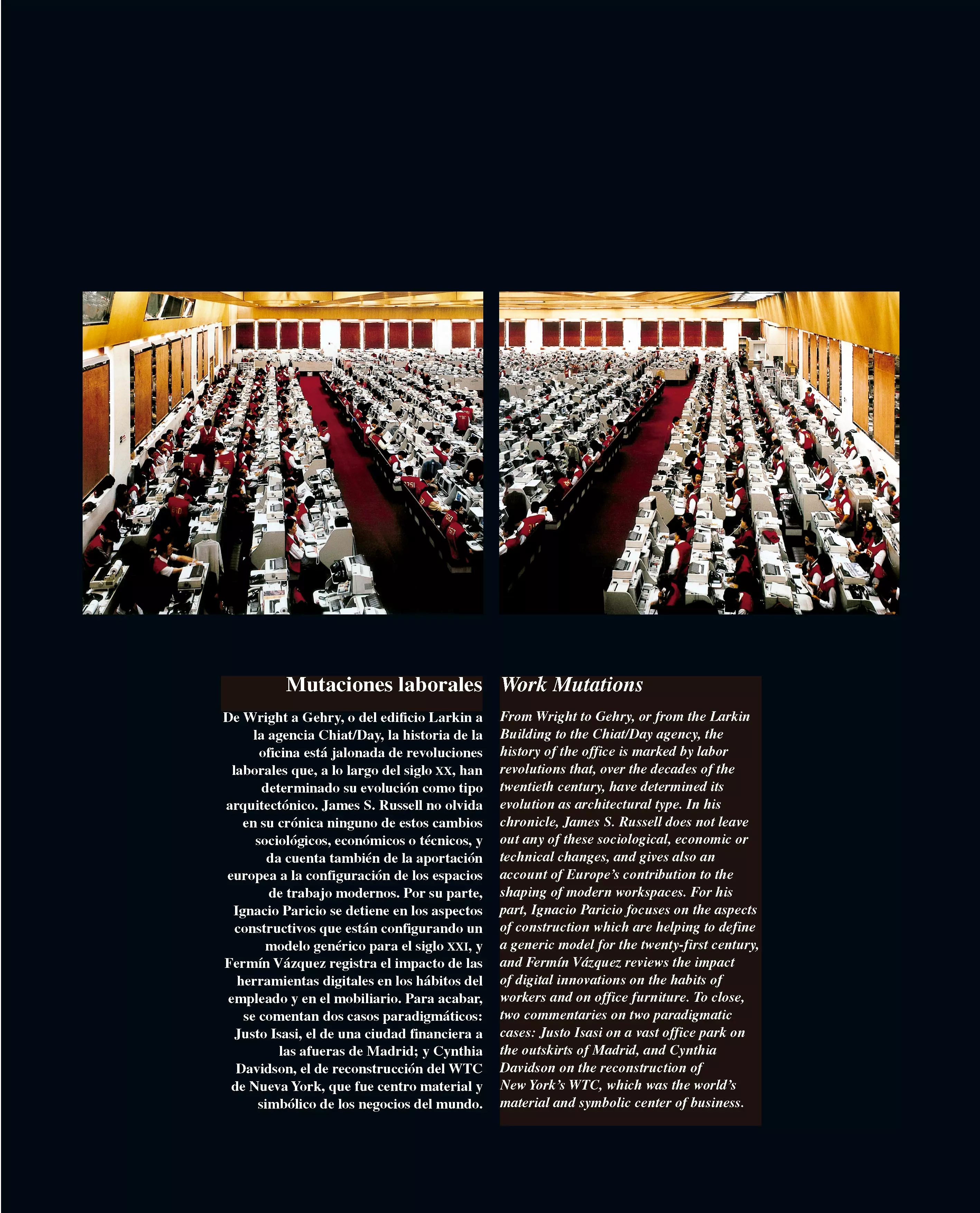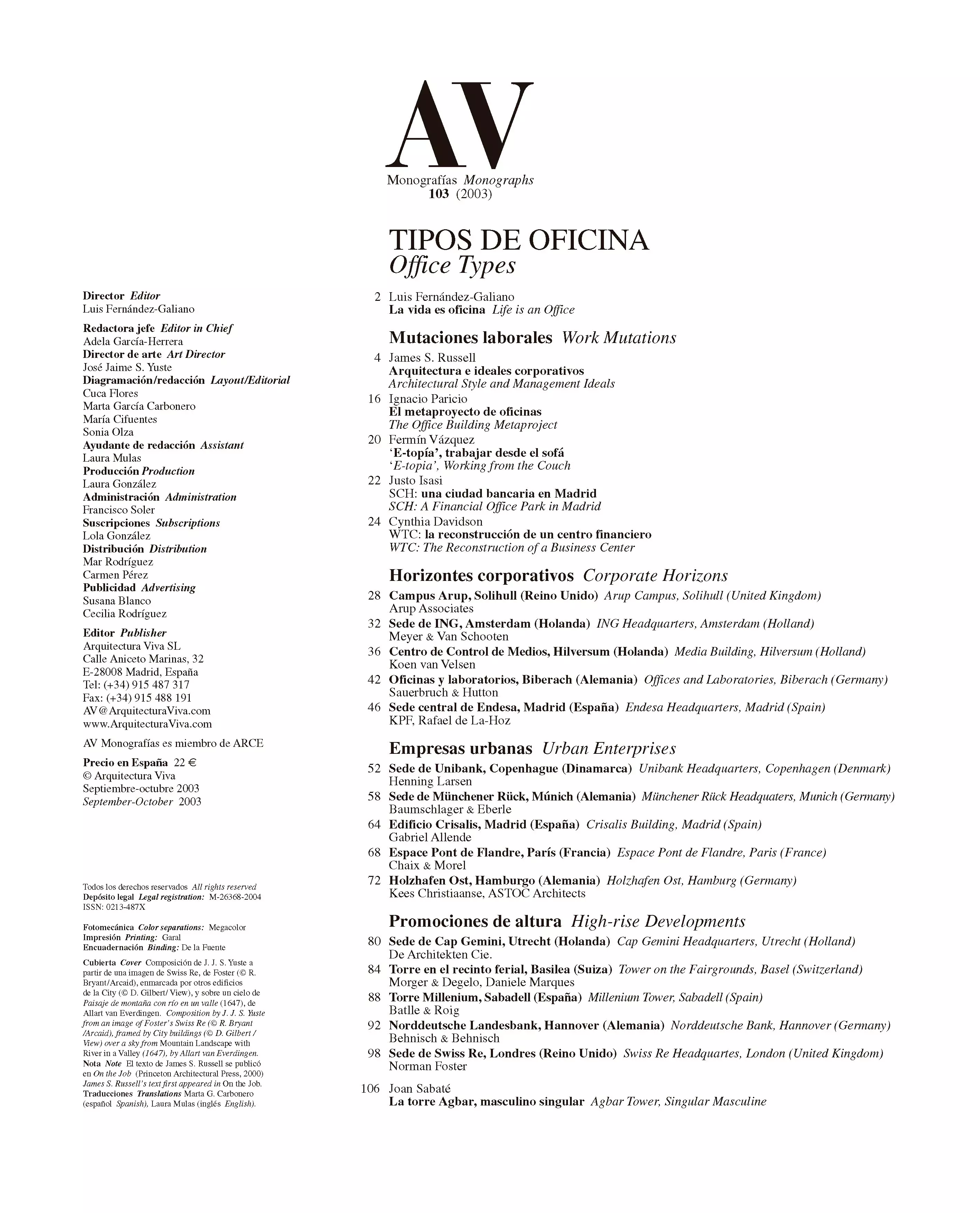 Paradójicamente, la uniformidad del espacio administrativo se ha hecho coexistir con la heterogeneidad de los envases, que han puesto sus medios estilísticos al servicio de la diferenciación empresarial, reduciendo la arquitectura a un instrumento de la comunicación y el marketing. Mientras tanto, el principal dilema de las corporaciones sigue formulándose entre el rascacielos urbano y el rascasuelos periférico, y en esa elección pesan tanto los factores de accesibilidad y seguridad como los propiamente ideológicos y simbólicos: hay parques de oficinas concebidos como ciudades de vacaciones y otros semejantes a ciudadelas militares; hay rascacielos socialdemócratas que colocan en su cúspide el ocio de los empleados, y rascacielos neoliberales coronados por despachos de plutócratas. Sin embargo, todos se contraponen al tejido fértil y flexible de las oficinas pequeñas y medianas que mezcladas con comercios y viviendas hacen de la ciudad un organismo vivo: en este tapiz emprendedor y resistente se ocultan las mejores oficinas, núcleos de innovación y experimento que hacen más soportable el testarudo oficio de vivir.