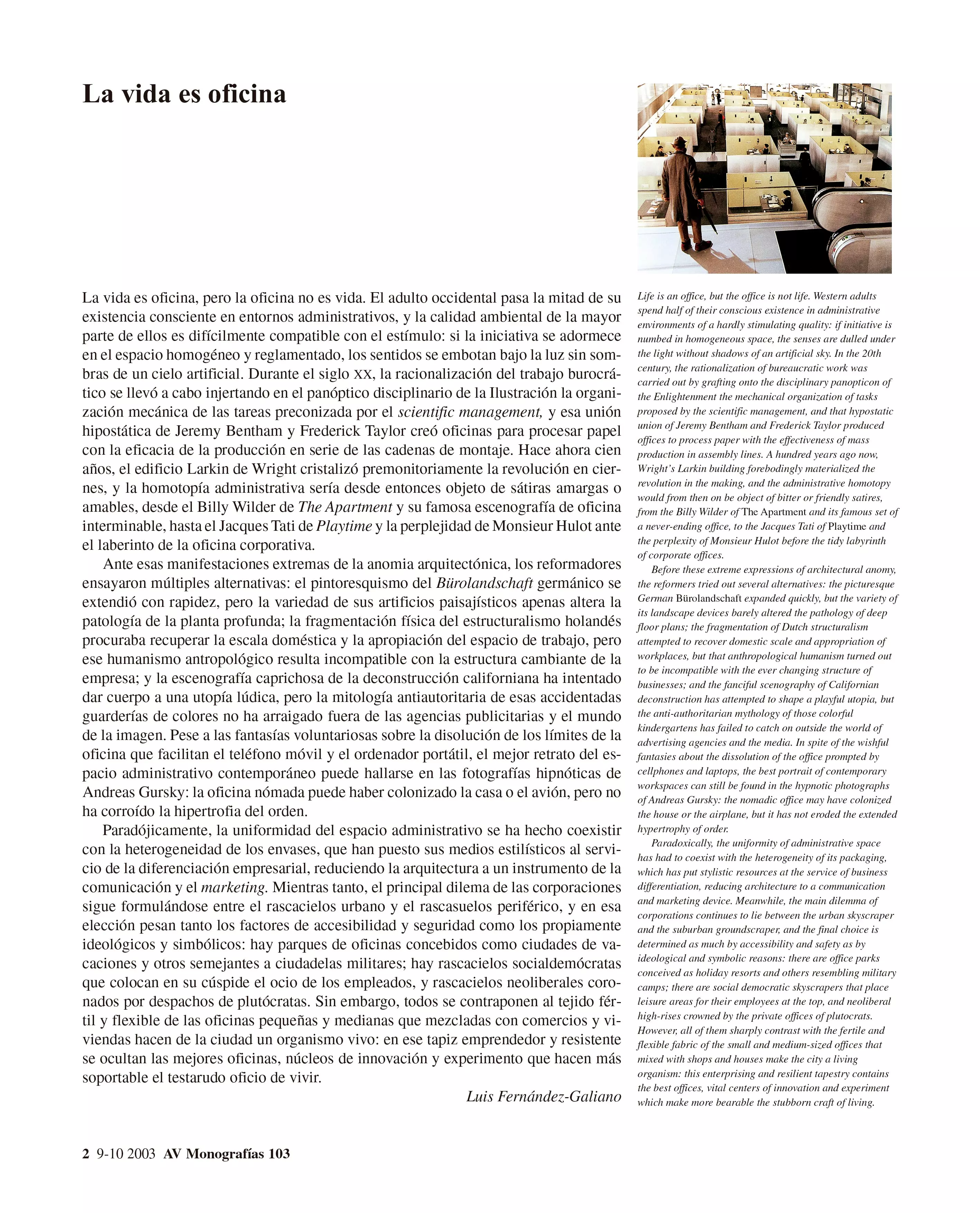 La vida es oficina, pero la oficina no es vida. El adulto occidental pasa la mitad de su existencia consciente en entornos administrativos, y la calidad ambiental de la mayor parte de ellos es difícilmente compatible con el estímulo: si la iniciativa se adormece en el espacio homogéneo y reglamentado, los sentidos se embotan bajo la luz sin sombras de un cielo artificial. Durante el siglo xx, la racionalización del trabajo burocrático se llevó a cabo injertando en el panóptico disciplinario de la Ilustración la organización mecánica de las tareas preconizada por el scientific management, y esa unión hipostática de Jeremy Bentham y Frederick Taylor creó oficinas para procesar papel con la eficacia de la producción en serie de las cadenas de montaje. Hace ahora cien años, el edificio Larkin de Wright cristalizó premonitoriamente la revolución en ciernes, y la homotopía administrativa sería desde entonces objeto de sátiras amargas o amables, desde el Billy Wilder de The Apartment y su famosa escenografía de oficina interminable, hasta el Jacques Tati de Playtime y la perplejidad de Monsieur Hulot ante el laberinto de la oficina corporativa.
