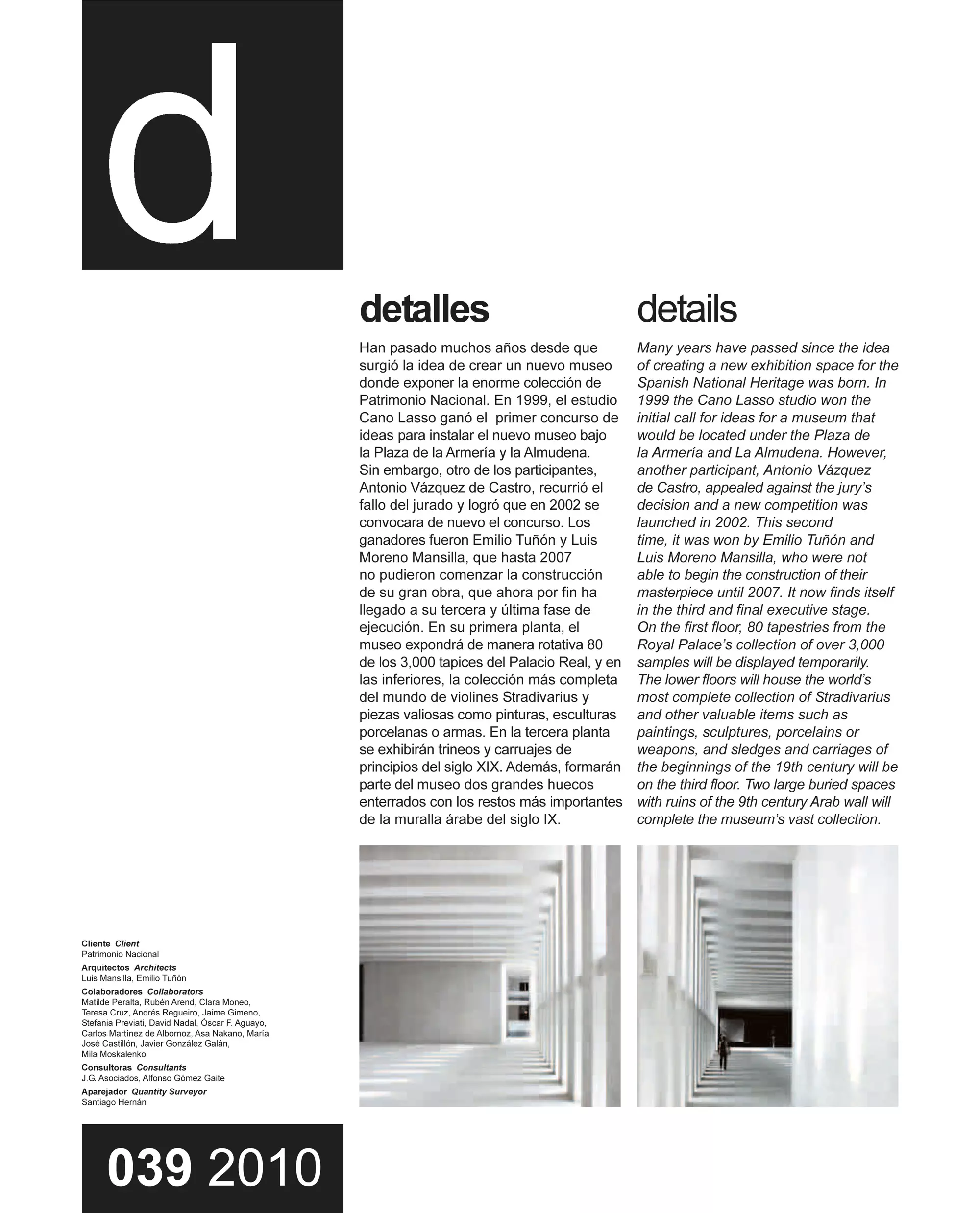 Arquitecto: (Museo) /Moreno Mansilla, Luis; Tuñón, Emilio (primer premio) / Cruz, Antonio; Ortiz, Antonio /Zaera, Alejandro; Moussavi, Farshid - FOA (Foreign Office Architects) / Hadid, Zaha; Schumacher, Patrik / Holl, Steven / Ito, Toyo / Nieto, Fuensanta; Sobejano, Enrique / García de Paredes, Ángela; García Pedrosa, Ignacio / Perrault, Dominique / Rogers, Richard; Vidal, Luis (Victoria & Albert) Fobert, Jamie / Fretton, Tony / Heneghan Peng / Levete, Amanda / Mangado, Francisco / Koolhaas, Rem - OMA / Snøhetta / Sutherland Hussey