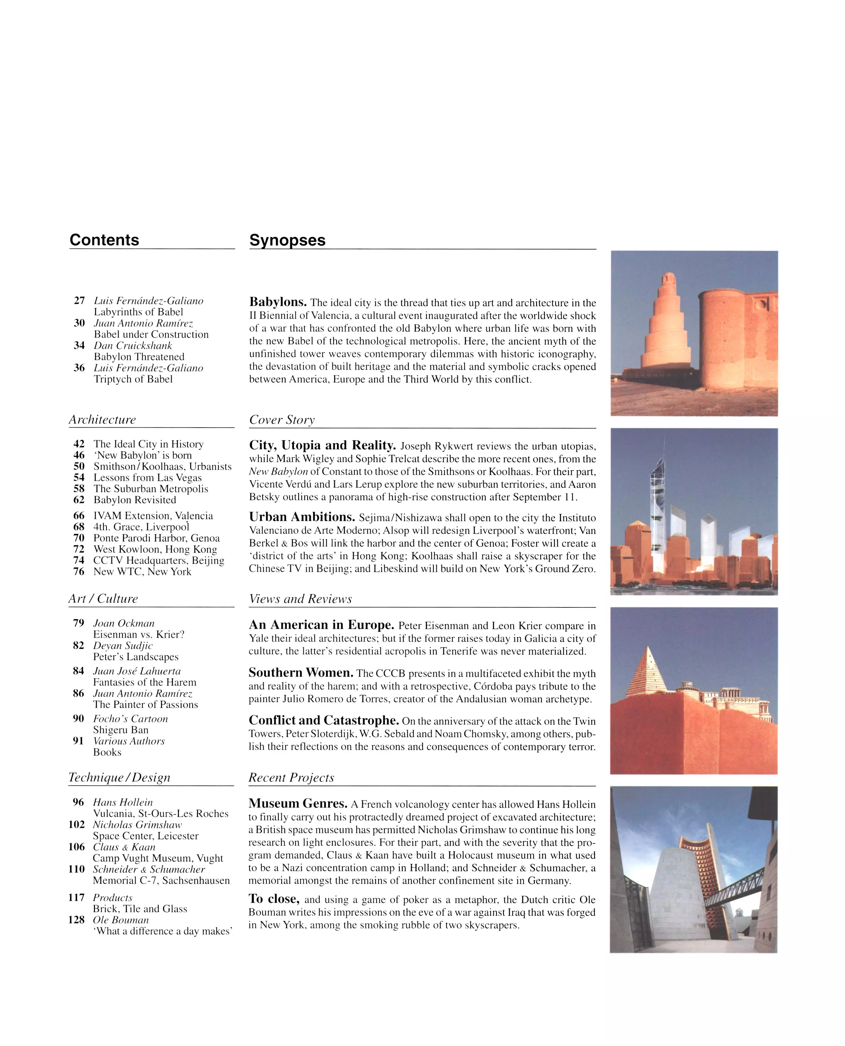 Ciudad, utopía y realidad. Joseph Rykwert revisa las utopías urbanas, mientras Mark Wigley y Sophie Trelcat describen las más recientes, de la NuevaBabilonia de Constant a las de los Smithson o Koolhaas. Por su parte, Vicente Verdú y Lars Lerup exploran los nuevos territorios suburbanos, y Aaron Betsky traza un panorama de la construcción en altura desde el 11 de septiembre.