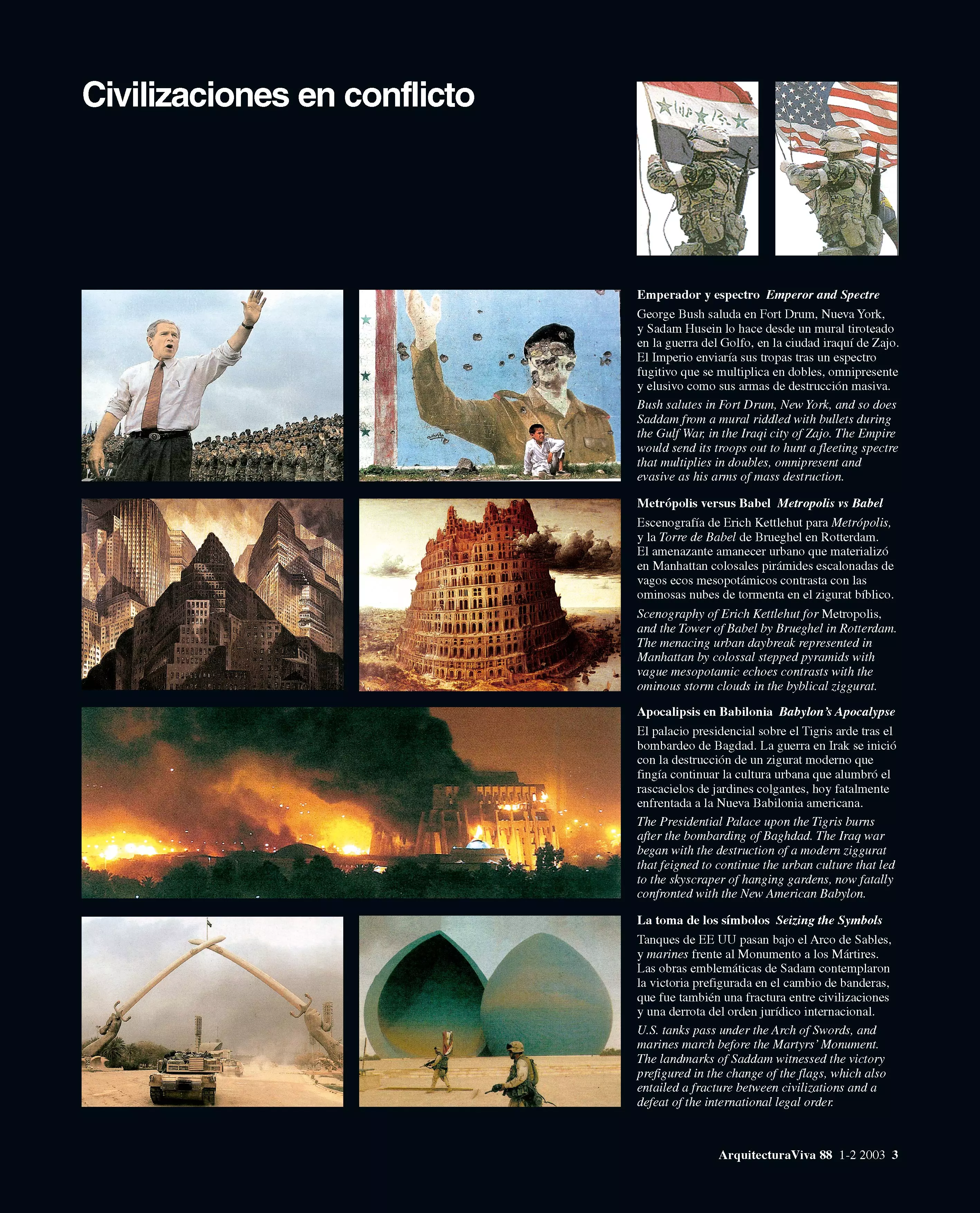 George Bush saluda en Fort Drum, Nueva York, y Sadam Husein lo hace desde un mural tiroteado en la guerra del Golfo, en la ciudad iraquí de Zajo. El Imperio enviaría sus tropas tras un espectro fugitivo que se multiplica en dobles, omnipresente y elusivo como sus armas de destrucción masiva.