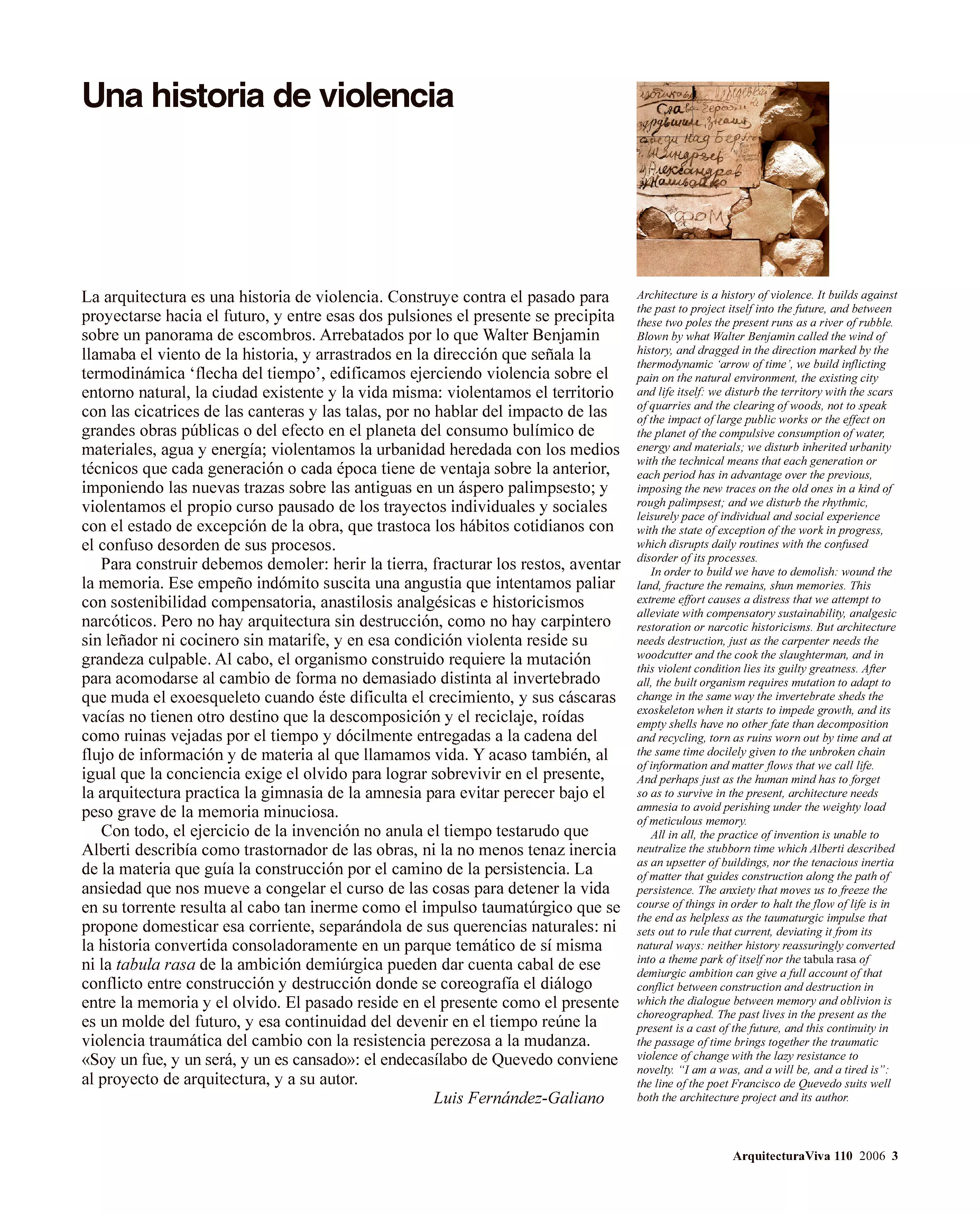 La arquitectura es una historia de violencia. Construye contra el pasado para proyectarse hacia el futuro, y entre esas dos pulsiones el presente se precipita sobre un panorama de escombros. Arrebatados por lo que Walter Benjamin llamaba el viento de la historia, y arrastrados en la dirección que señala la termodinámica ‘flecha del tiempo’, edificamos ejerciendo violencia sobre el entorno natural, la ciudad existente y la vida misma: violentamos el territorio con las cicatrices de las canteras y las talas, por no hablar del impacto de las grandes obras públicas o del efecto en el planeta del consumo bulímico de materiales, agua y energía; violentamos la urbanidad heredada con los medios técnicos que cada generación o cada época tiene de ventaja sobre la anterior, imponiendo las nuevas trazas sobre las antiguas en un áspero palimpsesto; y violentamos el propio curso pausado de los trayectos individuales y sociales con el estado de excepción de la obra, que trastoca los hábitos cotidianos con el confuso desorden de sus procesos.