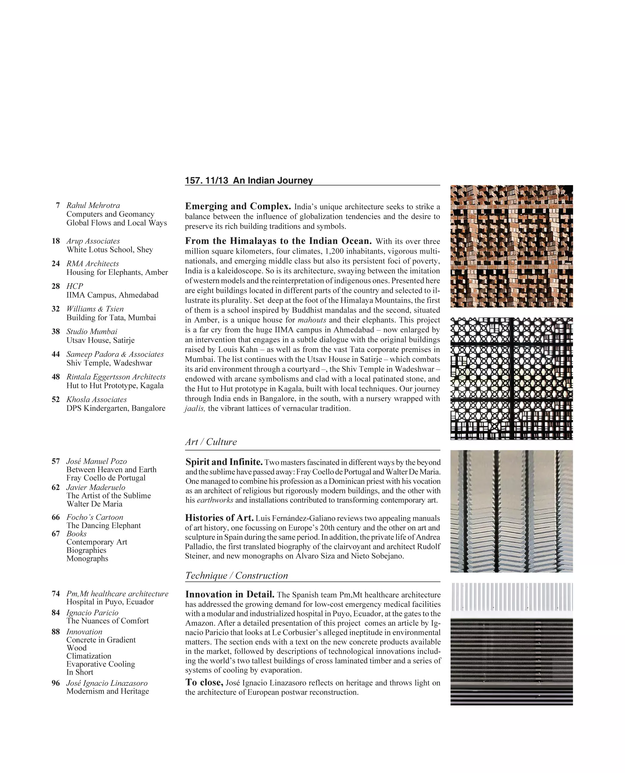 La India no es un país: es un continente. Es imposible aprehender su diversidad de manera cabal, así que aquí nos aproximamos a su arquitectura a través de un rosario de ejemplos que se extienden desde el Himalaya hasta su extremo meridional. Como ex