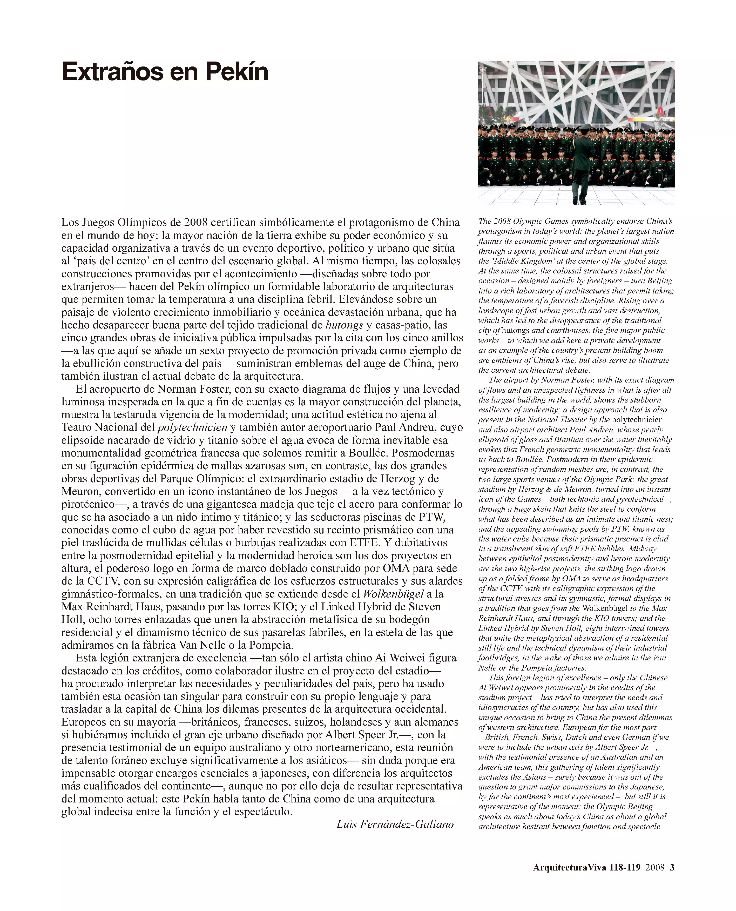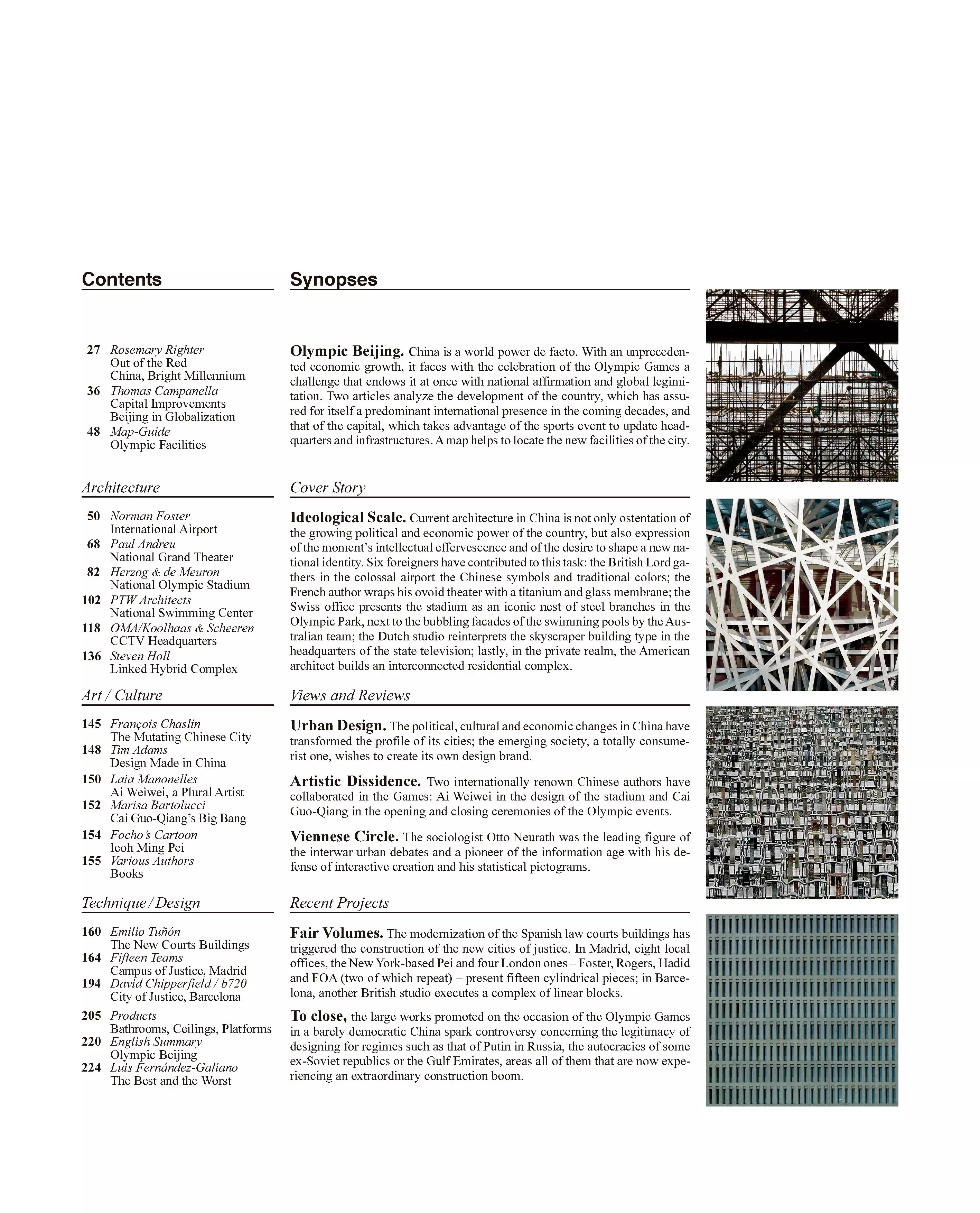 Los Juegos Olímpicos de 2008 certifican simbólicamente el protagonismo de China en el mundo de hoy: la mayor nación de la tierra exhibe su poder económico y su capacidad organizativa a través de un evento deportivo, político y urbano que sitúa al ‘país del centro’ en el centro del escenario global. Al mismo tiempo, las colosales construcciones promovidas por el acontecimiento —diseñadas sobre todo por extranjeros— hacen del Pekín olímpico un formidable laboratorio de arquitecturas que permiten tomar la temperatura a una disciplina febril. Elevándose sobre un paisaje de violento crecimiento inmobiliario y oceánica devastación urbana, que ha hecho desaparecer buena parte del tejido tradicional de hutongs y casas-patio, las cinco grandes obras de iniciativa pública impulsadas por la cita con los cinco anillos —a las que aquí se añade un sexto proyecto de promoción privada como ejemplo de la ebullición constructiva del país— suministran emblemas del auge de China, pero también ilustran el actual debate de la arquitectura.