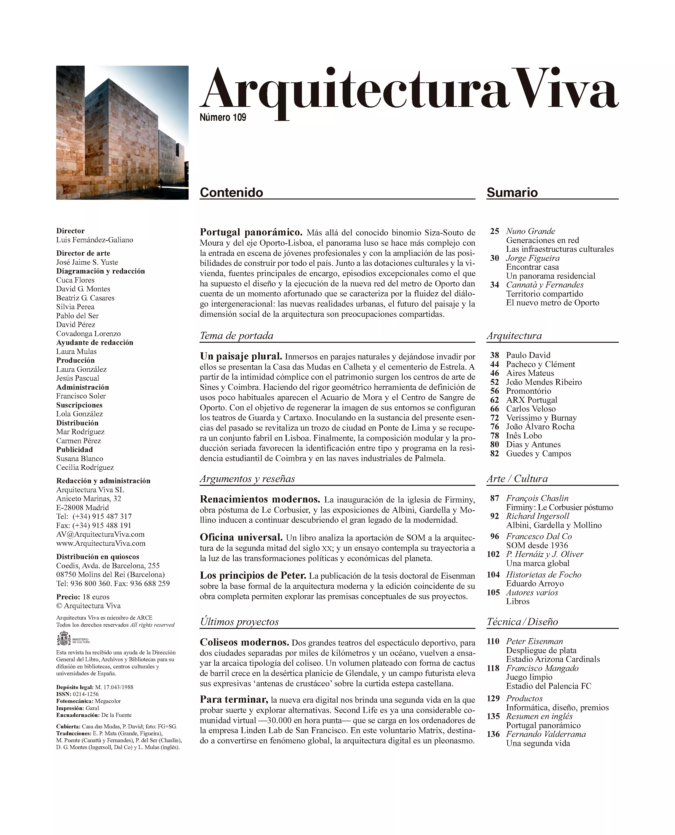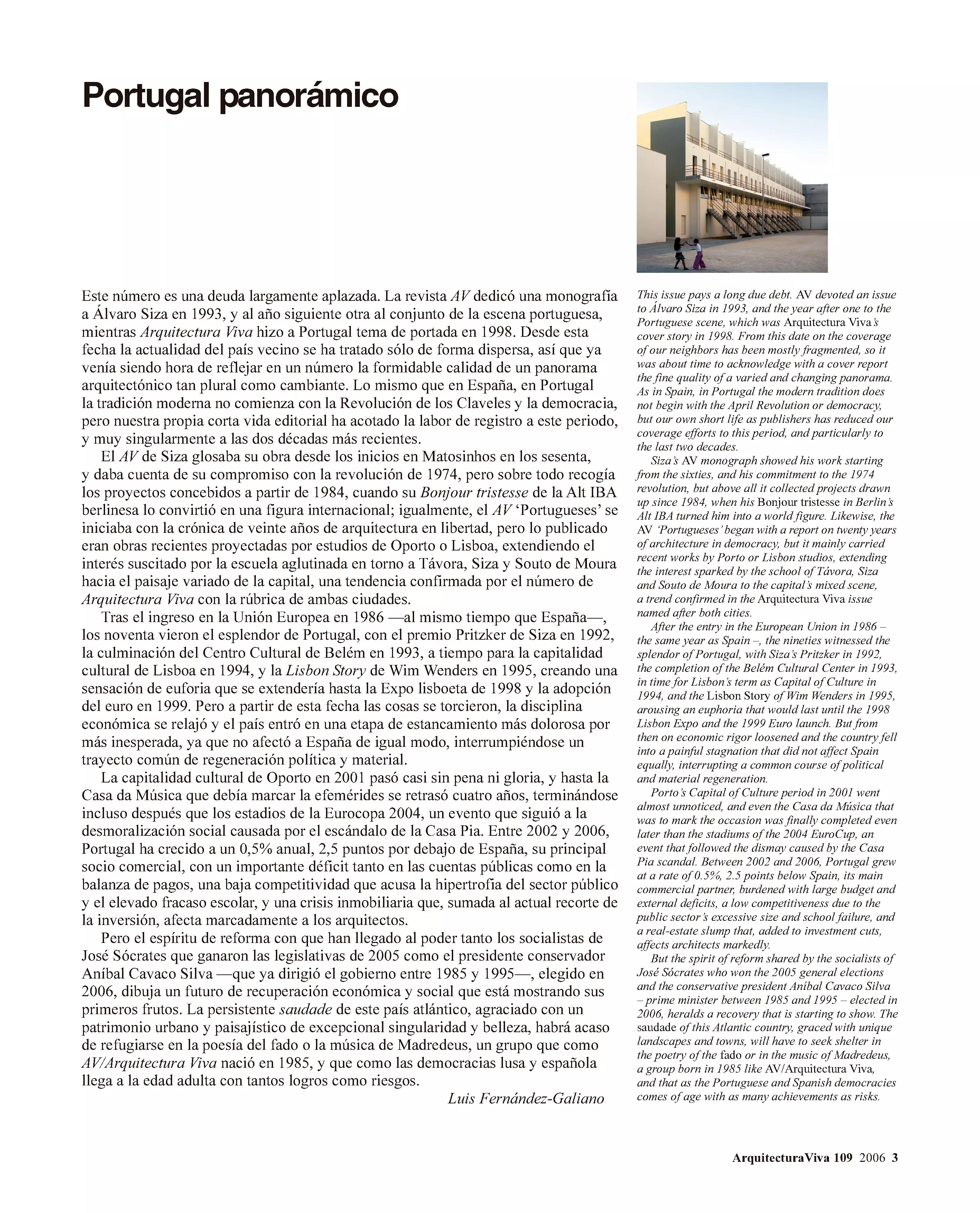 Este número es una deuda largamente aplazada. La revista AV dedicó una monografía a Álvaro Siza en 1993, y al año siguiente otra al conjunto de la escena portuguesa, mientras Arquitectura Viva hizo a Portugal tema de portada en 1998. Desde esta fecha la actualidad del país vecino se ha tratado sólo de forma dispersa, así que ya venía siendo hora de reflejar en un número la formidable calidad de un panorama arquitectónico tan plural como cambiante. Lo mismo que en España, en Portugal la tradición moderna no comienza con la Revolución de los Claveles y la democracia, pero nuestra propia corta vida editorial ha acotado la labor de registro a este periodo, y muy singularmente a las dos décadas más recientes.