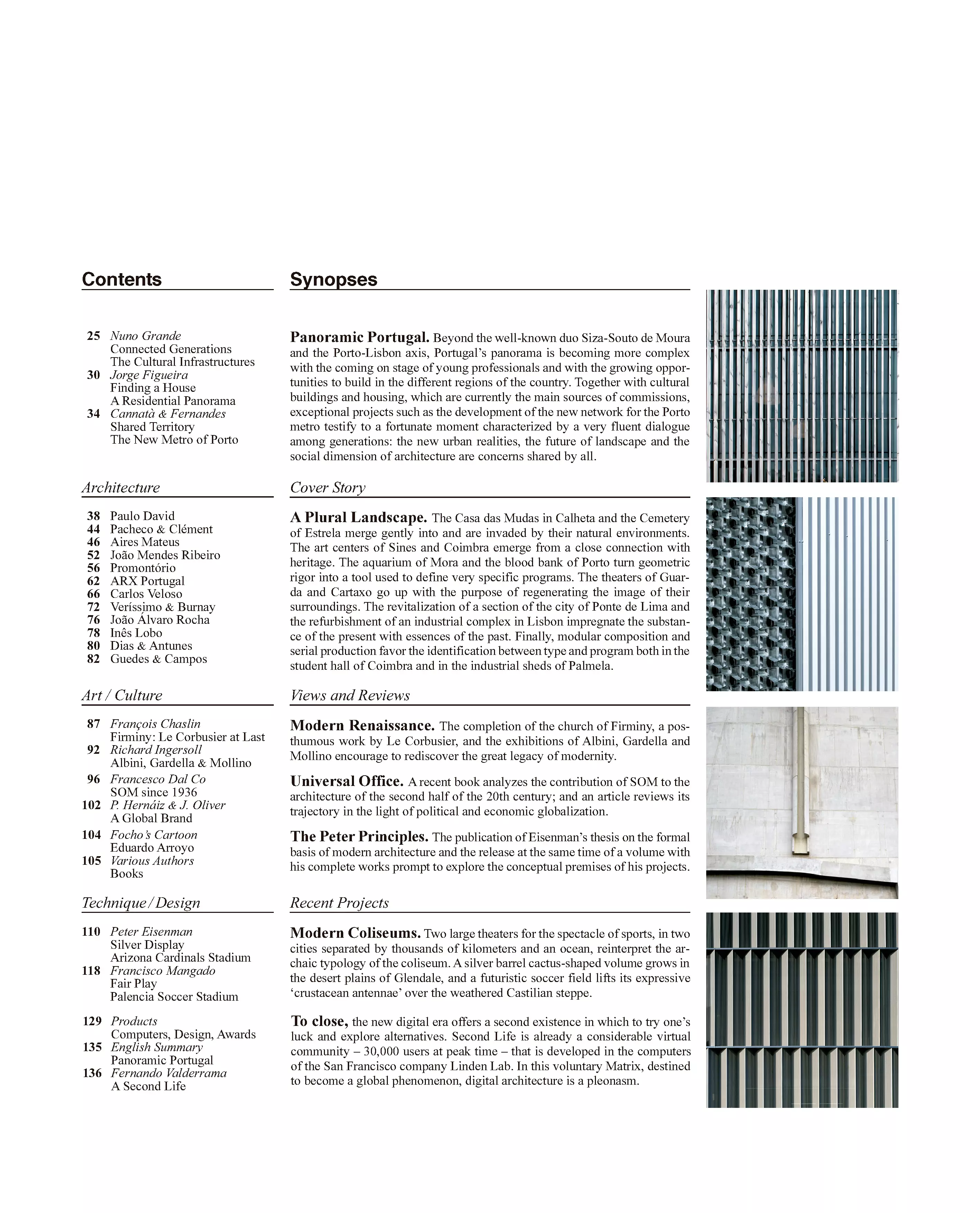 Portugal panorámico. Más allá del conocido binomio Siza-Souto de Moura y del eje Oporto-Lisboa, el panorama luso se hace más complejo con la entrada en escena de jóvenes profesionales y con la ampliación de las posibilidades de construir por todo el país. Junto a las dotaciones culturales y la vivienda, fuentes principales de encargo, episodios excepcionales como el que ha supuesto el diseño y la ejecución de la nueva red del metro de Oporto dan cuenta de un momento afortunado que se caracteriza por la fluidez del diálogo intergeneracional: las nuevas realidades urbanas, el futuro del paisaje y la dimensión social de la arquitectura son preocupaciones compartidas.