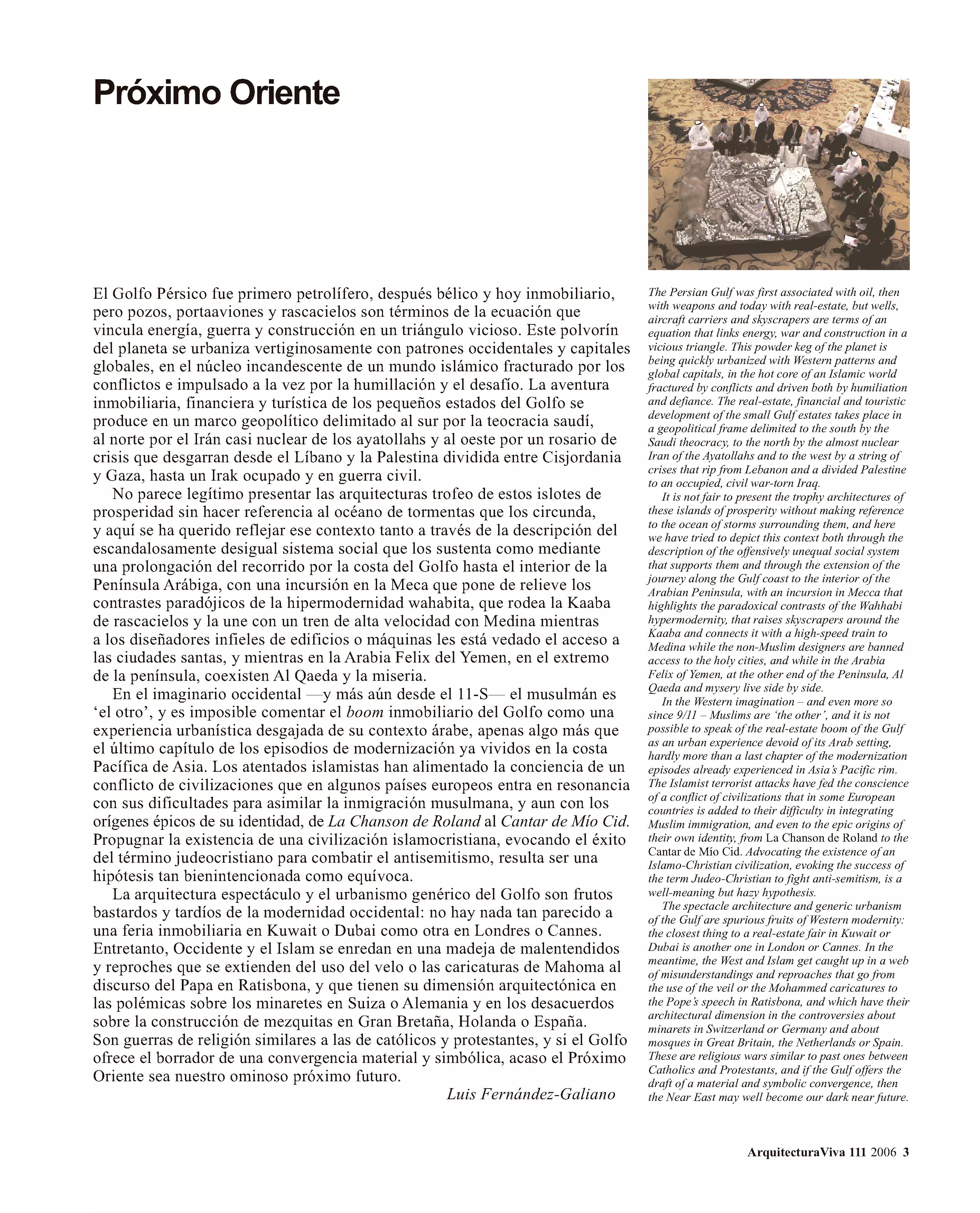 El Golfo Pérsico fue primero petrolífero, después bélico y hoy inmobiliario, pero pozos, portaaviones y rascacielos son términos de la ecuación que vincula energía, guerra y construcción en un triángulo vicioso. Este polvorín del planeta se urbaniza vertiginosamente con patrones occidentales y capitales globales, en el núcleo incandescente de un mundo islámico fracturado por los conflictos e impulsado a la vez por la humillación y el desafío. La aventura inmobiliaria, financiera y turística de los pequeños estados del Golfo se produce en un marco geopolítico delimitado al sur por la teocracia saudí, al norte por el Irán casi nuclear de los ayatollahs y al oeste por un rosario de crisis que desgarran desde el Líbano y la Palestina dividida entre Cisjordania y Gaza, hasta un Irak ocupado y en guerra civil.