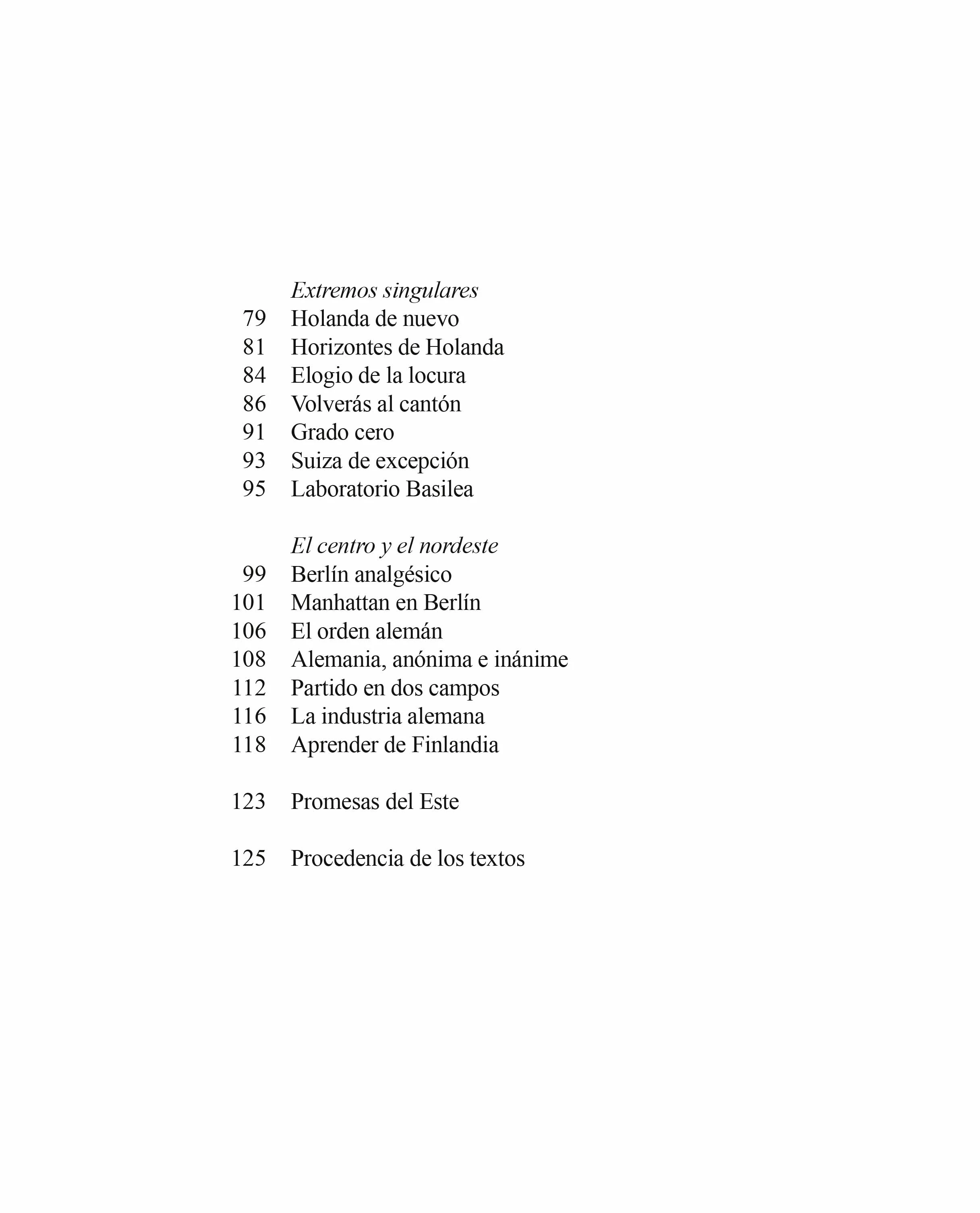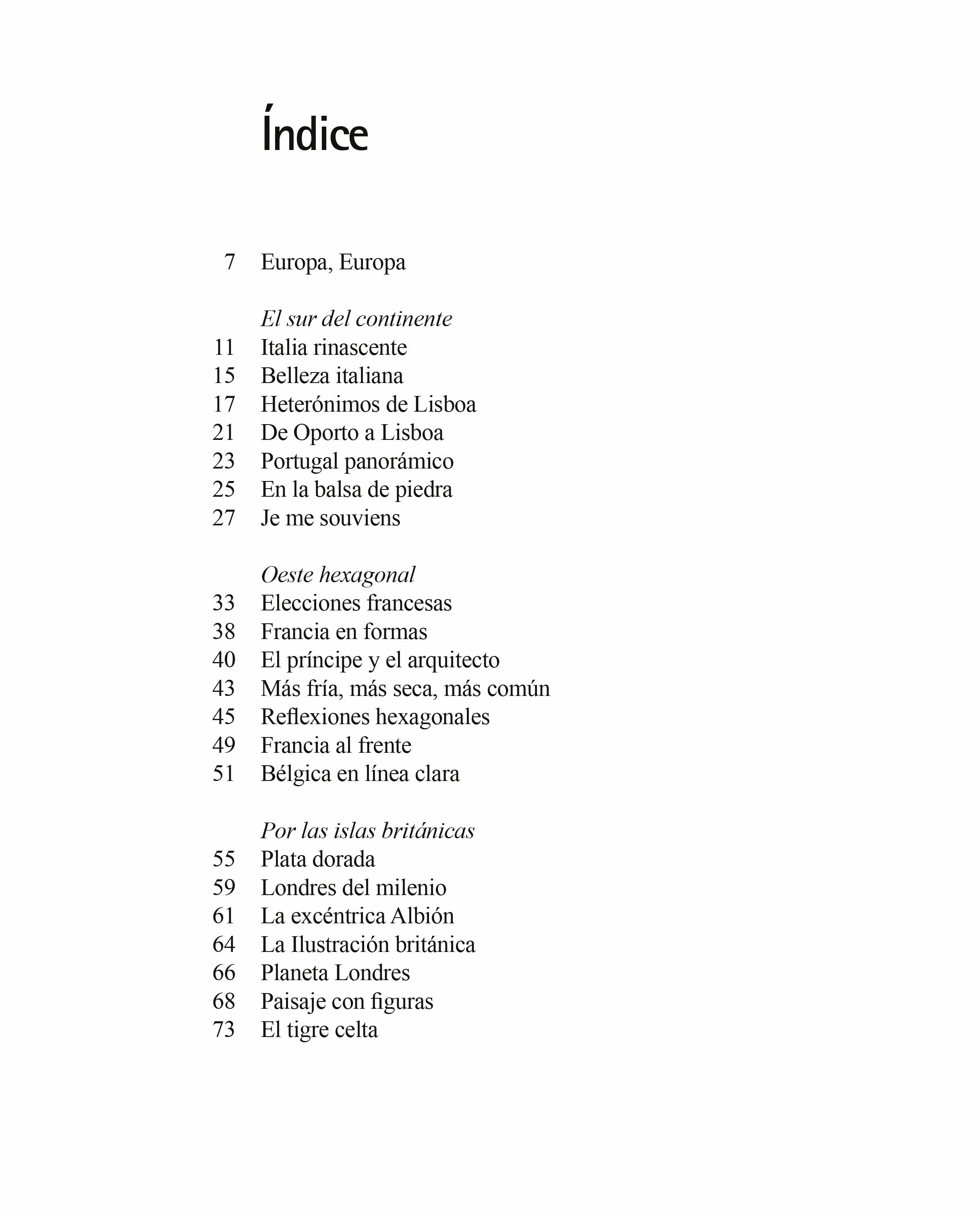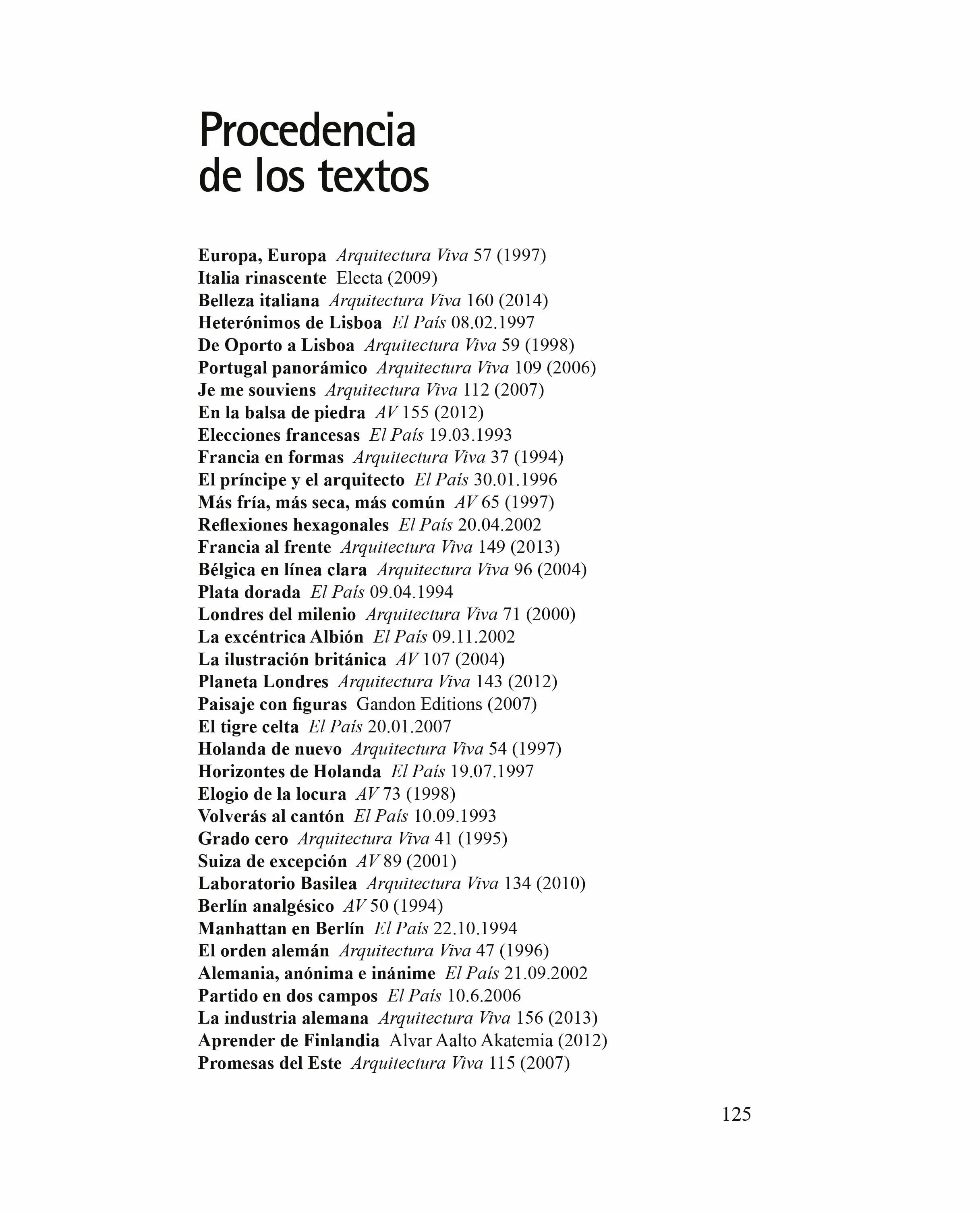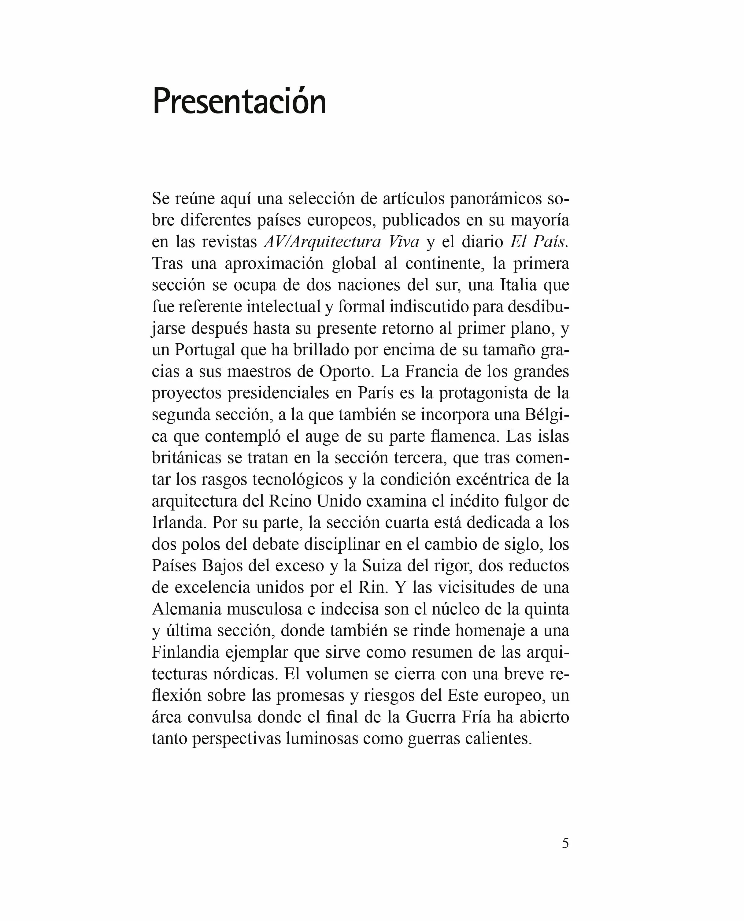 Se reúne aquí una selección de artículos panorámicos sobre diferentes países europeos, publicados en su mayoría en las revistas AV/Arquitectura Viva y el diario El País. Tras una aproximación global al continente, la primera sección se ocupa de dos naciones del sur, una Italia que fue referente intelectual y formal indiscutido para desdibujarse después hasta su presente retorno al primer plano, y un Portugal que ha brillado por encima de su tamaño gracias a sus maestros de Oporto. La Francia de los grandes proyectos presidenciales en París es la protagonista de la segunda sección, a la que también se incorpora una Bélgica que contempló el auge de su parte flamenca. Las islas británicas se tratan en la sección tercera, que tras comentar los rasgos tecnológicos y la condición excéntrica de la arquitectura del Reino Unido examina el inédito fulgor de Irlanda. Por su parte, la sección cuarta está dedicada a los dos polos del debate disciplinar en el cambio de siglo, los Países Bajos del exceso y la Suiza del rigor, dos reductos de excelencia unidos por el Rin. Y las vicisitudes de una Alemania musculosa e indecisa son el núcleo de la quinta y última sección, donde también se rinde homenaje a una Finlandia ejemplar que sirve como resumen de las arquitecturas nórdicas. El volumen se cierra con una breve reflexión sobre las promesas y riesgos del Este europeo, un área convulsa donde el final de la Guerra Fría ha abierto tanto perspectivas luminosas como guerras calientes.