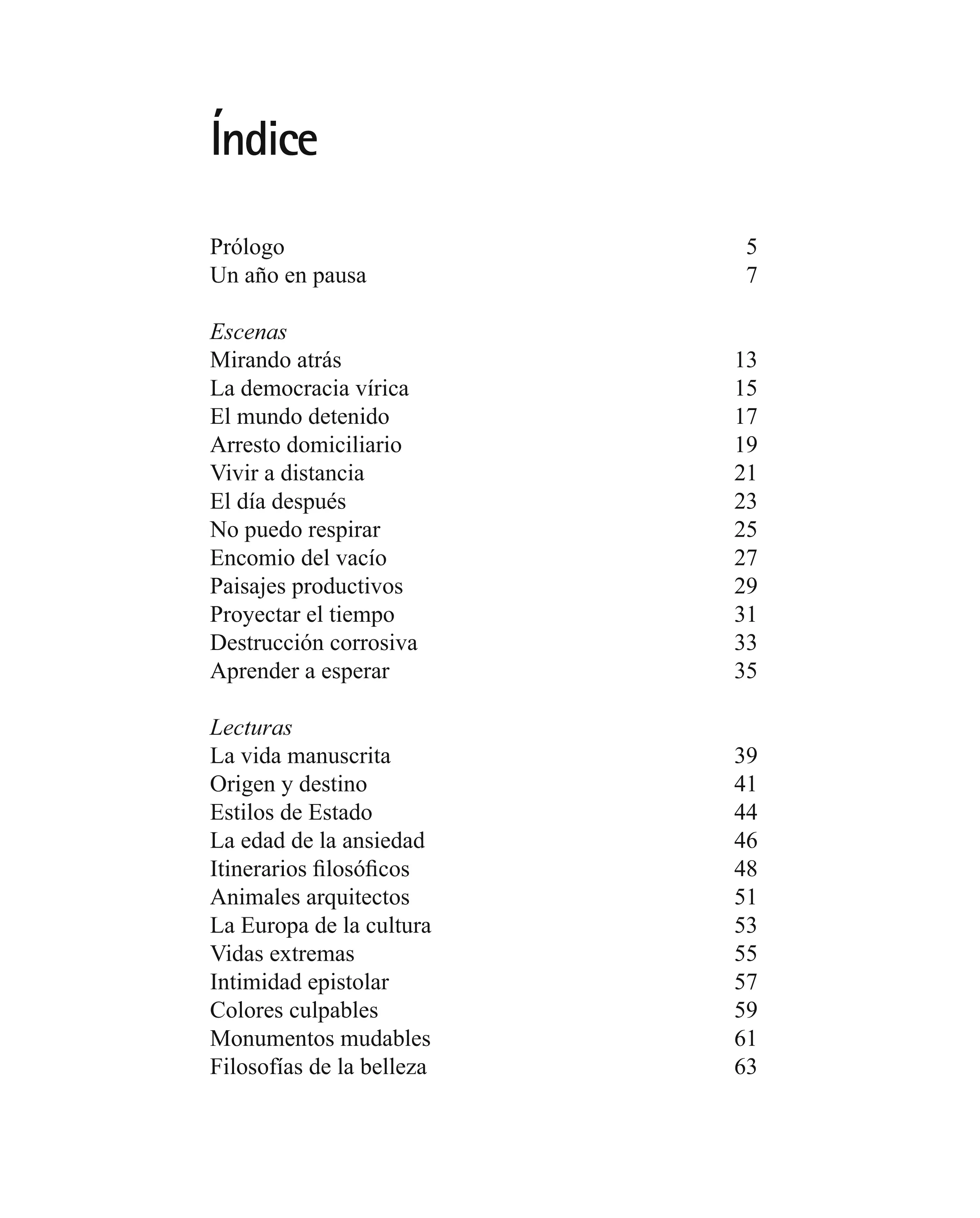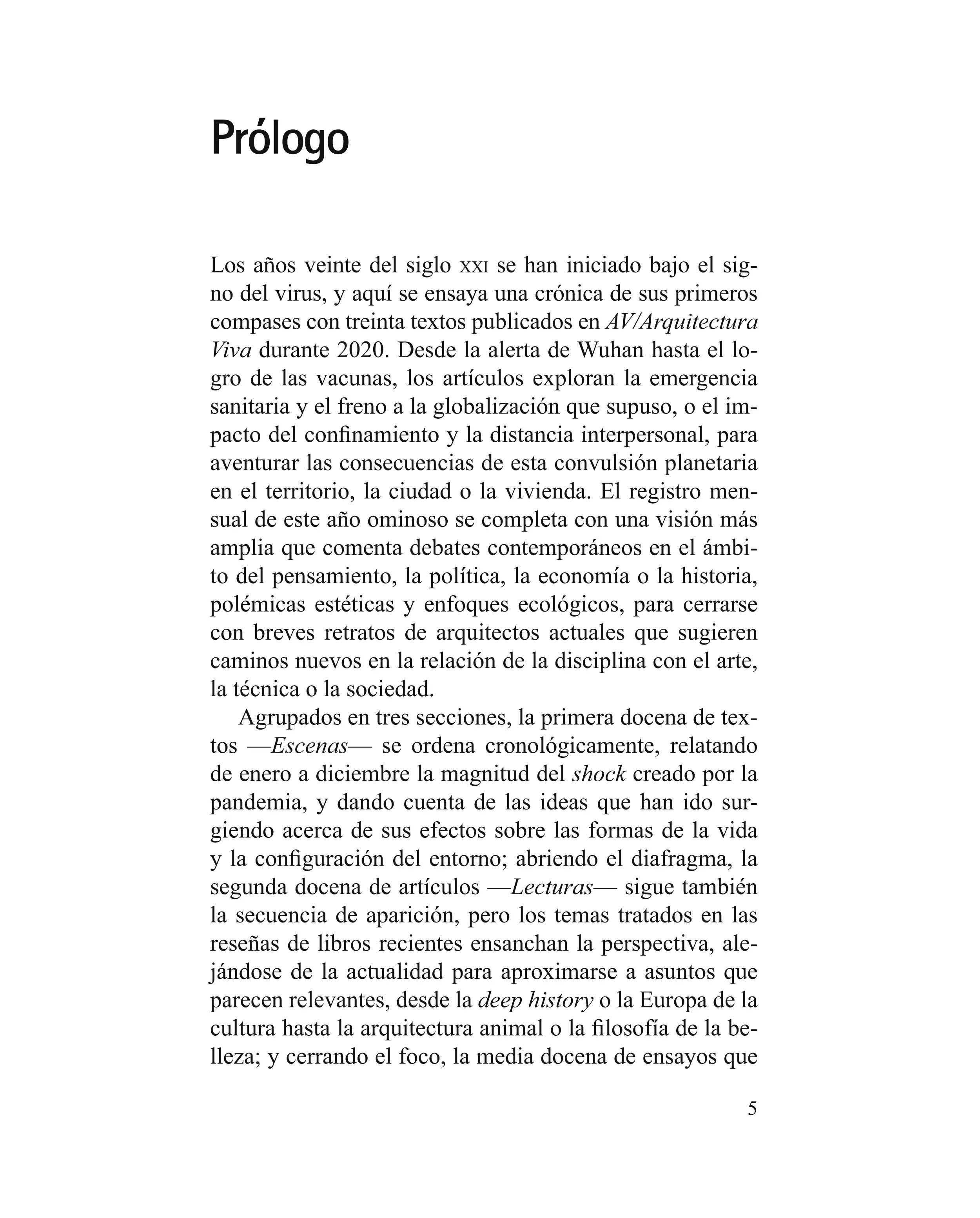 Los años veinte del siglo XXI se han iniciado bajo el signo del virus, y aquí se ensaya una crónica de sus primeros compases con treinta textos publicados en AV/Arquitectura Viva durante 2020. Desde la alerta de Wuhan hasta el logro de las vacunas, los artículos de este libro, con 80 páginas y en tapa blanda, exploran la emergencia sanitaria y el freno a la globalización que supuso, o el impacto del confinamiento y la distancia interpersonal, para aventurar las consecuencias de esta convulsión planetaria en el territorio, la ciudad o la vivienda. El registro mensual de este año ominoso se completa con una visión más amplia que comenta debates contemporáneos en el ámbito del pensamiento, la política, la economía o la historia, polémicas estéticas y enfoques ecológicos, para cerrarse con breves retratos de arquitectos actuales que sugieren caminos nuevos en la relación de la disciplina con el arte, la técnica o la sociedad.