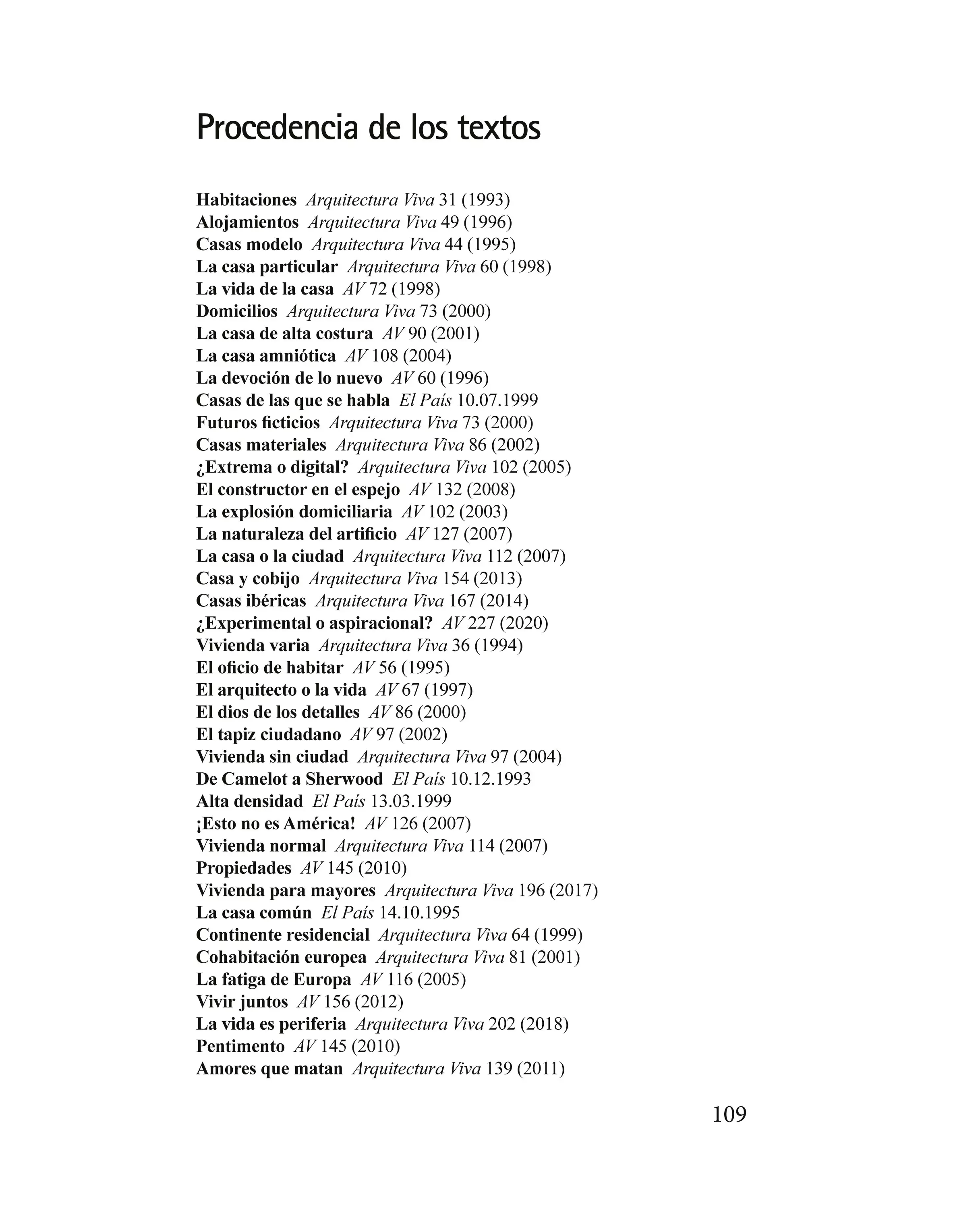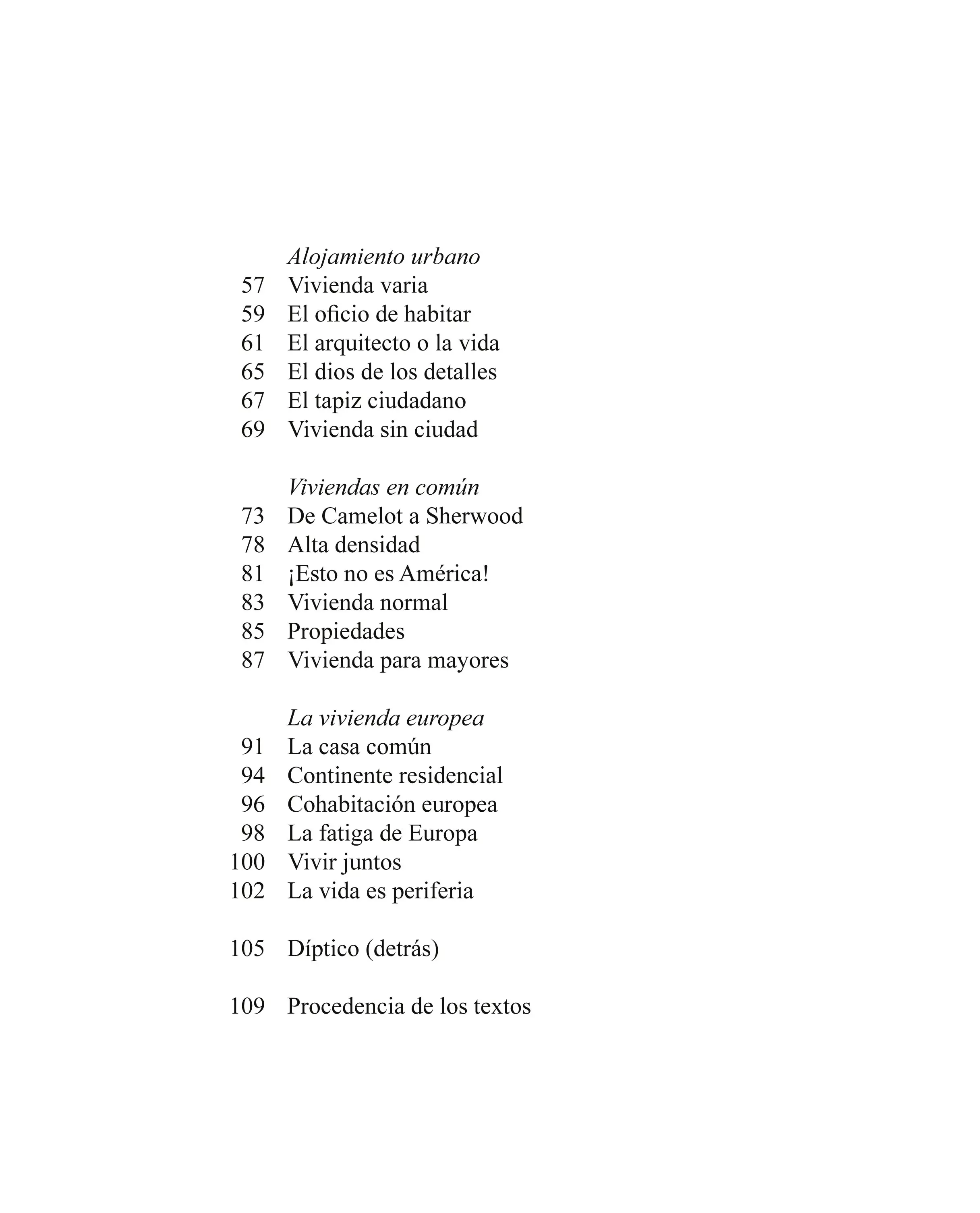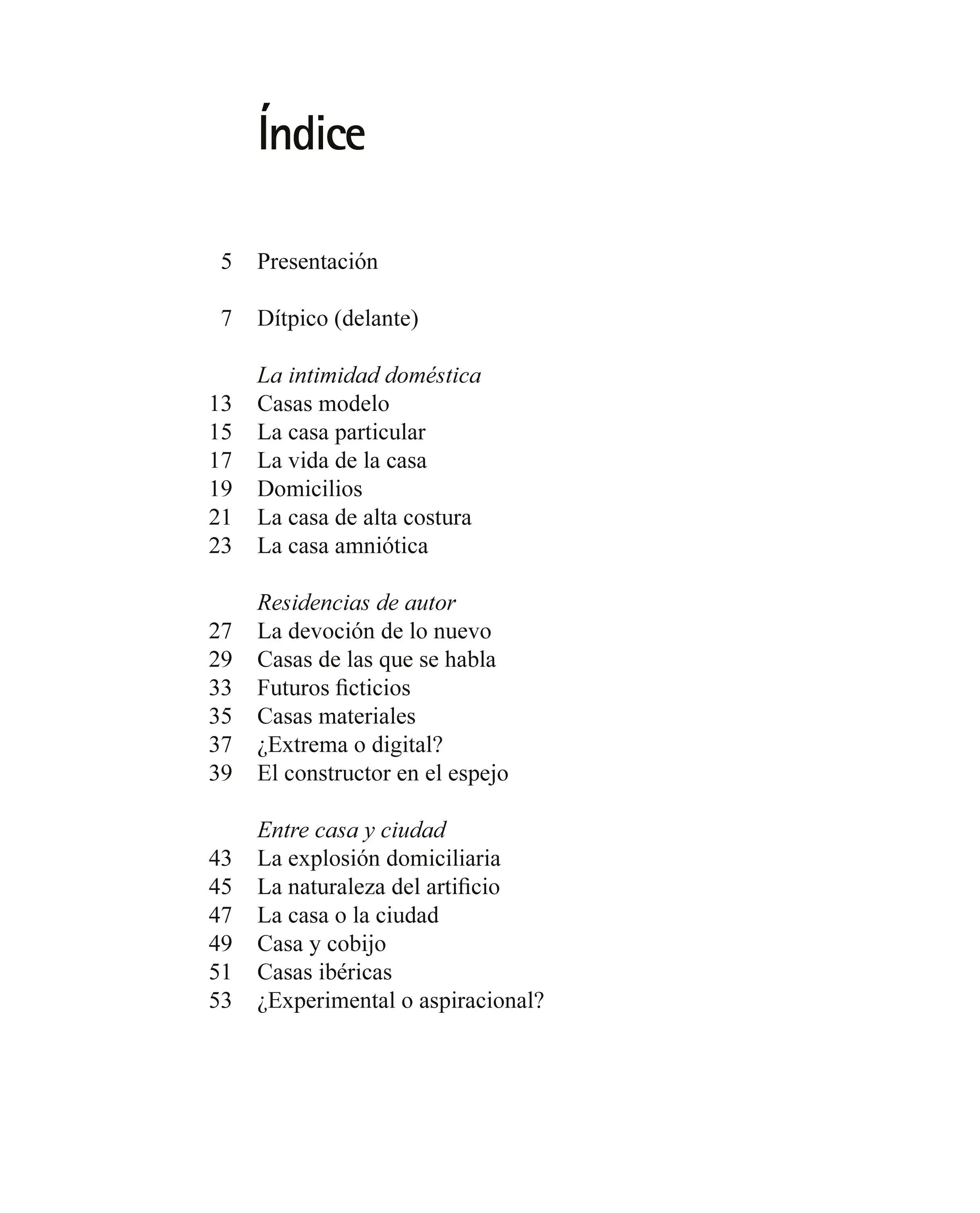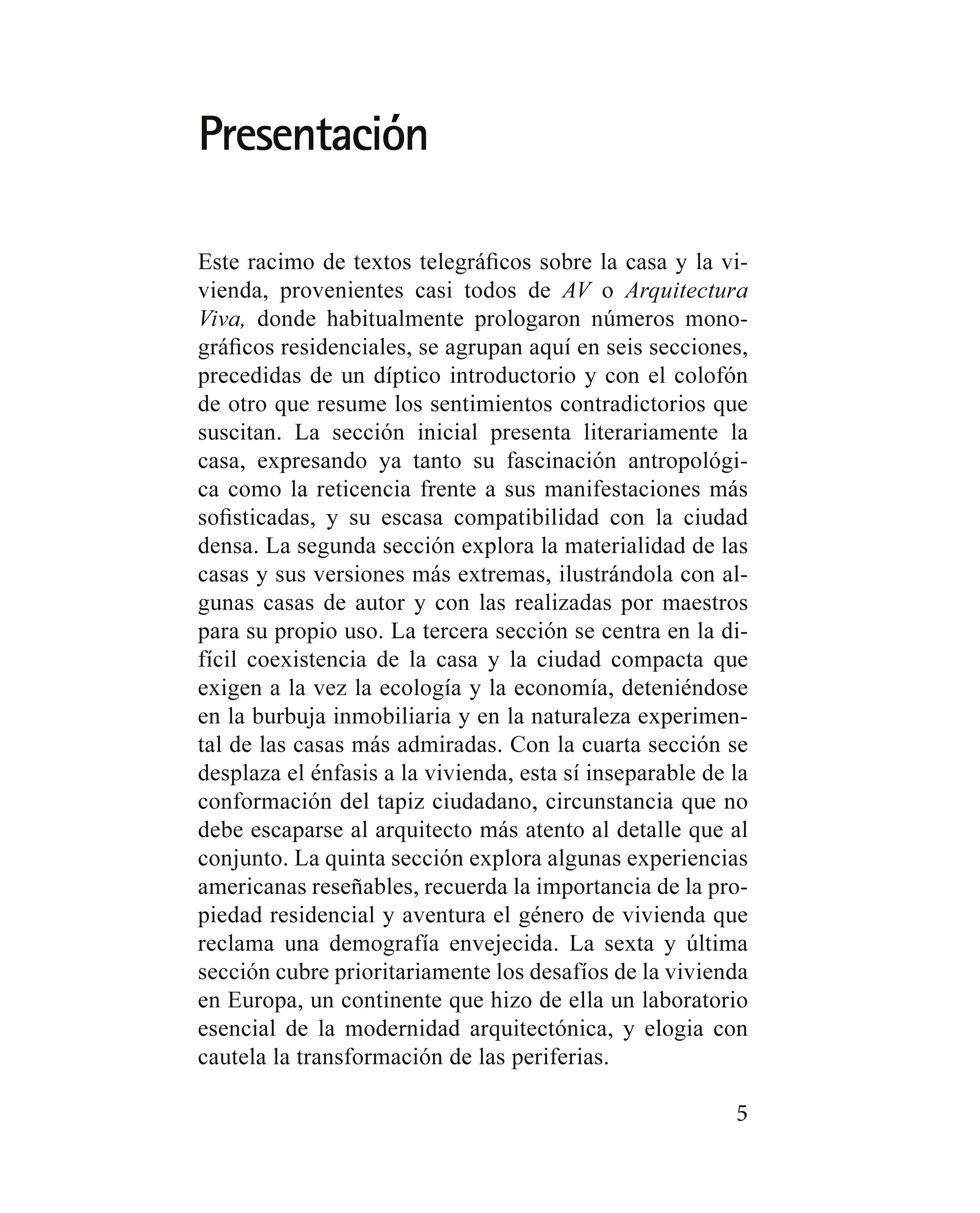 Este racimo de textos sobre la casa y la vivienda se estructura en seis secciones, con un colofón sobre los sentimientos contradictorios que suscitan. La sección inicial presenta literariamente la casa, subrayando su fascinación antropológica y la reticencia frente a sus manifestaciones más sofisticadas; la segunda explora la materialidad de las casas y sus versiones más extremas, ilustrándola con algunos ejemplos de autor; la tercera se centra en la difícil coexistencia de la casa y la ciudad compacta que exigen a la vez la ecología y la economía; con la cuarta se desplaza el énfasis a la vivienda, inseparable de la conformación del tapiz ciudadano; en la quinta se exploran algunas experiencias colectivas, se recuerda la importancia de la propiedad y se aventura el género de residencia que reclama una demografía envejecida; la sexta y última cubre prioritariamente los desafíos de la vivienda en Europa, un continente que hizo de ella un laboratorio esencial de la modernidad arquitectónica.