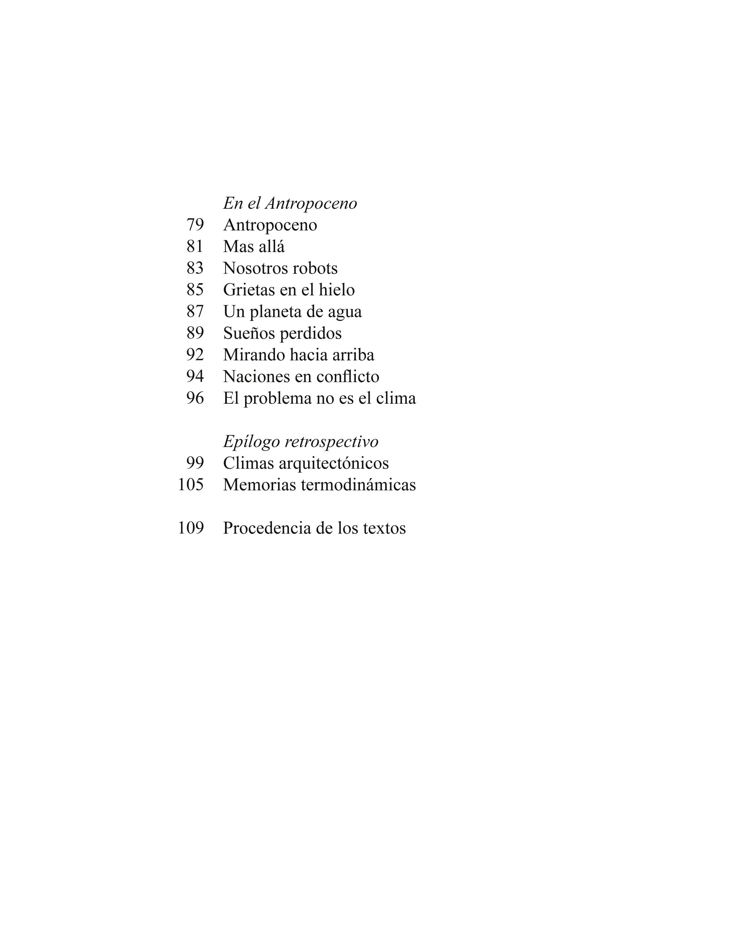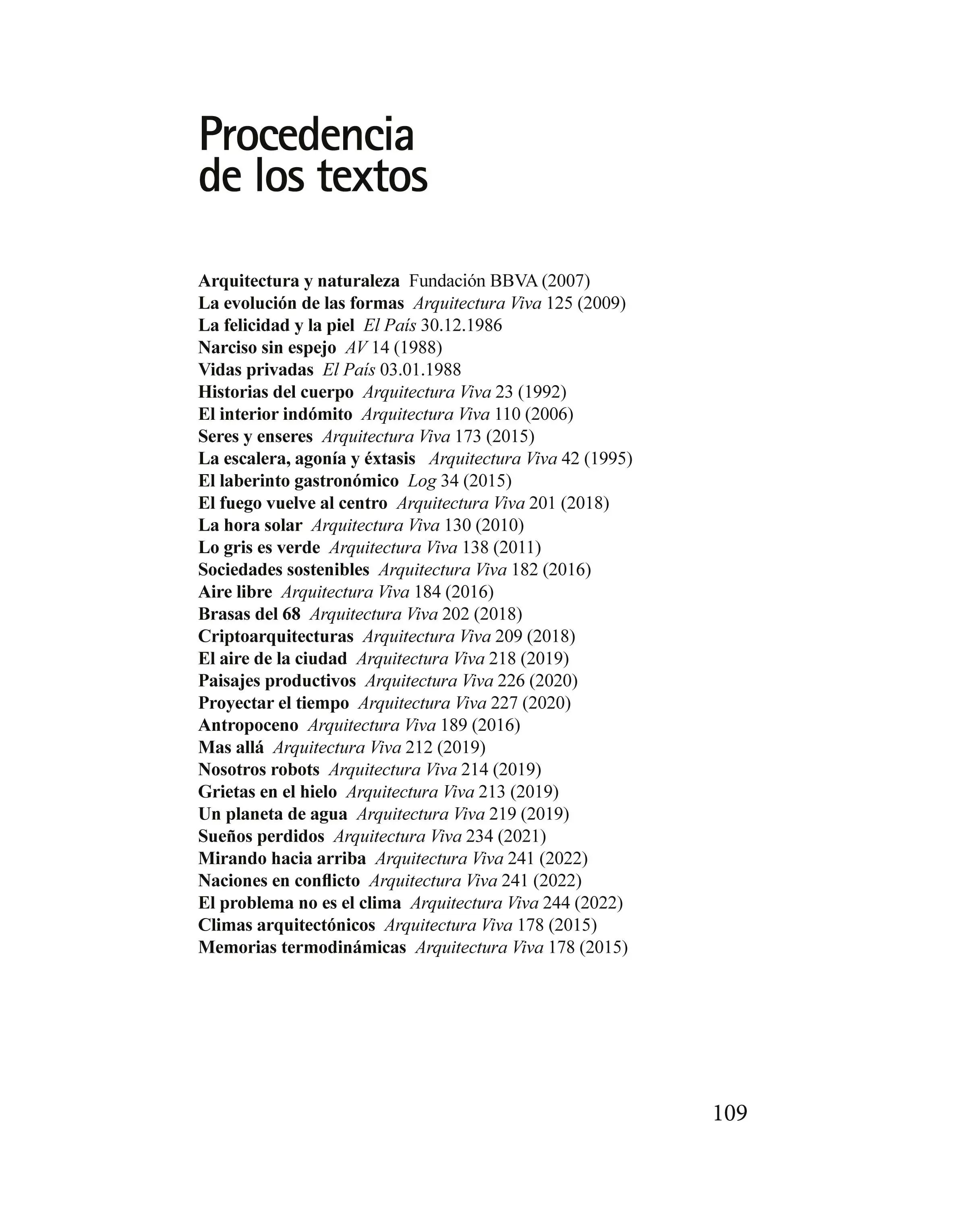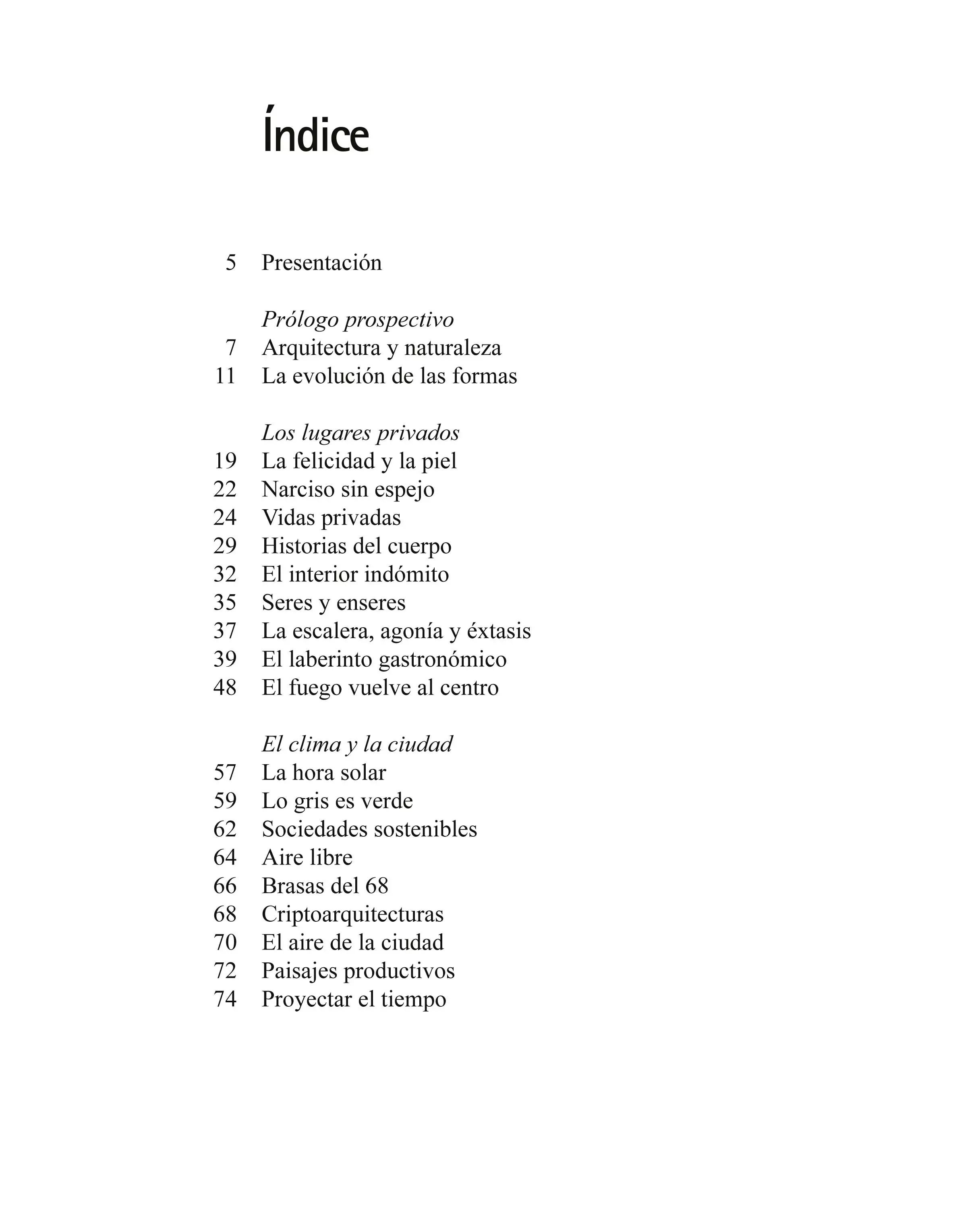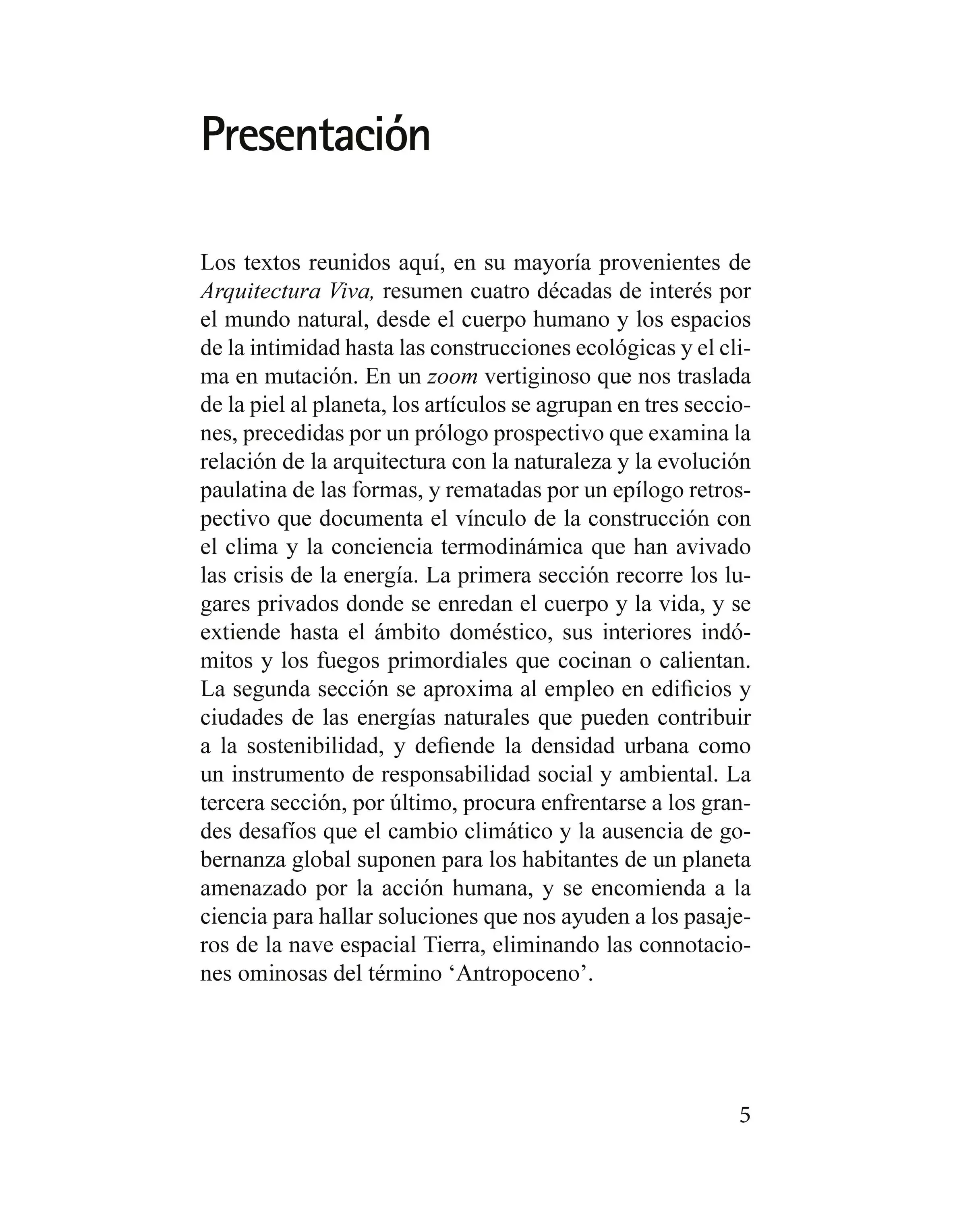 Los textos reunidos aquí resumen cuatro décadas de interés por el mundo natural, desde el cuerpo humano y los espacios de la intimidad hasta las construcciones ecológicas y el clima en mutación. En un zoom que nos traslada de la piel al planeta, la primera sección recorre los lugares privados donde se enredan el cuerpo y la vida, y se extiende hasta el ámbito doméstico, sus interiores indómitos y los fuegos primordiales que cocinan o calientan; la segunda se aproxima al empleo en edificios y ciudades de las energías naturales que pueden contribuir a la sostenibilidad, y defiende la densidad urbana como un instrumento de responsabilidad social y ambiental; y la tercera procura enfrentarse a los grandes desafíos que el cambio climático y la ausencia de gobernanza global suponen para los habitantes de un planeta amenazado por la acción humana, y se encomienda a los avances de la ciencia para hallar soluciones que nos ayuden a los pasajeros de la nave espacial Tierra.