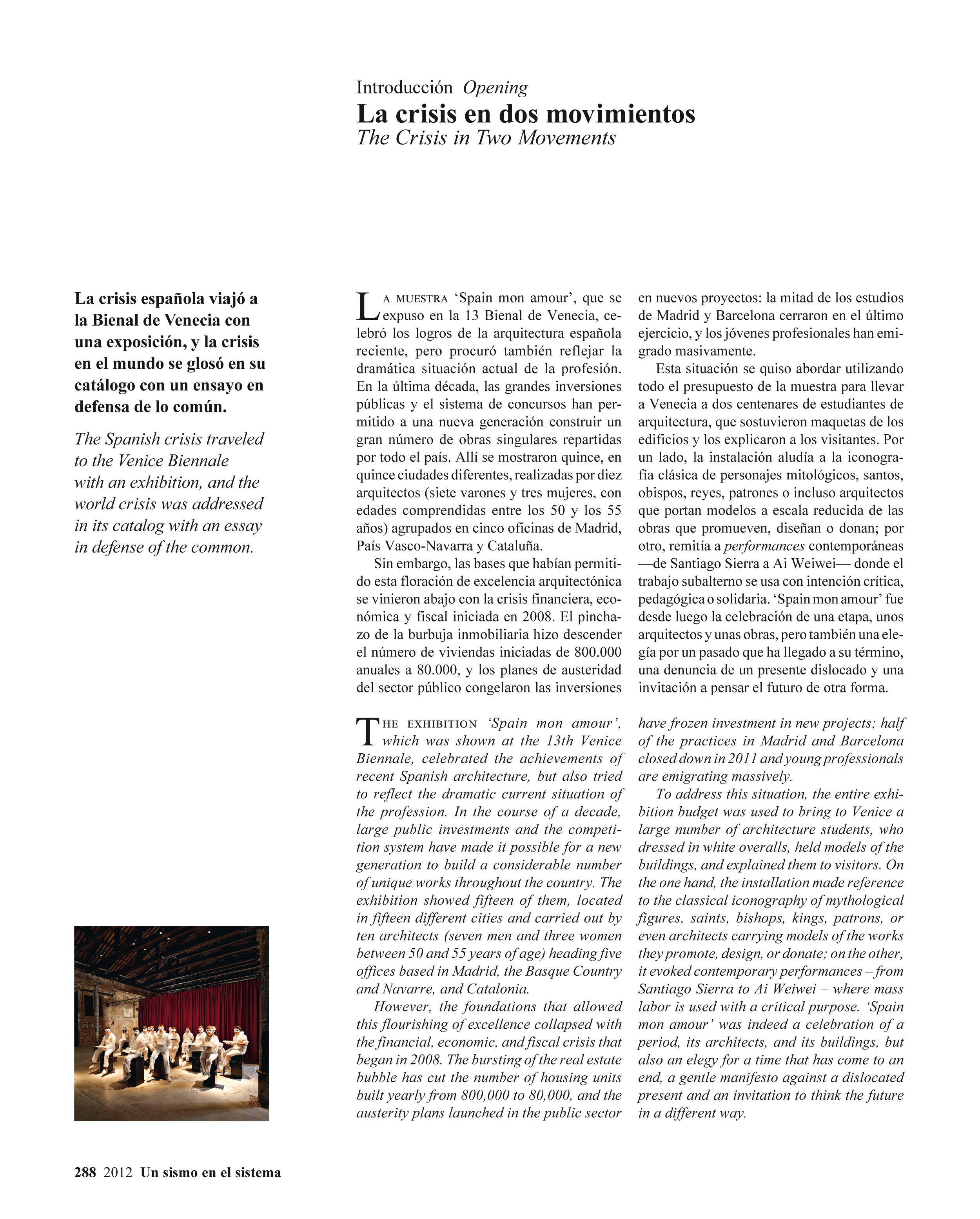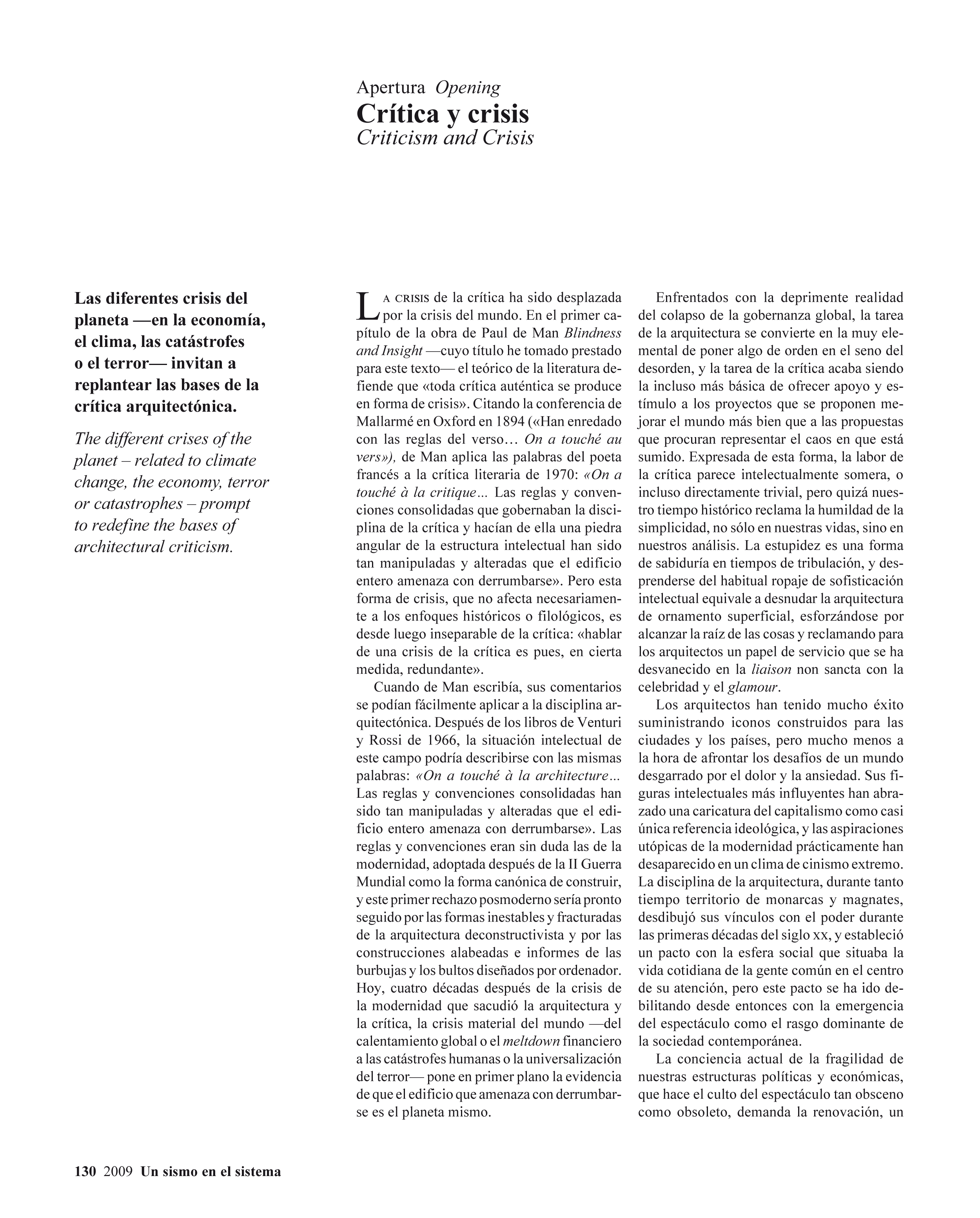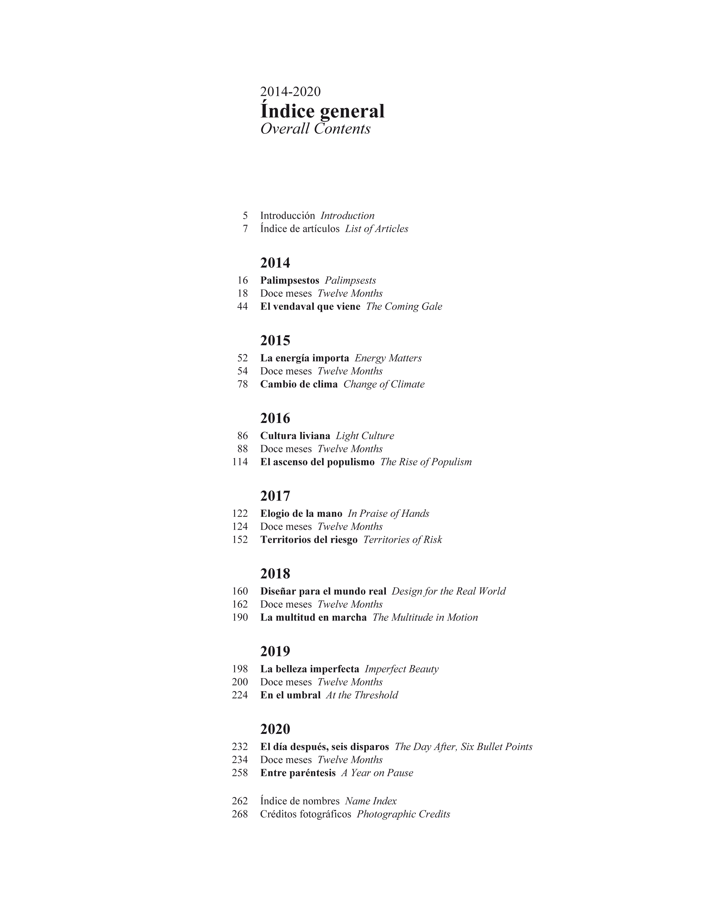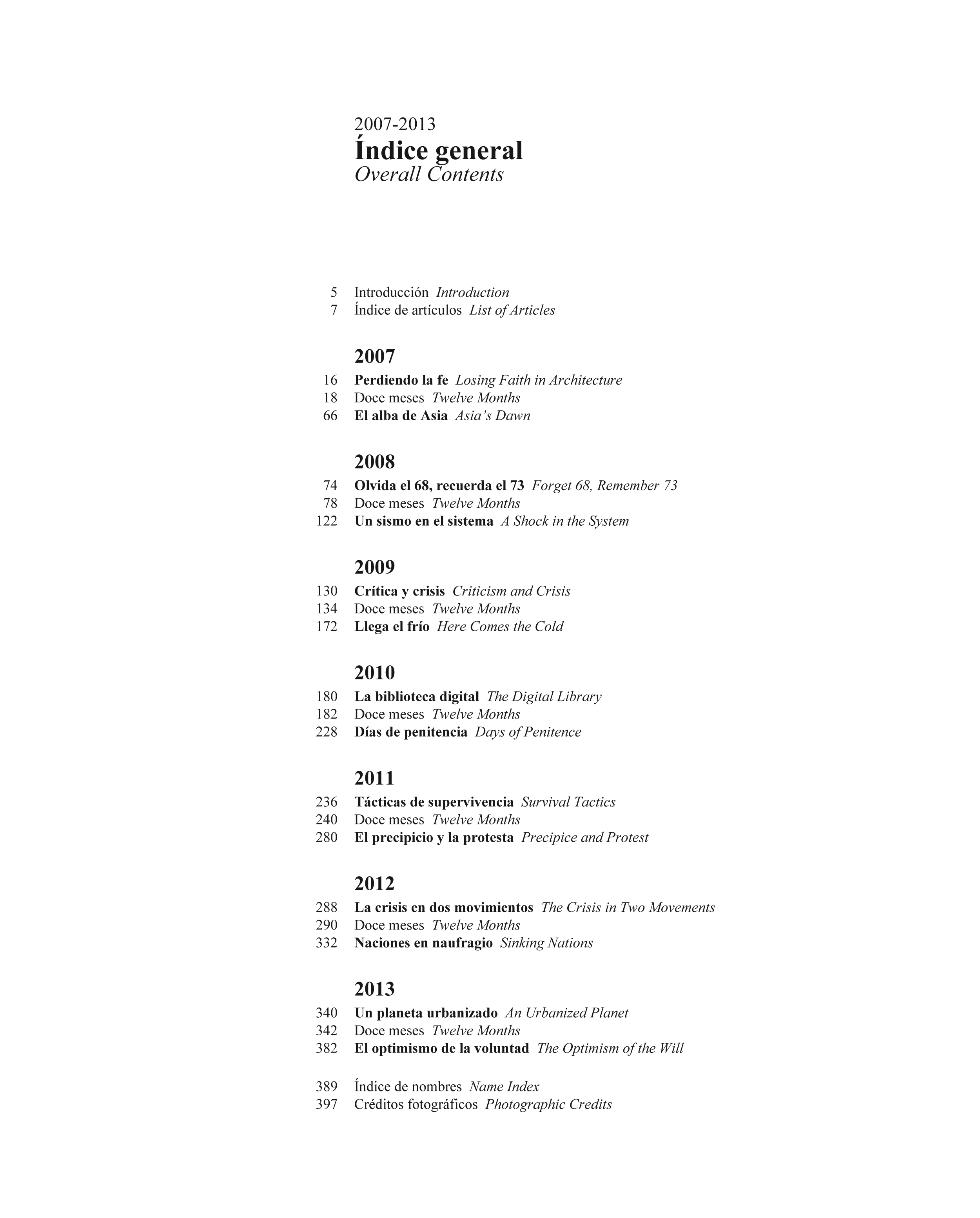 Los dos volúmenes de estas Crónicas de la crisis cierran una selección de textos que se extiende desde 1976 hasta 2020. En las dos primeras entregas, y bajo el título de Las grandes esperanzas, se reunieron artículos de 1976-1984 (‘Empeños sostenibles’) y de 1985-1992 (‘Fracturas y ficciones’), publicados originalmente en revistas profesionales o en diarios, y reproducidos solamente en castellano; las dos entregas siguientes, con el título Años alejandrinos, contenían textos aparecidos en El País durante los 14 años en los que Luis Fernández-Galiano se ocupó de una página semanal de arquitectura, 1993-1999 (‘La edad del espectáculo’) y 2000-2006 (‘Tiempo de incertidumbre’), todos en versión bilingüe castellano-inglés; y estas dos últimas entregas añaden otros 14 años, 2007-2013 (‘Un sismo en el sistema’) y 2014-2020 (‘Territorios del riesgo’), con textos de nuevo bilingües, aunque ahora procedentes mayoritariamente de AV Monografías o de Arquitectura Viva, las revistas que Fernández-Galiano dirige desde su creación en 1985.