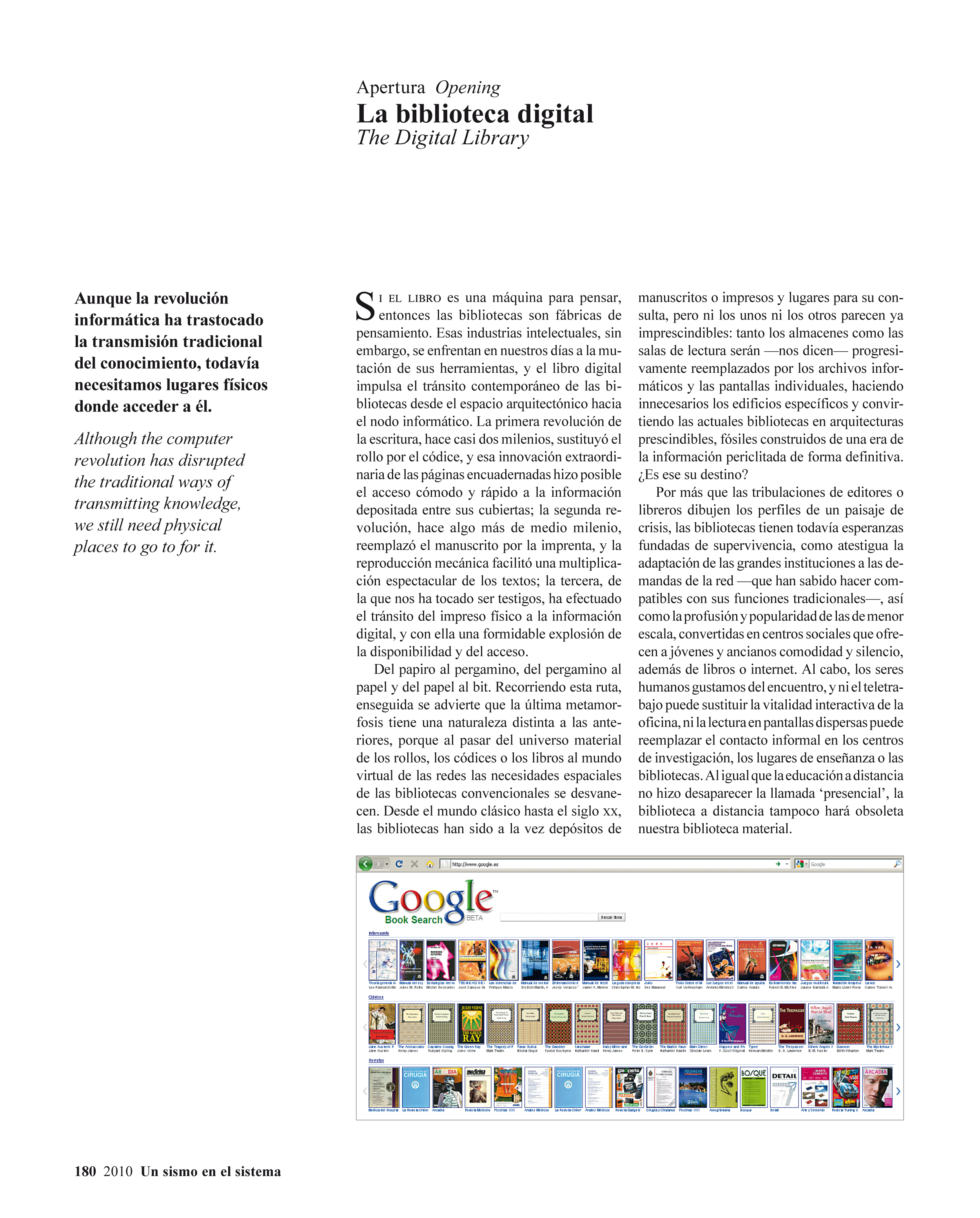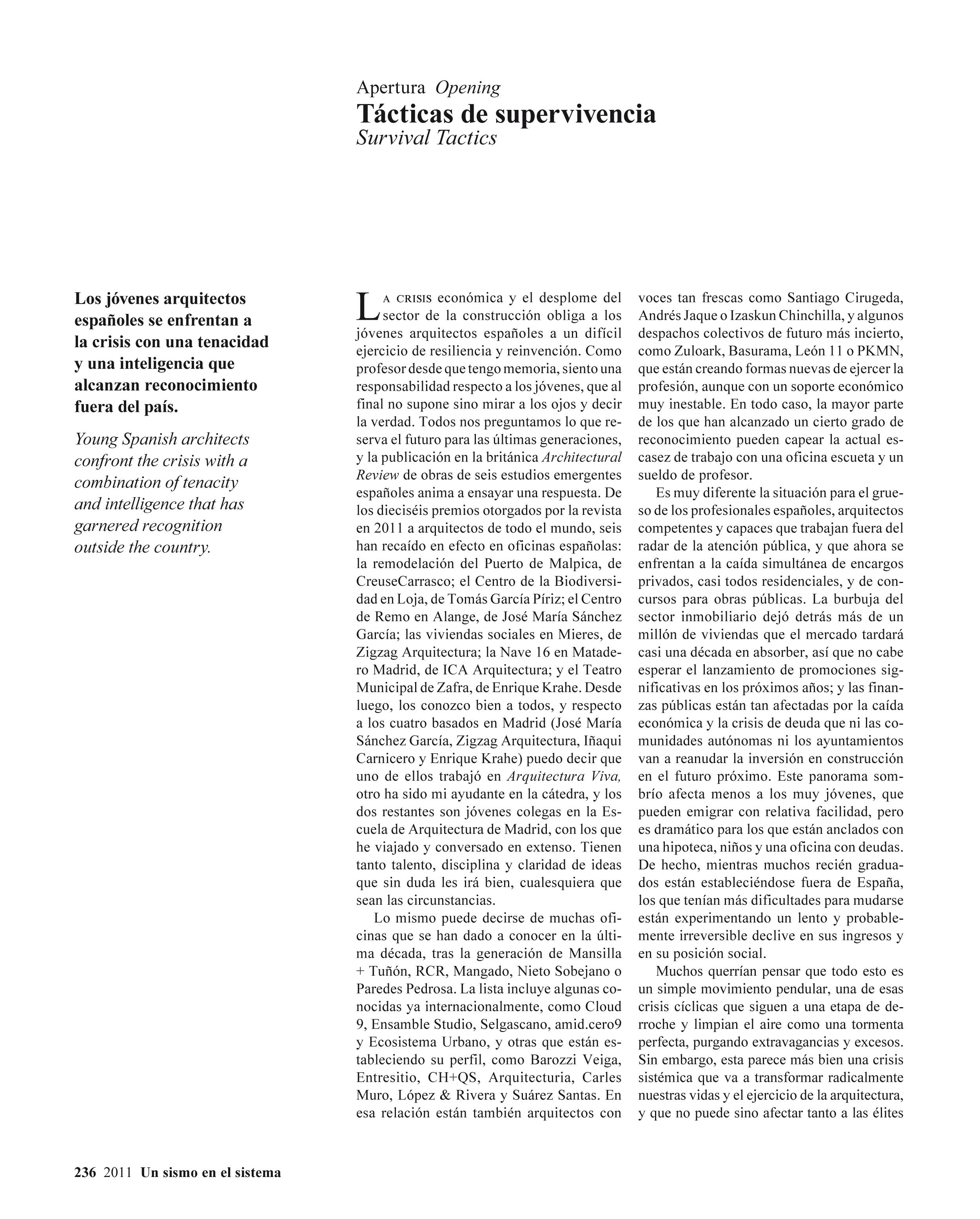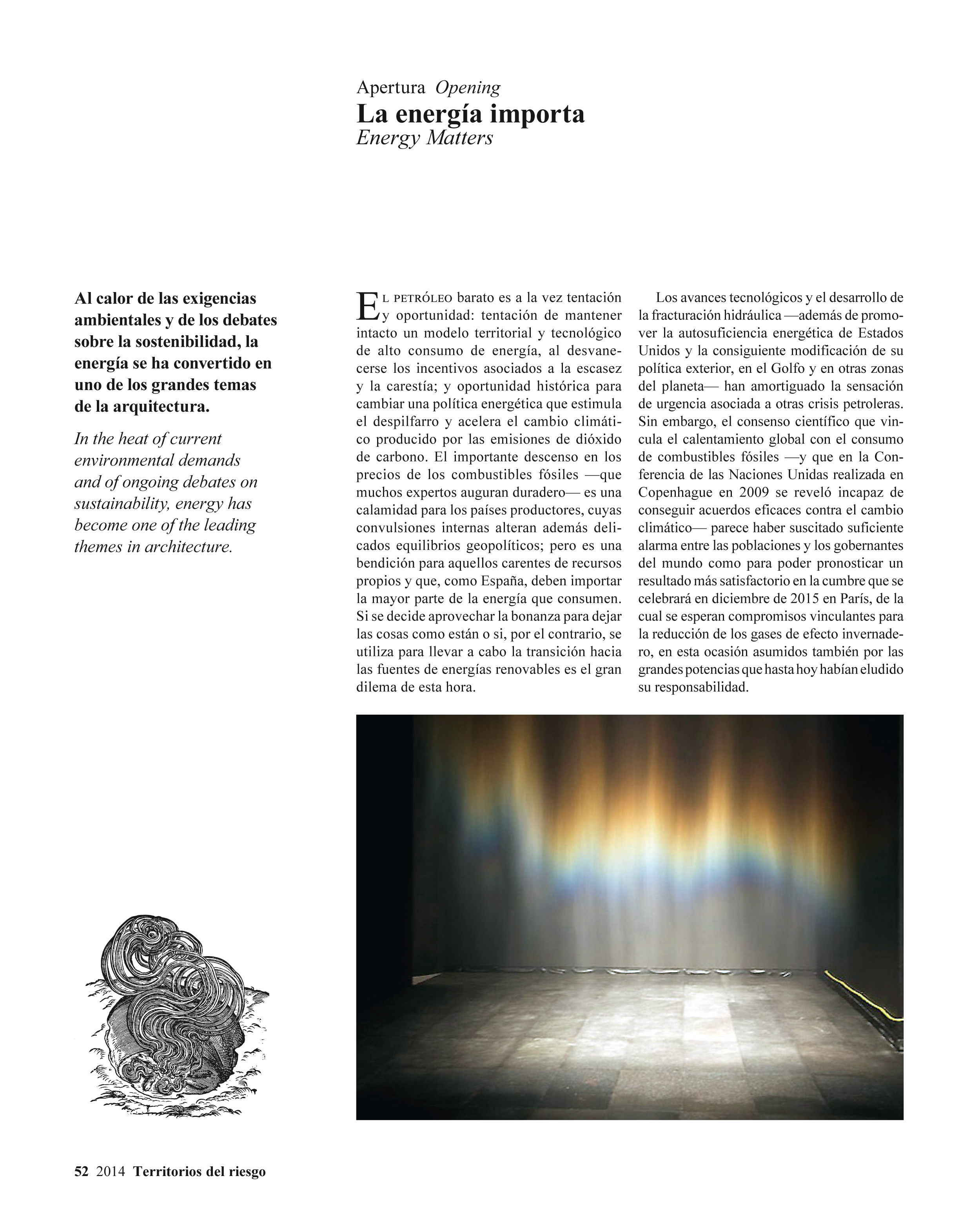 Los dos volúmenes de estas Crónicas de la crisis cierran una selección de textos que se extiende desde 1976 hasta 2020. En las dos primeras entregas, y bajo el título de Las grandes esperanzas, se reunieron artículos de 1976-1984 (‘Empeños sostenibles’) y de 1985-1992 (‘Fracturas y ficciones’), publicados originalmente en revistas profesionales o en diarios, y reproducidos solamente en castellano; las dos entregas siguientes, con el título Años alejandrinos, contenían textos aparecidos en El País durante los 14 años en los que Luis Fernández-Galiano se ocupó de una página semanal de arquitectura, 1993-1999 (‘La edad del espectáculo’) y 2000-2006 (‘Tiempo de incertidumbre’), todos en versión bilingüe castellano-inglés; y estas dos últimas entregas añaden otros 14 años, 2007-2013 (‘Un sismo en el sistema’) y 2014-2020 (‘Territorios del riesgo’), con textos de nuevo bilingües, aunque ahora procedentes mayoritariamente de AV Monografías o de Arquitectura Viva, las revistas que Fernández-Galiano dirige desde su creación en 1985.