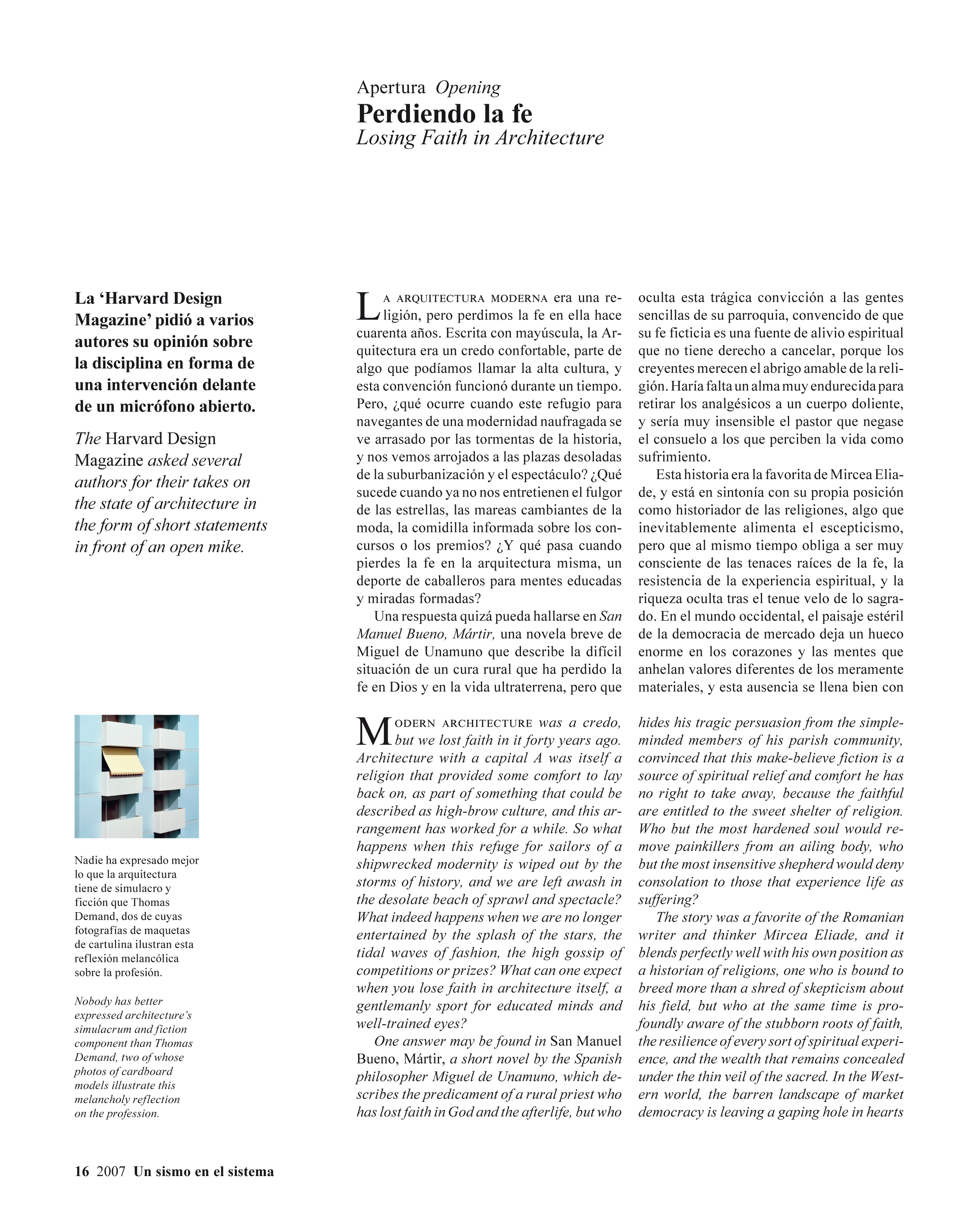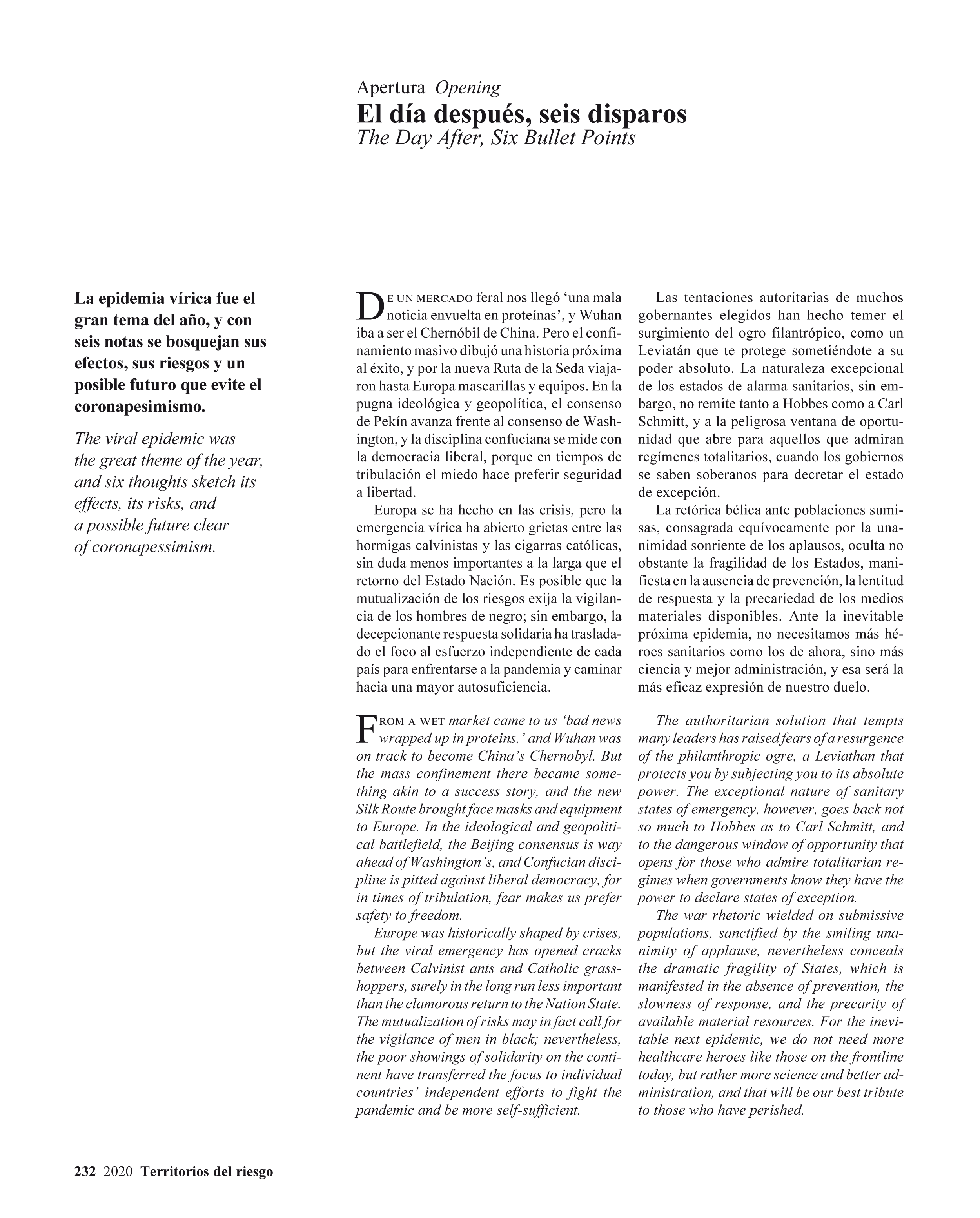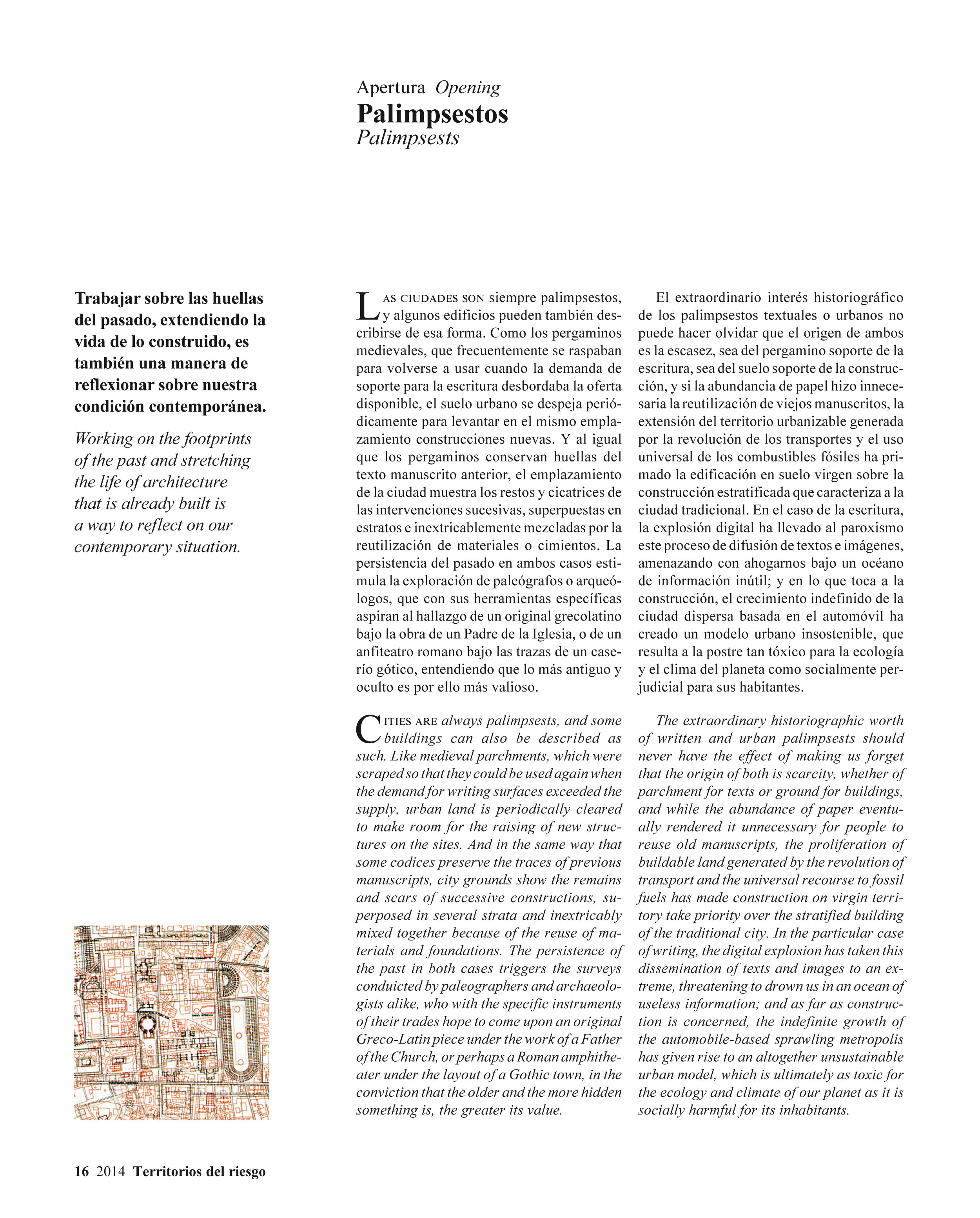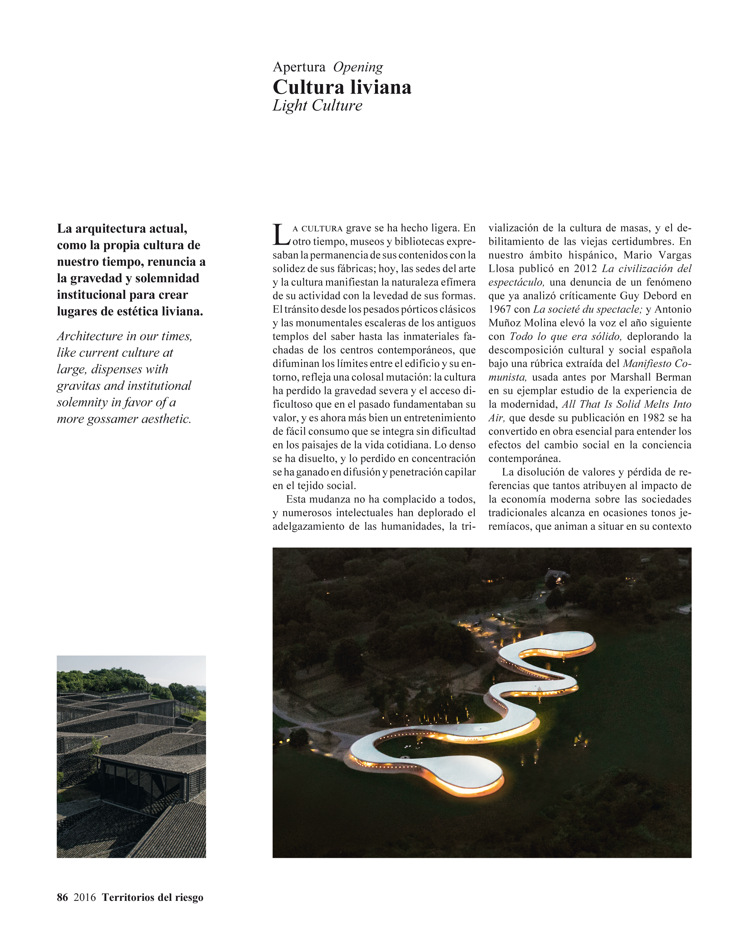 Los dos volúmenes de estas Crónicas de la crisis cierran una selección de textos que se extiende desde 1976 hasta 2020. En las dos primeras entregas, y bajo el título de Las grandes esperanzas, se reunieron artículos de 1976-1984 (‘Empeños sostenibles’) y de 1985-1992 (‘Fracturas y ficciones’), publicados originalmente en revistas profesionales o en diarios, y reproducidos solamente en castellano; las dos entregas siguientes, con el título Años alejandrinos, contenían textos aparecidos en El País durante los 14 años en los que Luis Fernández-Galiano se ocupó de una página semanal de arquitectura, 1993-1999 (‘La edad del espectáculo’) y 2000-2006 (‘Tiempo de incertidumbre’), todos en versión bilingüe castellano-inglés; y estas dos últimas entregas añaden otros 14 años, 2007-2013 (‘Un sismo en el sistema’) y 2014-2020 (‘Territorios del riesgo’), con textos de nuevo bilingües, aunque ahora procedentes mayoritariamente de AV Monografías o de Arquitectura Viva, las revistas que Fernández-Galiano dirige desde su creación en 1985.