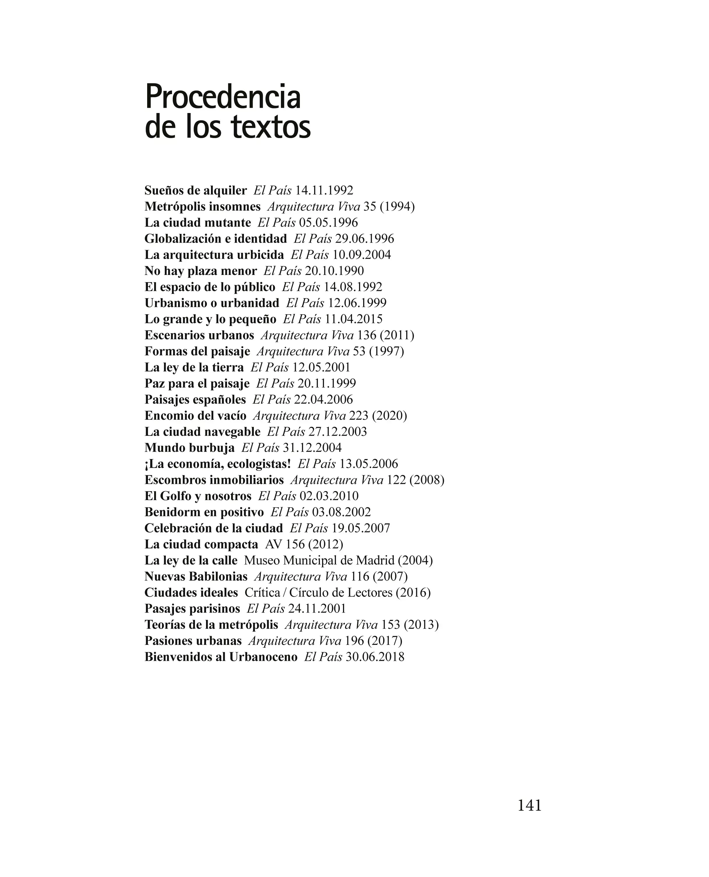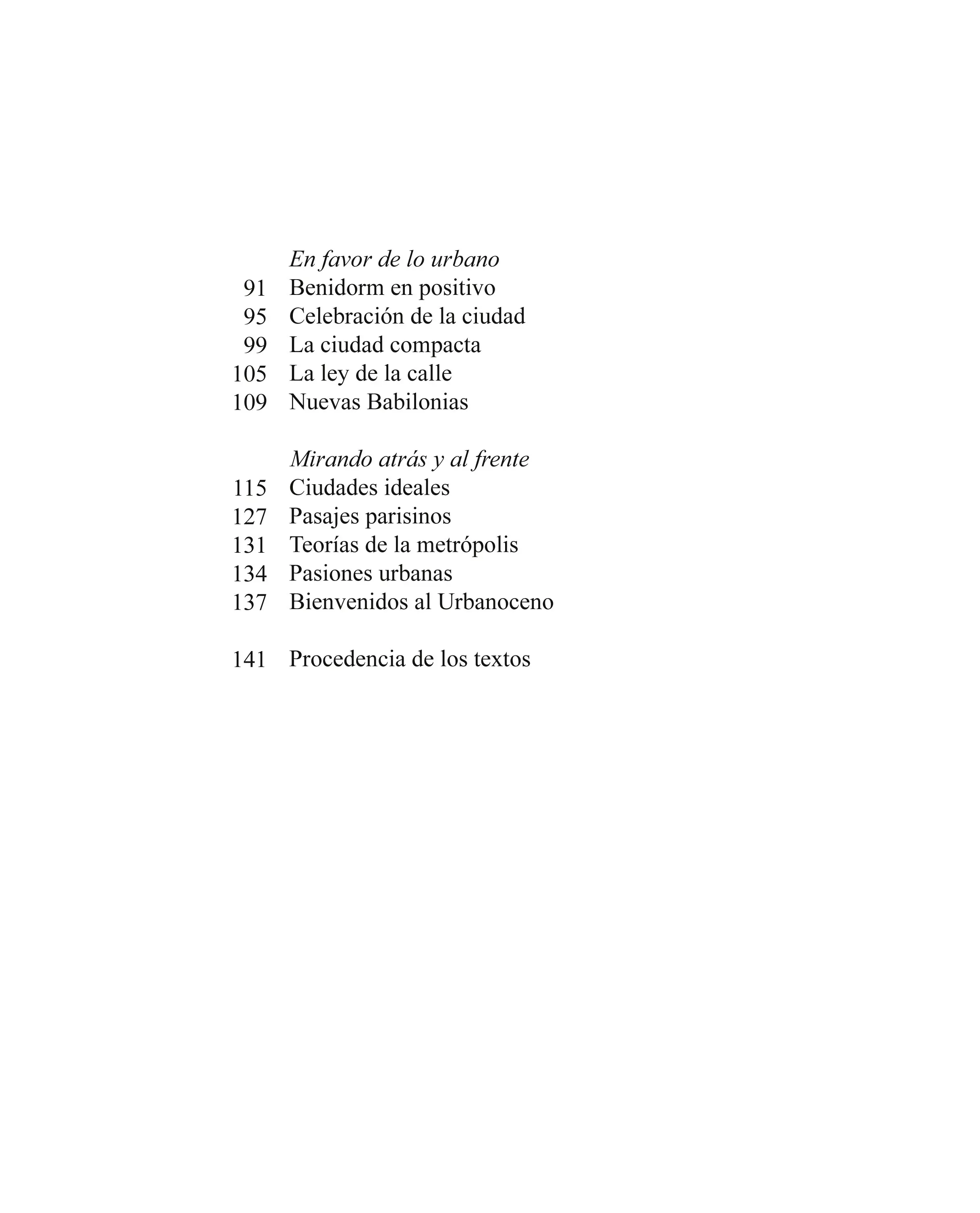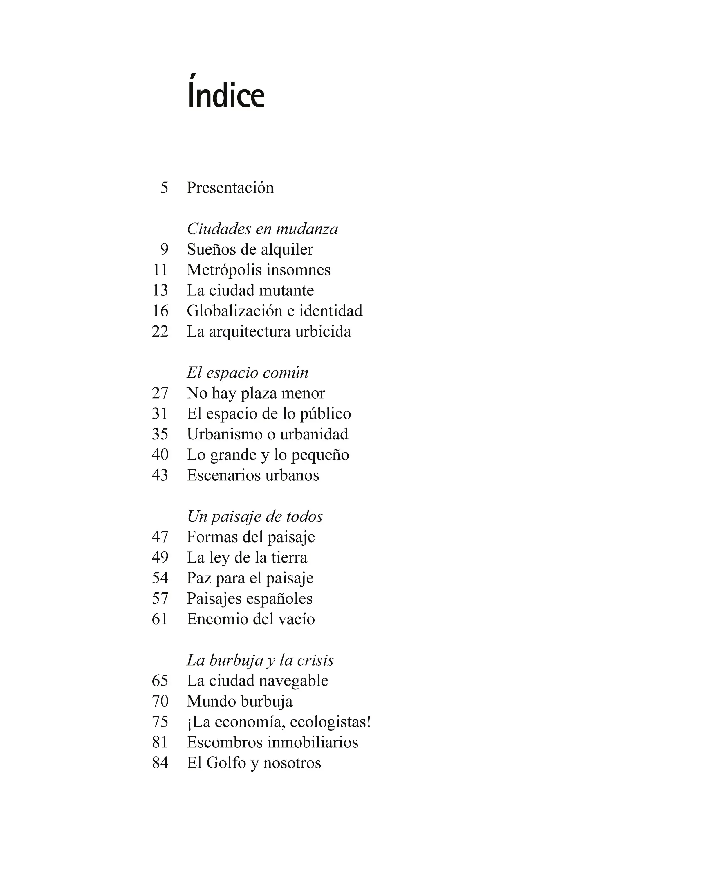Este conjunto de textos sobre los cambios efectuados en el territorio y las ciudades durante las tres últimas décadas se orquesta en seis secciones. La primera cubre las mutaciones urbanas durante la última década del siglo XX, impulsadas por un crecimiento caudaloso que desdibuja la identidad de las ciudades; la segunda se centra en los espacios públicos y defiende la urbanidad amable del entorno; la tercera tiene por eje el paisaje, deplorando las agresiones sufridas por las costas y por los centros históricos españoles; la cuarta recoge el crecimiento de la burbuja inmobiliaria, su estallido en 2008 y el acto de contrición de las arquitecturas fomentadas por ese auge constructivo; en la quinta sección se propone la densidad urbana como herramienta para enfrentarnos al desafío climático; y la sexta sección recuerda las ciudades ideales, recorriendo los cambios de los dos últimos siglos para mirar hacia el futuro de un tiempo que acaso merezca ser denominado Urbanoceno.