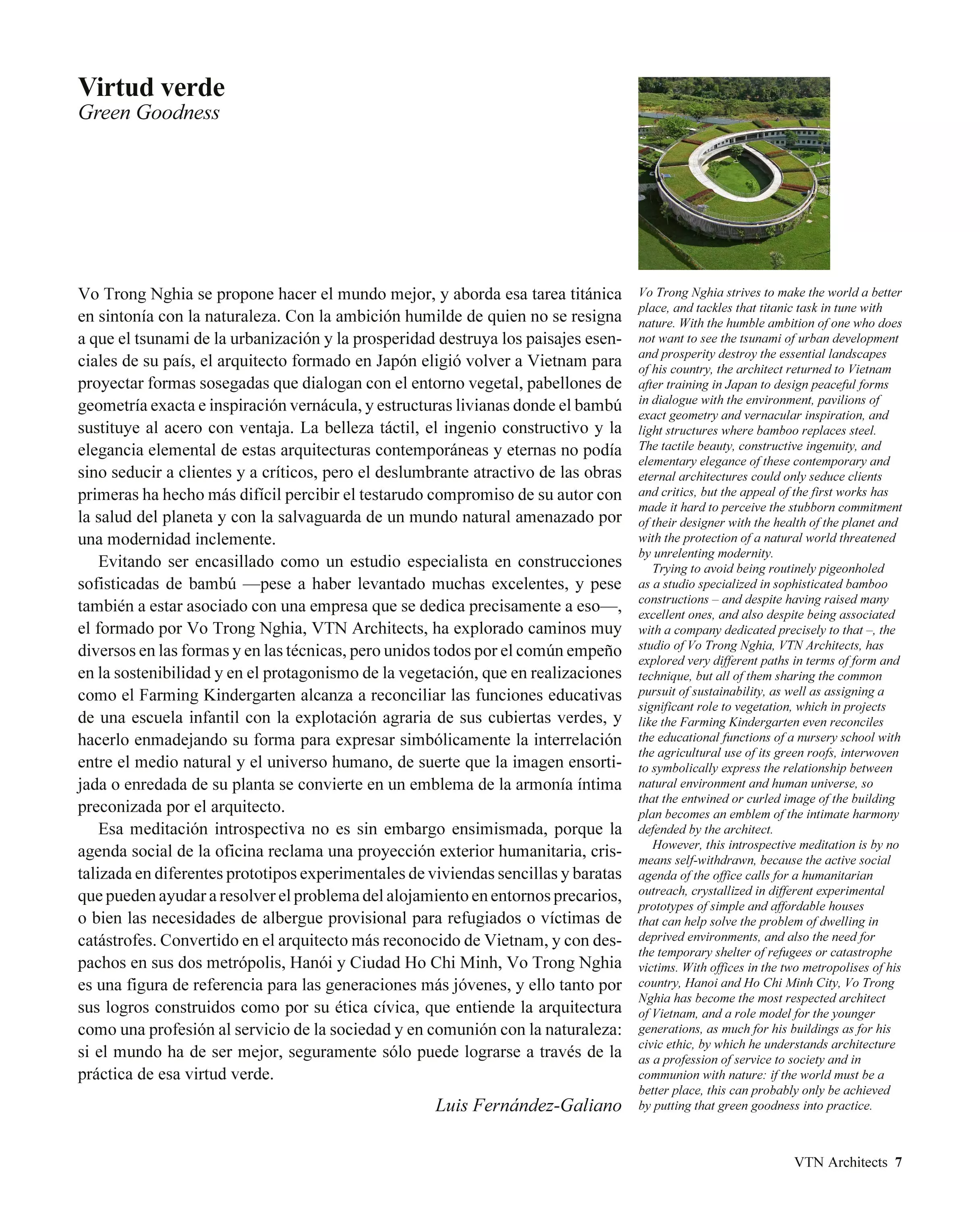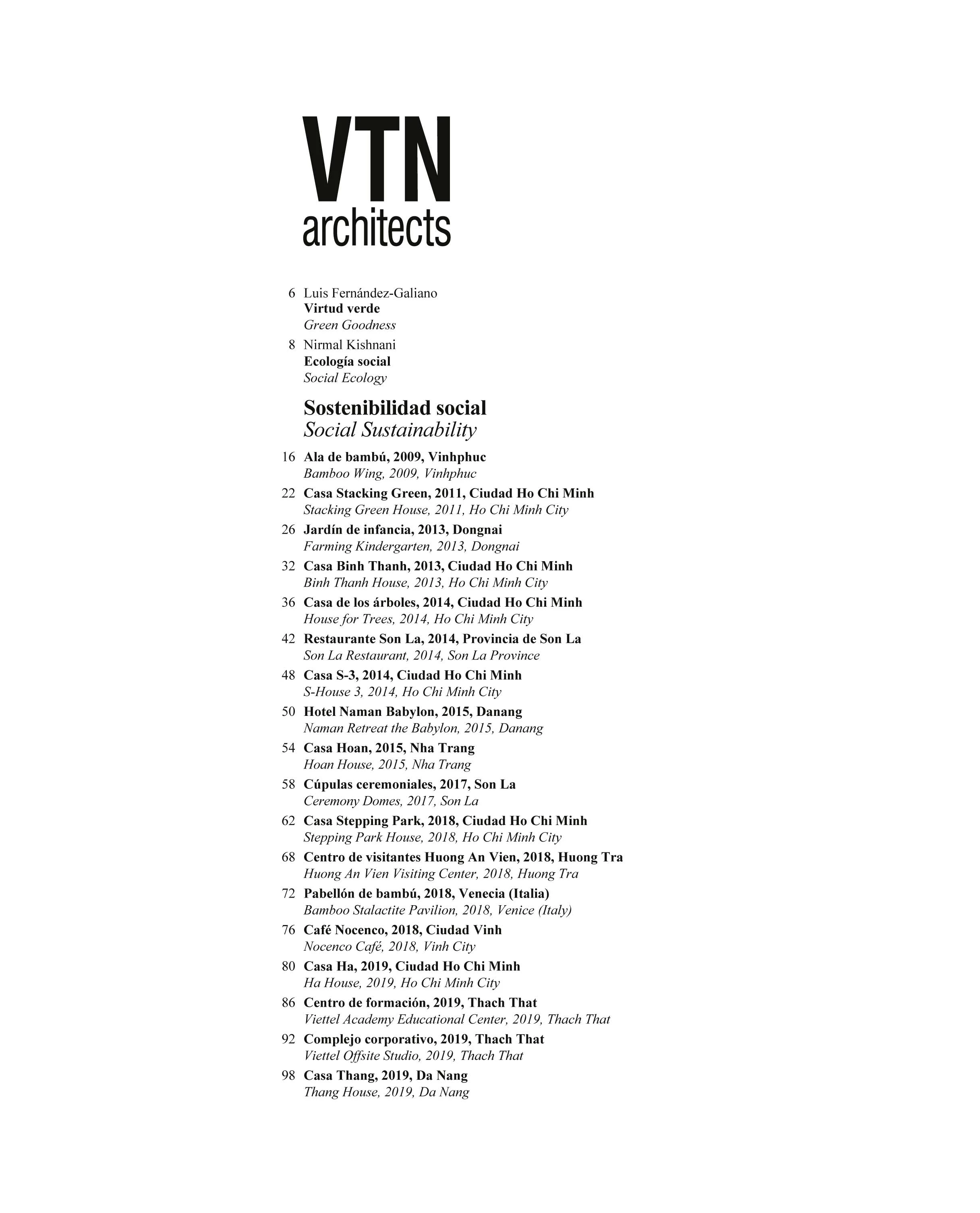 Ahora, en un volumen de 160 páginas, encuadernación en tapa dura y edición bilingüe español-inglés, la editorial Arquitectura Viva recoge una minuciosa selección de 28 obras y proyectos, introducidas por un texto de Luis Fernández-Galiano y un ensayo escrito por Nirmal Kishnani, y una coda introspectiva a cargo del propio Vo Trong Nghia, en la que reflexiona acerca del método práctico y del pensamiento teórico del estudio.