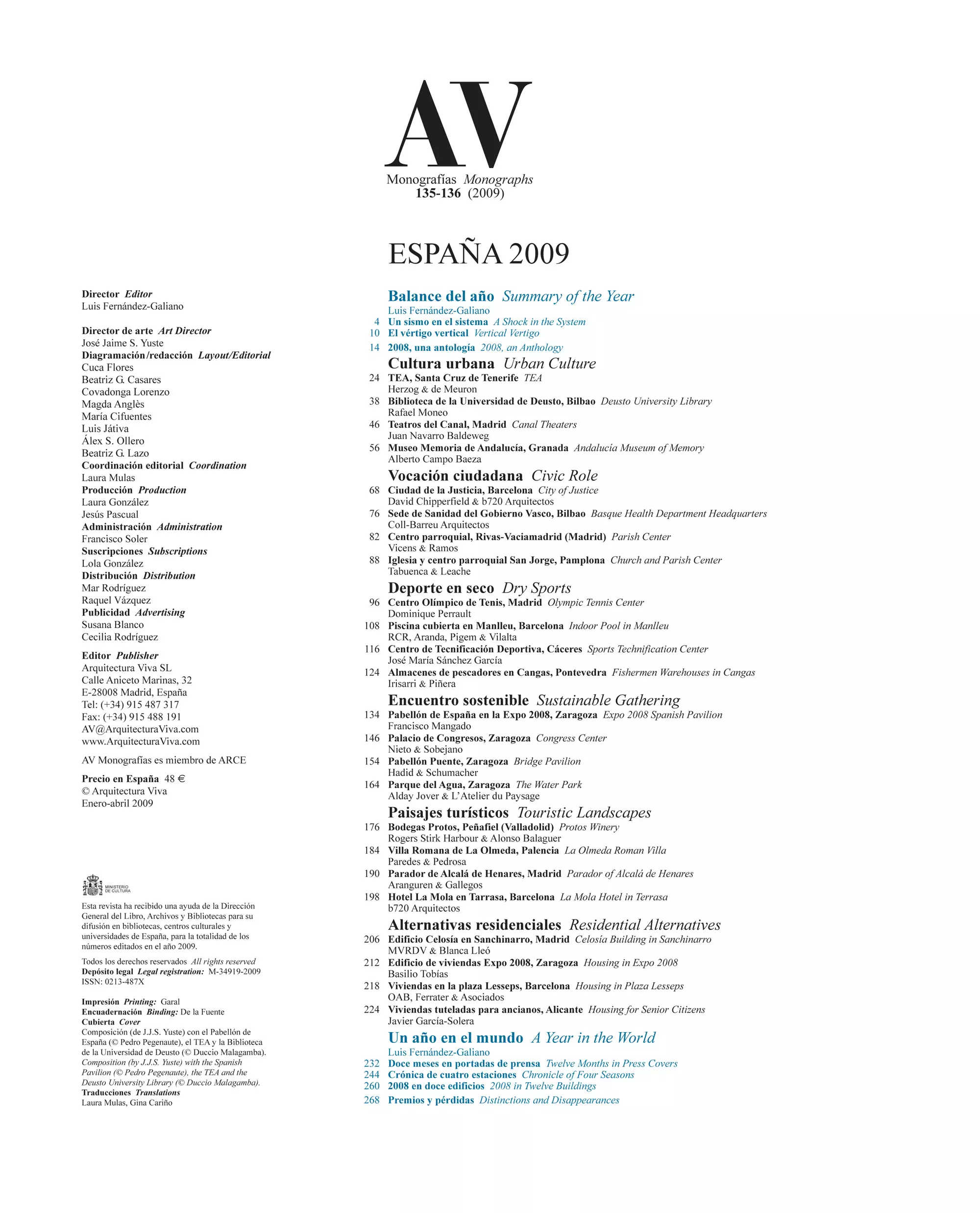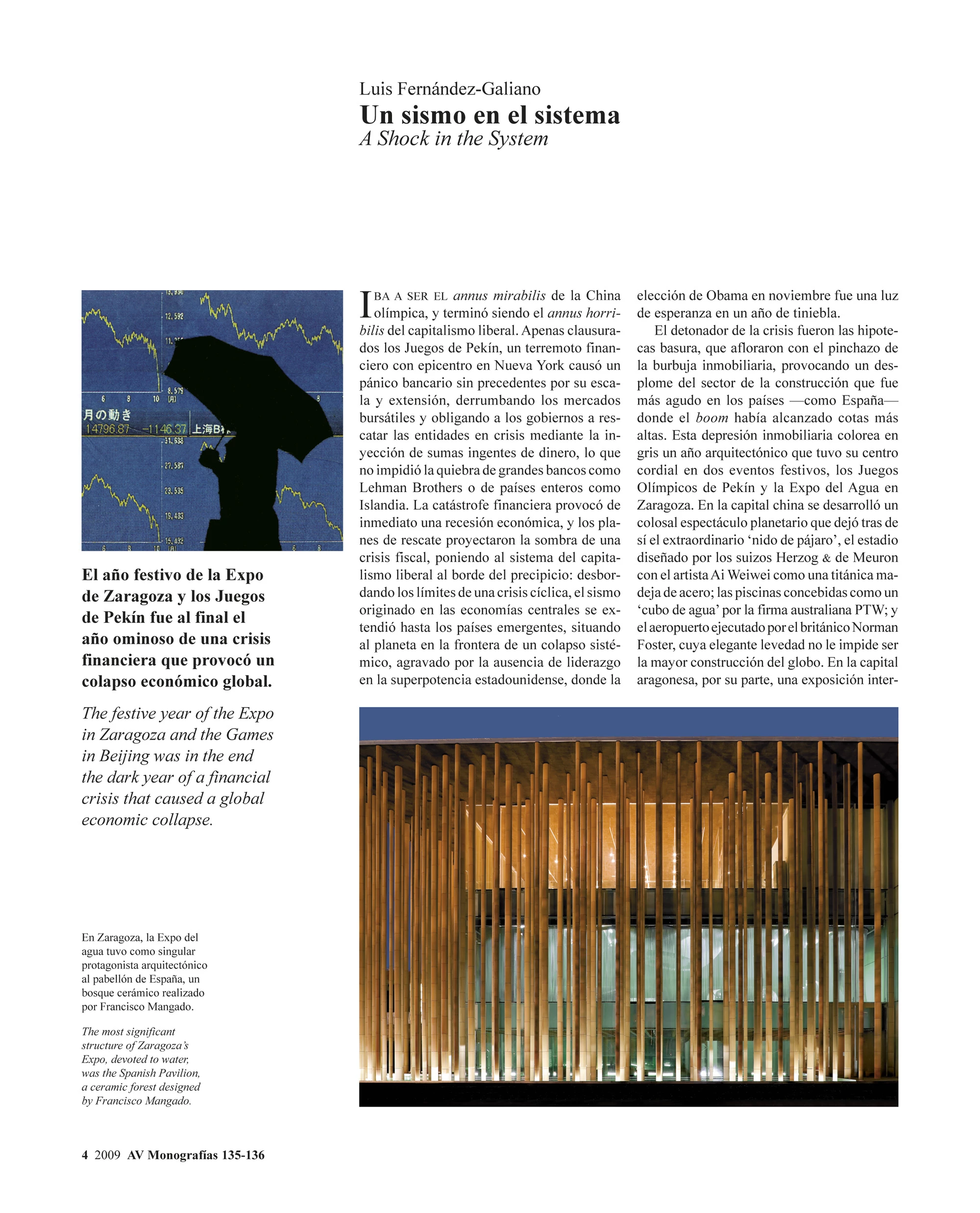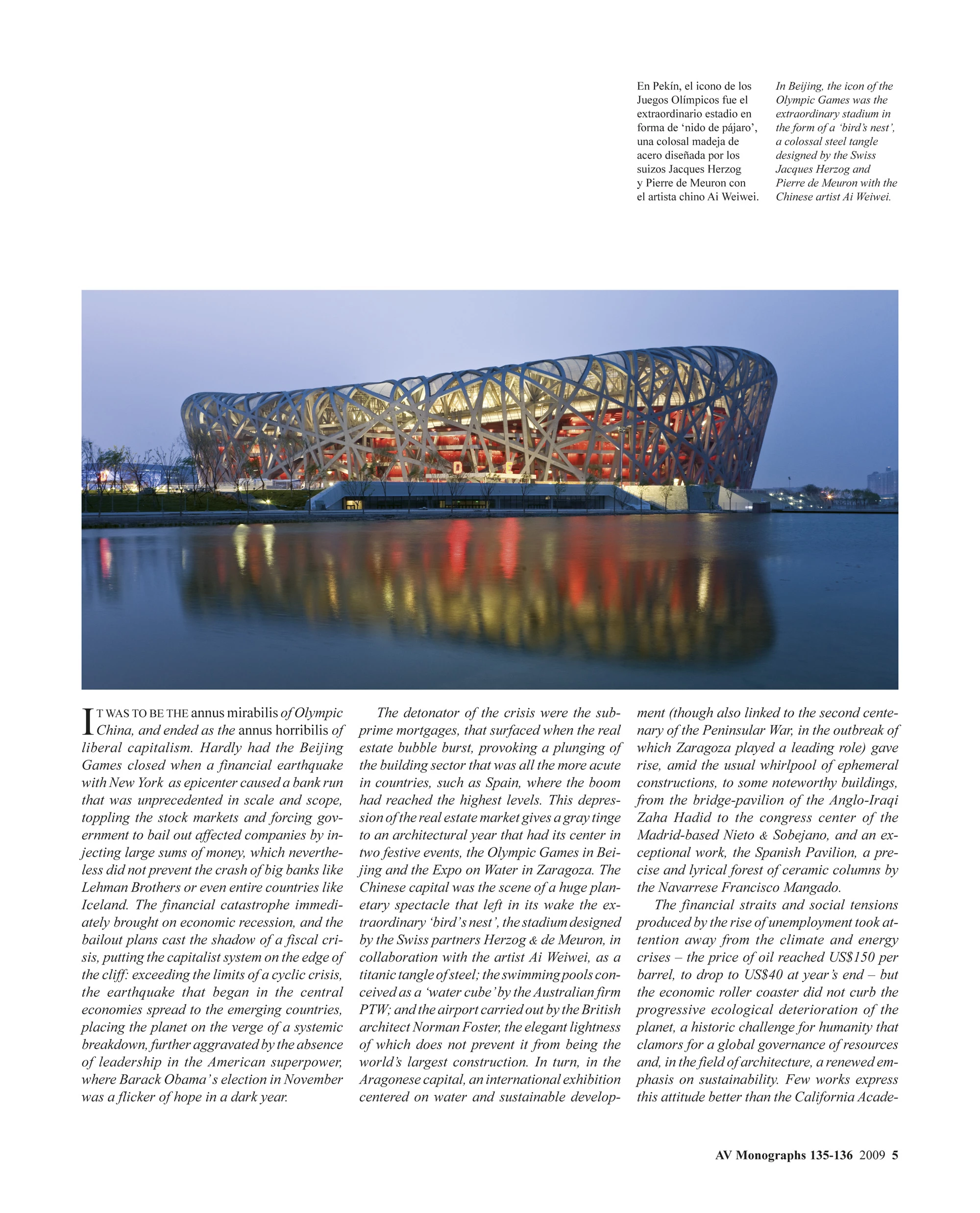 The detonator of the crisis were the subprime mortgages, that surfaced when the real estate bubble burst, provoking a plunging of the building sector that was all the more acute in countries, such as Spain, where the boom had reached the highest levels. This depression of the real estate market gives a gray tinge to an architectural year that had its center in two festive events, the Olympic Games in Beijing and the Expo on Water in Zaragoza. The Chinese capital was the scene of a huge planetary spectacle that left in its wake the extraordinary ‘bird’ s nest’, the stadium designed by the Swiss partners Herzog & de Meuron, in collaboration with the artist Ai Weiwei, as a titanic tangle of steel; the swimming pools conceived as a ‘water cube’ by the Australian firm PTW; and the airport carried out by the British architect Norman Foster, the elegant lightness of which does not prevent it from being the world’s largest construction. In turn, in the Aragonese capital, an international exhibition centered on water and sustainable development (though also linked to the second centenary of the Peninsular War, in the outbreak of which Zaragoza played a leading role) gave rise, amid the usual whirlpool of ephemeral constructions, to some noteworthy buildings, from the bridge-pavilion of the Anglo-Iraqi Zaha Hadid to the congress center of the Madrid-based Nieto & Sobejano, and an exceptional work, the Spanish Pavilion, a precise and lyrical forest of ceramic columns by the Navarrese Francisco Mangado.