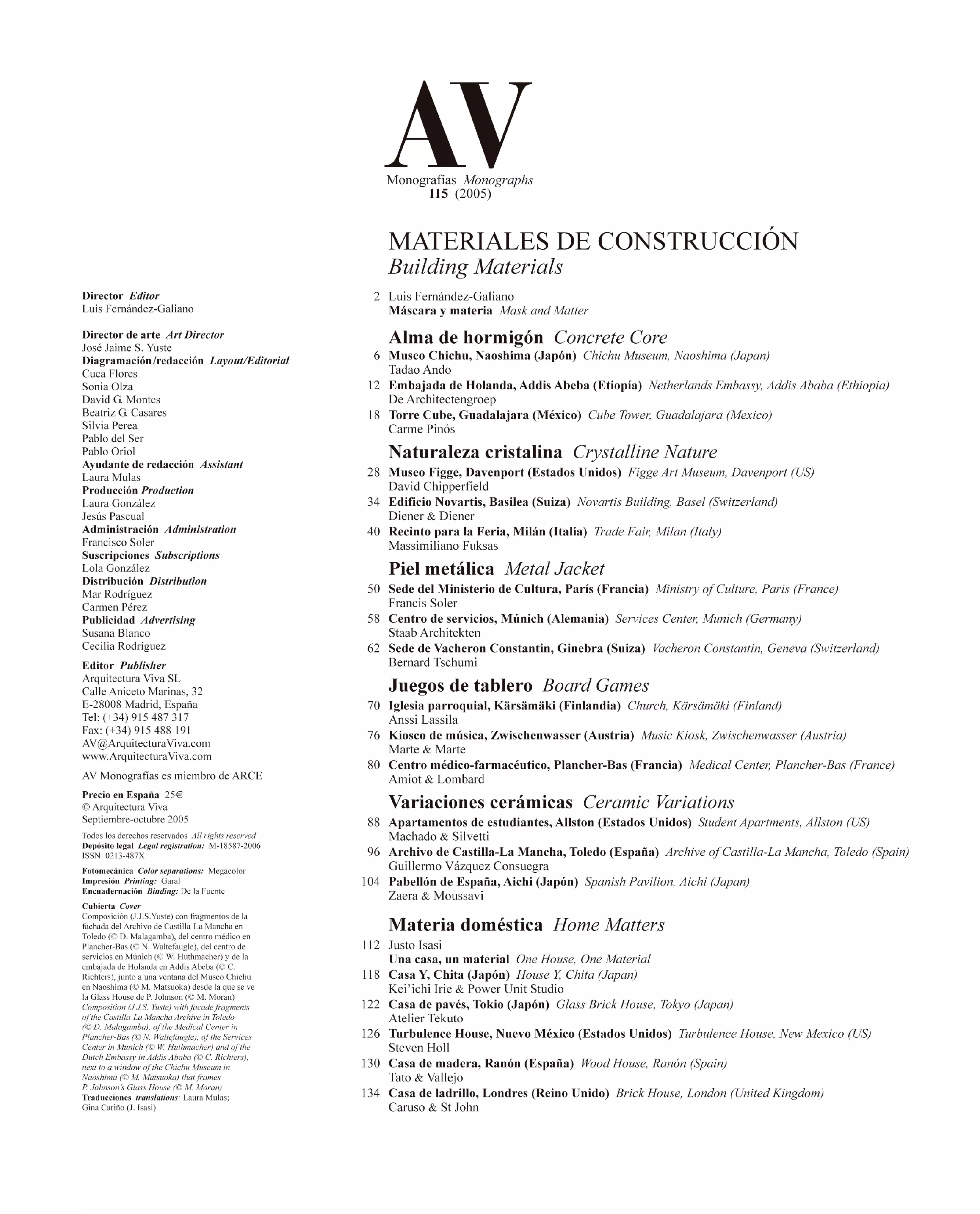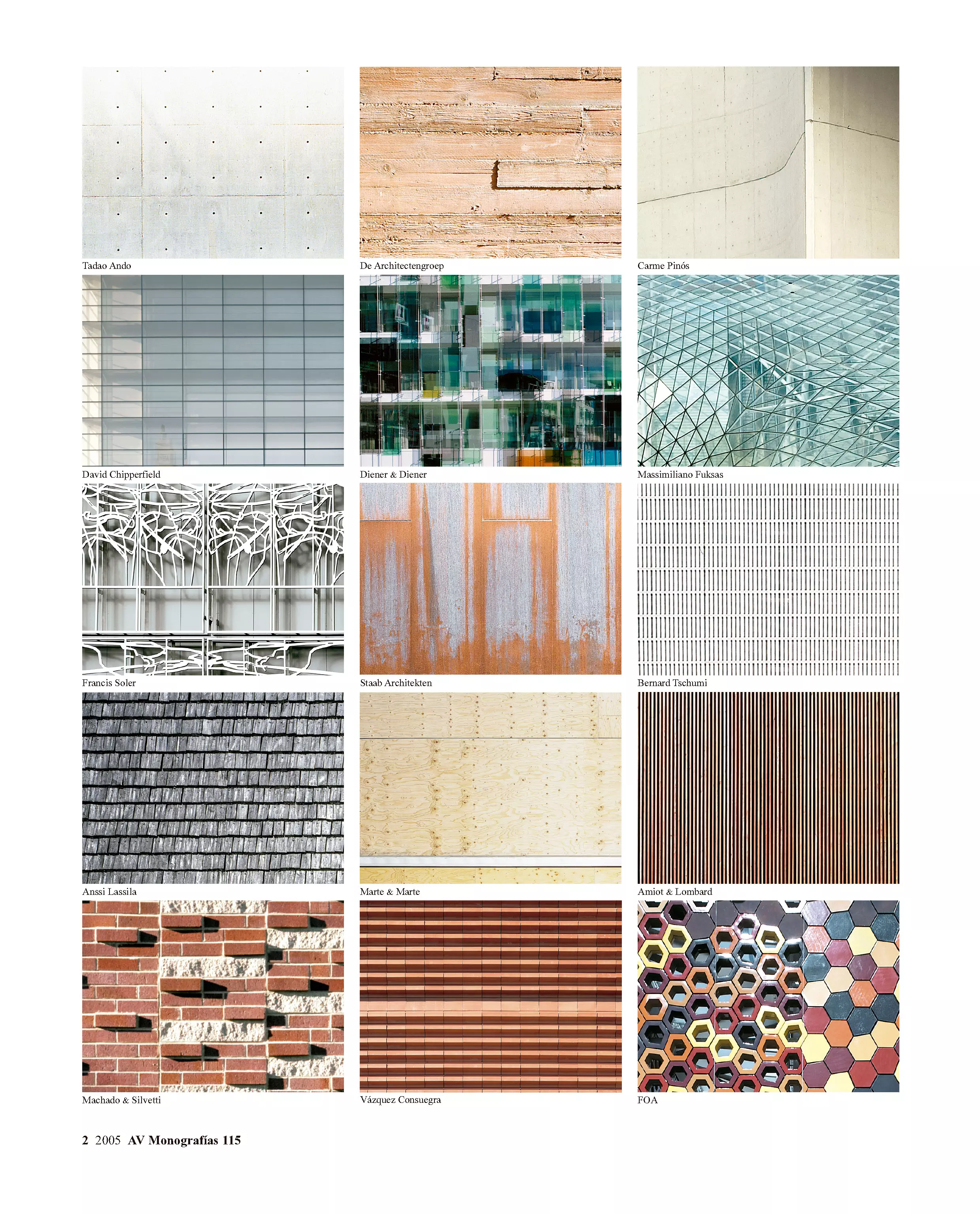 Sequestered by the hedonistic fascination of epithelial art, our contemporaries undertake the exploration of materials with the experimental spirit of aesthetic investigation, the urgent impatience of sensation and the tenacious pursuit of innovation. Here this quest is orchestrated in five ‘movements’, each corresponding to one family of materials – concrete, glass, metal, wood and brick –, whose plain denominations do not easily reveal the endless variety of products available, and whose echoes of nature and convention equivocally conceal the extremely artificial sophistication of the processes by which they are manufactured, hardly recalling their traditional or vernacular origins. The five materials mentioned appear on our cover, and the facade collage is perforated to quote the transparency of glass and at the same time pay an ironic centennial tribute to a master of masks and simulation.