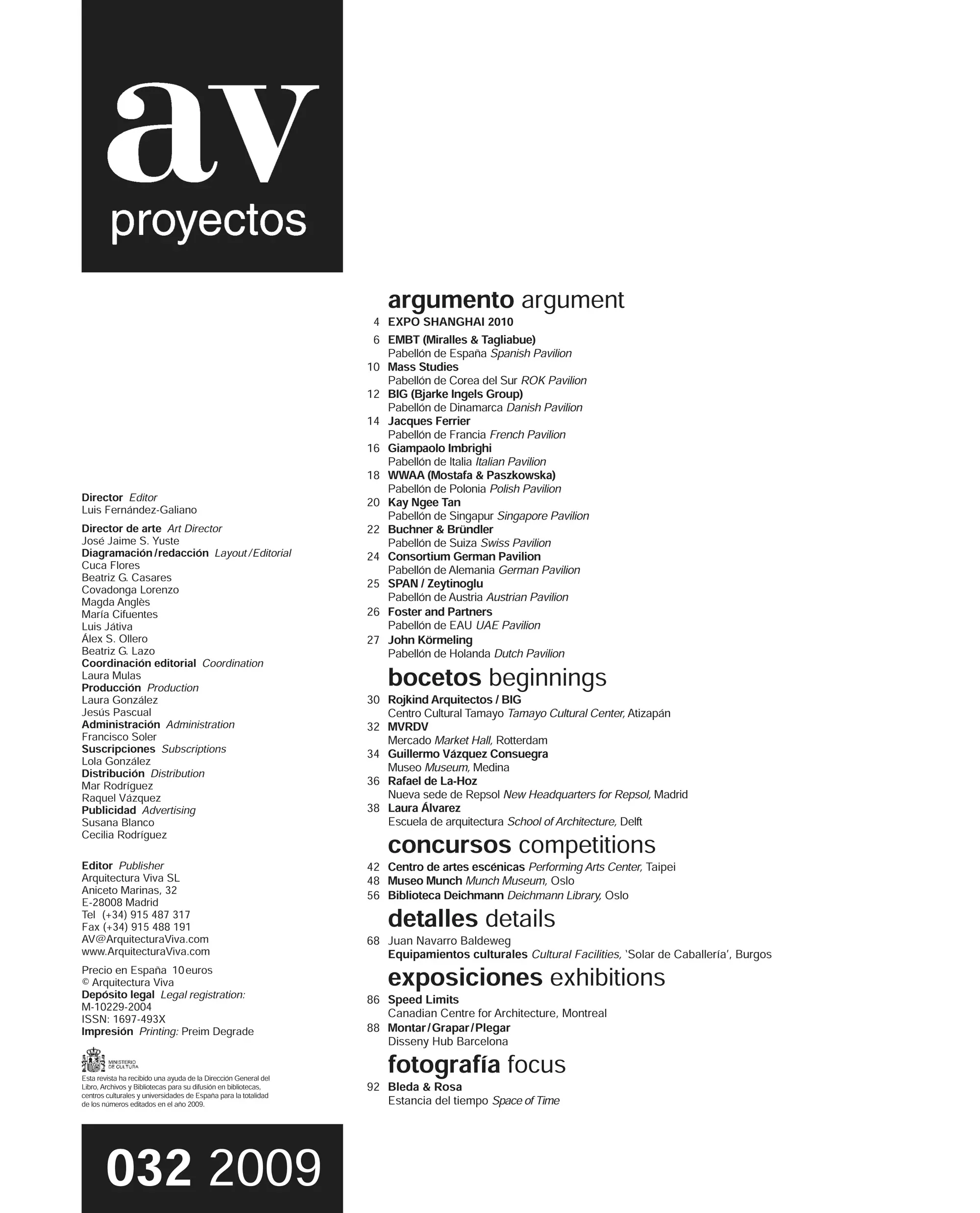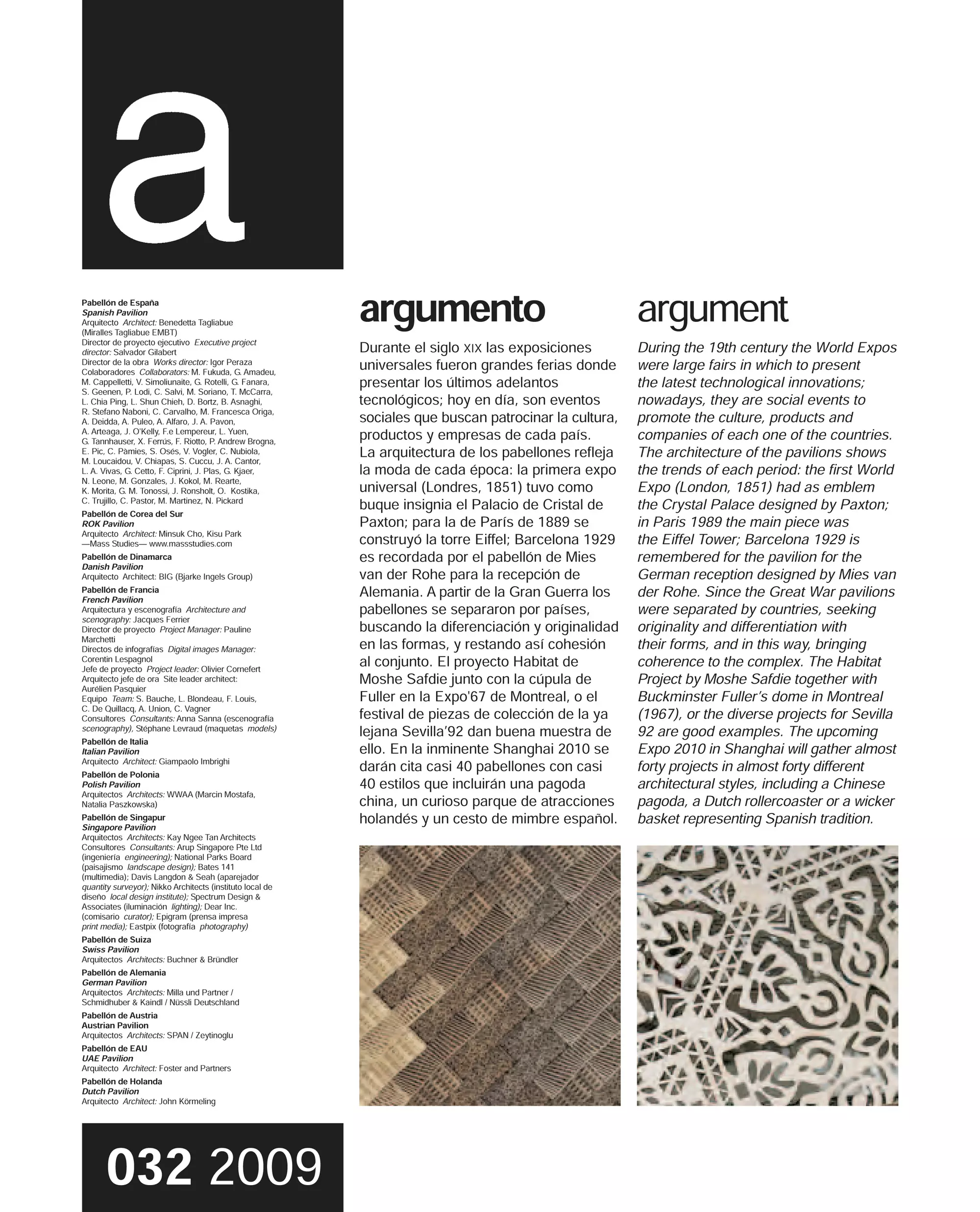 Arquitecto: EMBT (Miralles & Tagliabue)/ Mass Studies / BIG (Bjarke Ingels Group)/ Ferrier, Jacques / Imbrighi, Giampaolo / WWAA (Mostafa & Paszkowska) / Ngee Tan, Kay / Bchner & Brndler / Consortium German Pavilion / SPAN; Zeytinoglu / Foster, Norman / K”rmeling, John /
