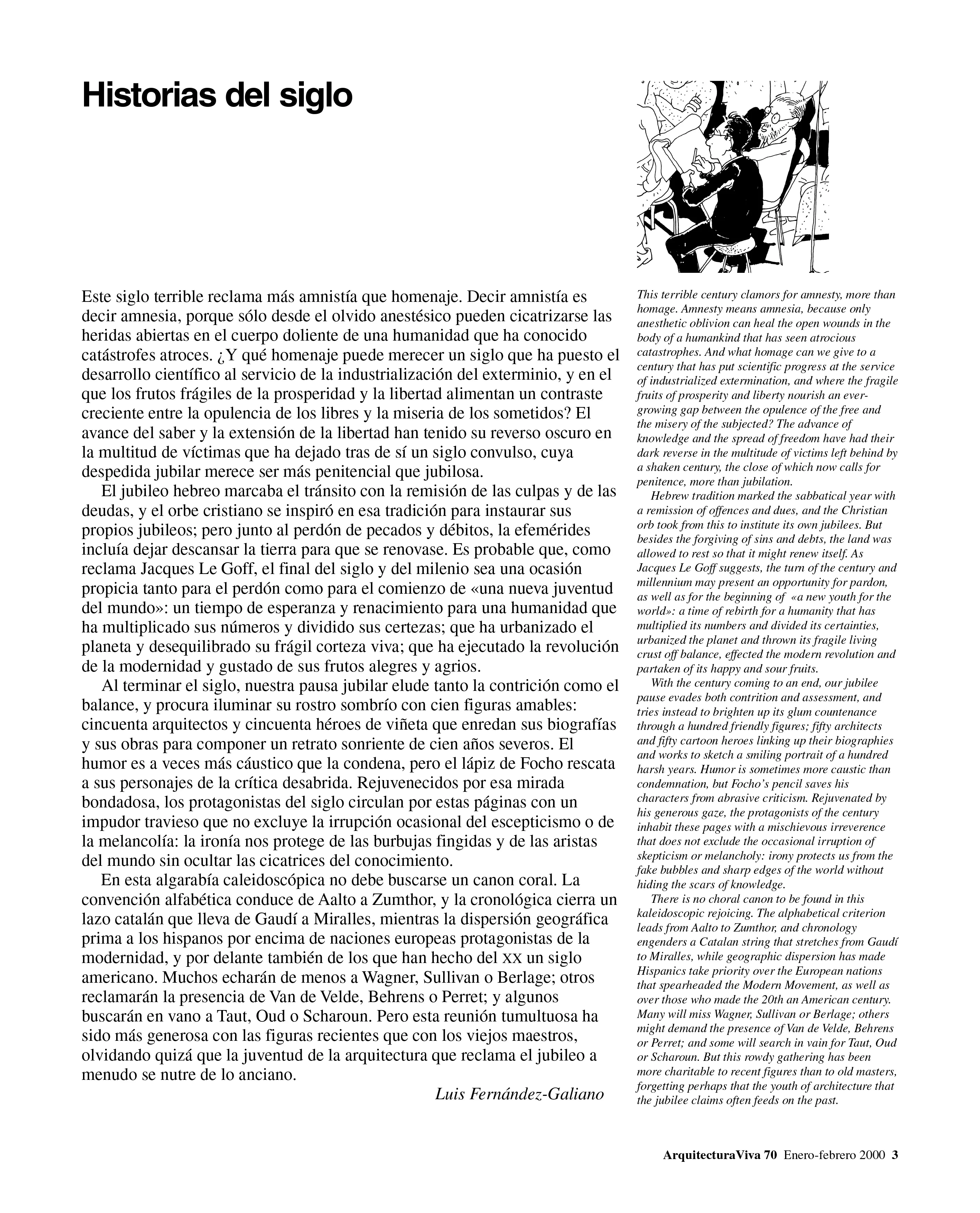With the century coming to an end, our jubilee pause evades both contrition and assessment, and tries instead to brighten up its glum countenance through a hundred friendly figures; fifty architects and fifty cartoon heroes linking up their biographies and works to sketch a smiling portrait of a hundred harsh years. Humor is sometimes more caustic than condemnation, but Focho’s pencil saves his characters from abrasive criticism. Rejuvenated by his generous gaze, the protagonists of the century inhabit these pages with a mischievous irreverence that does not exclude the occasional irruption of skepticism or melancholy: irony protects us from the fake bubbles and sharp edges of the world without hiding the scars of knowledge.