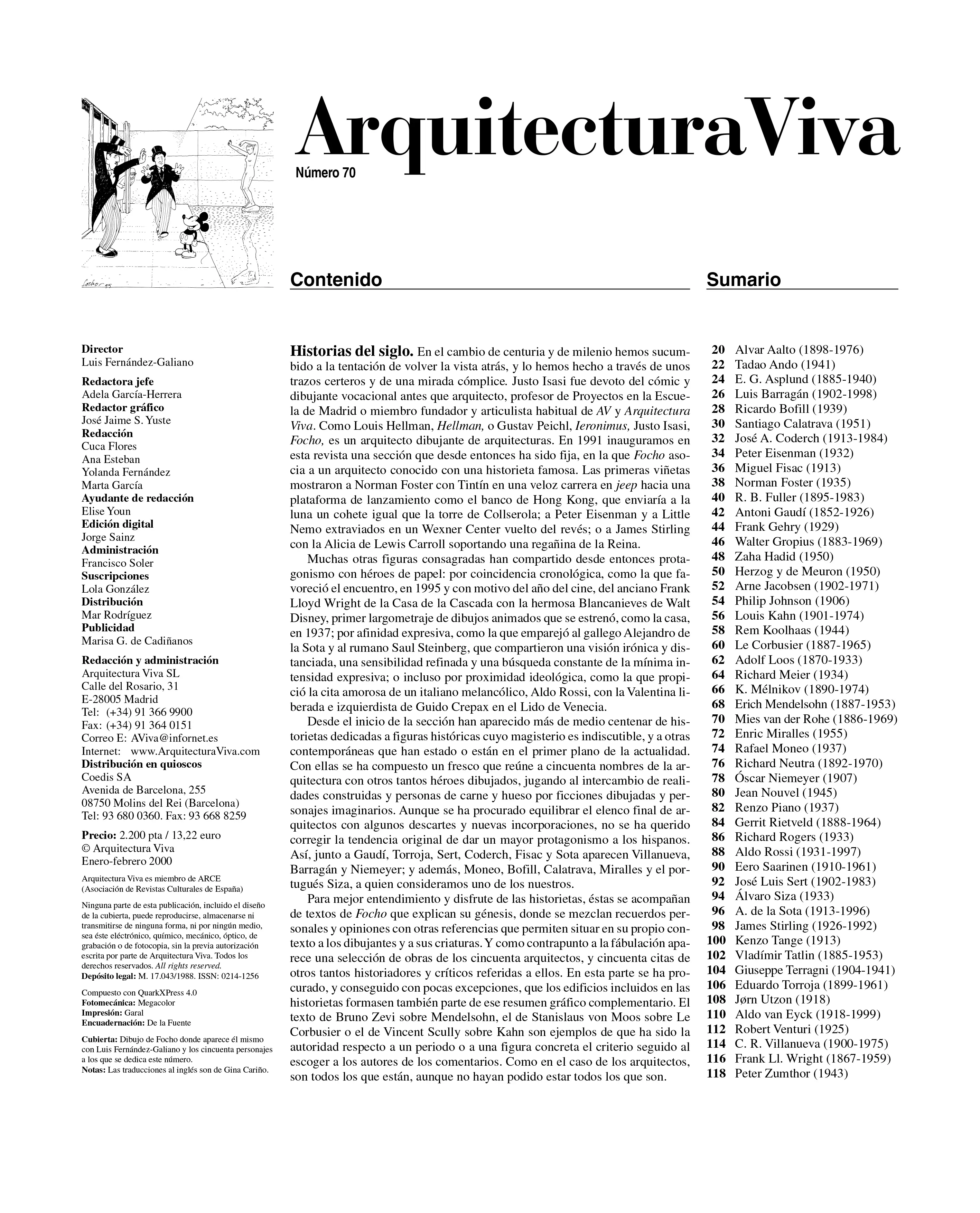 Strips of Our Times. The turn of the century and millennium tempts us to look back, and we have succumbed here through a sure hand and a conspiratorial glance. Justo Isasi was a comics fan and an amateur cartoonist before he became an architect, a design teacher at the Madrid school, or a founding member and regular feature writer of AV and Arquitectura Viva. Like Louis Hellman alias Hellman or Gustav Peichl alias Ironimus, Justo Isasi alias Focho is an architect who draws architectural cartoons. In 1991 the magazine started up a section in which Focho associates a well-known architect with a famous cartoon character. The first strips had Norman Foster and Tintin racing in a jeep toward a launching pad in the shape of the Hong Kong Bank, which would send to the moon a rocket resembling the Collserola Tower; or Peter Eisenman and Little Nemo lost inside an inverted Wexner Center; or James Stirling and Alice in Wonderland taking a scolding by the Queen.