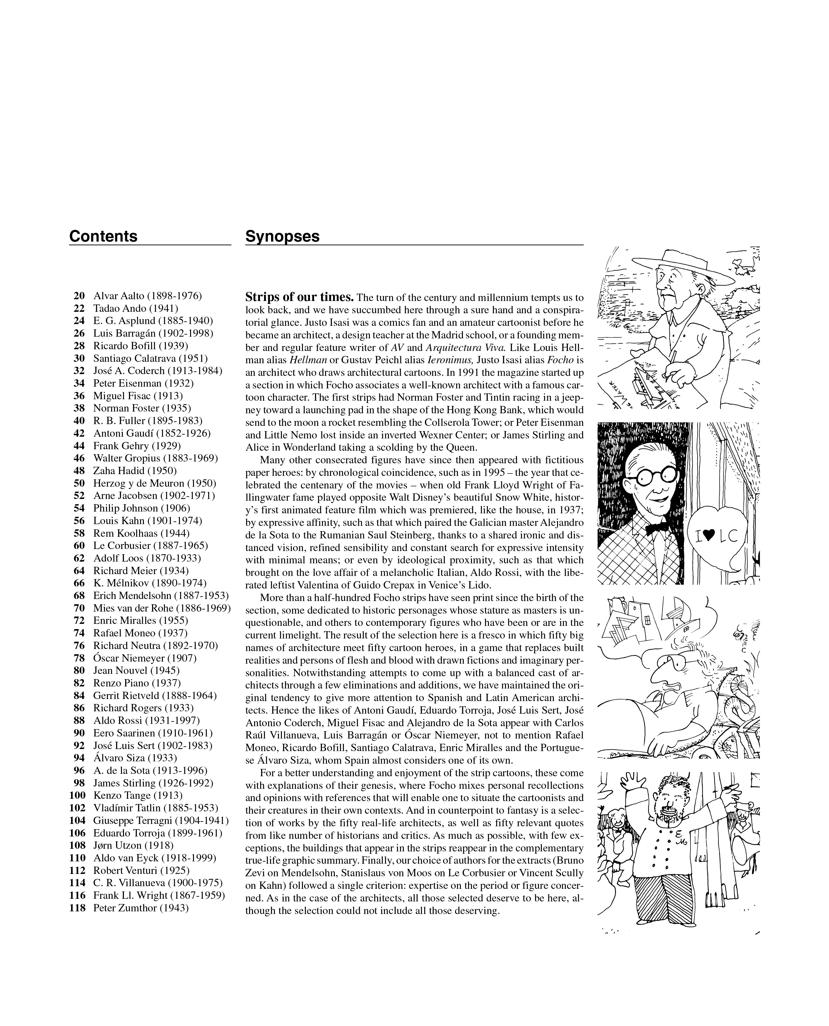 For a better understanding and enjoyment of the strip cartoons, these come with explanations of their genesis, where Focho mixes personal recollections and opinions with references that will enable one to situate the cartoonists and their creatures in their own contexts. And in counterpoint to fantasy is a selection of works by the fifty real-life architects, as well as fifty relevant quotes from like number of historians and critics. As much as possible, with few exceptions, the buildings that appear in the strips reappear in the complementary true-life graphic summary. Finally, our choice of authors for the extracts (Bruno Zevi on Mendelsohn, Stanislaus von Moos on Le Corbusier or Vincent Scully on Kahn) followed a single criterion: expertise on the period or figure concerned. As in the case of the architects, all those selected deserve to be here, although the selection could not include all those deserving.