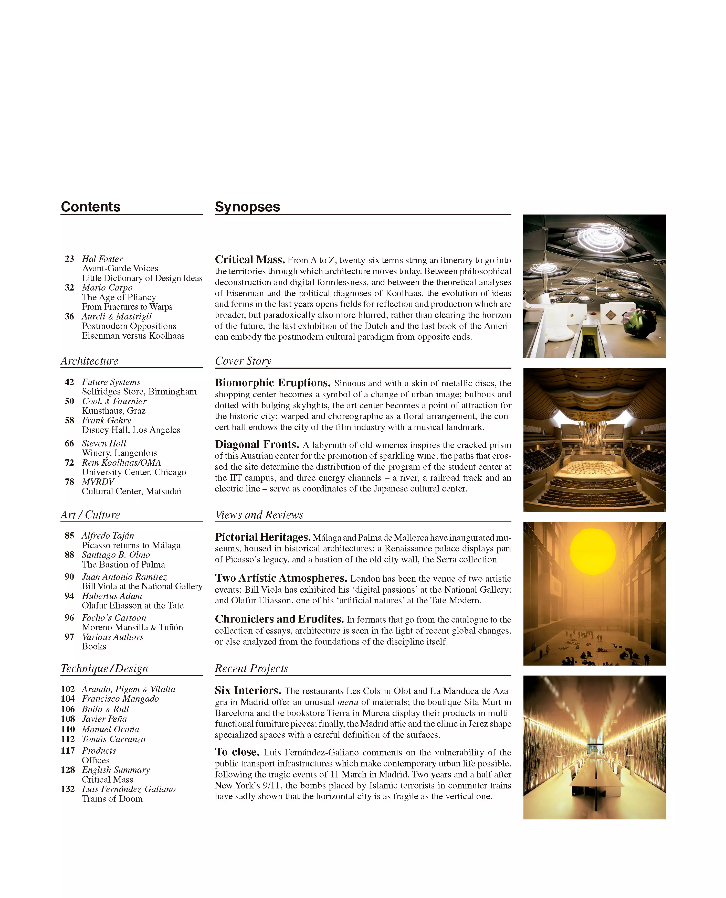 Critical Mass. From A to Z, twenty-six terms string an itinerary to go into the territories through which architecture moves today. Between philosophical deconstruction and digital formlessness, and between the theoretical analyses of Eisenman and the political diagnoses of Koolhaas, the evolution of ideas and forms in the last years opens fields for reflection and production which are broader, but paradoxically also more blurred; rather than clearing the horizon of the future, the last exhibition of the Dutch and the last book of the American embody the postmodern cultural paradigm from opposite ends.