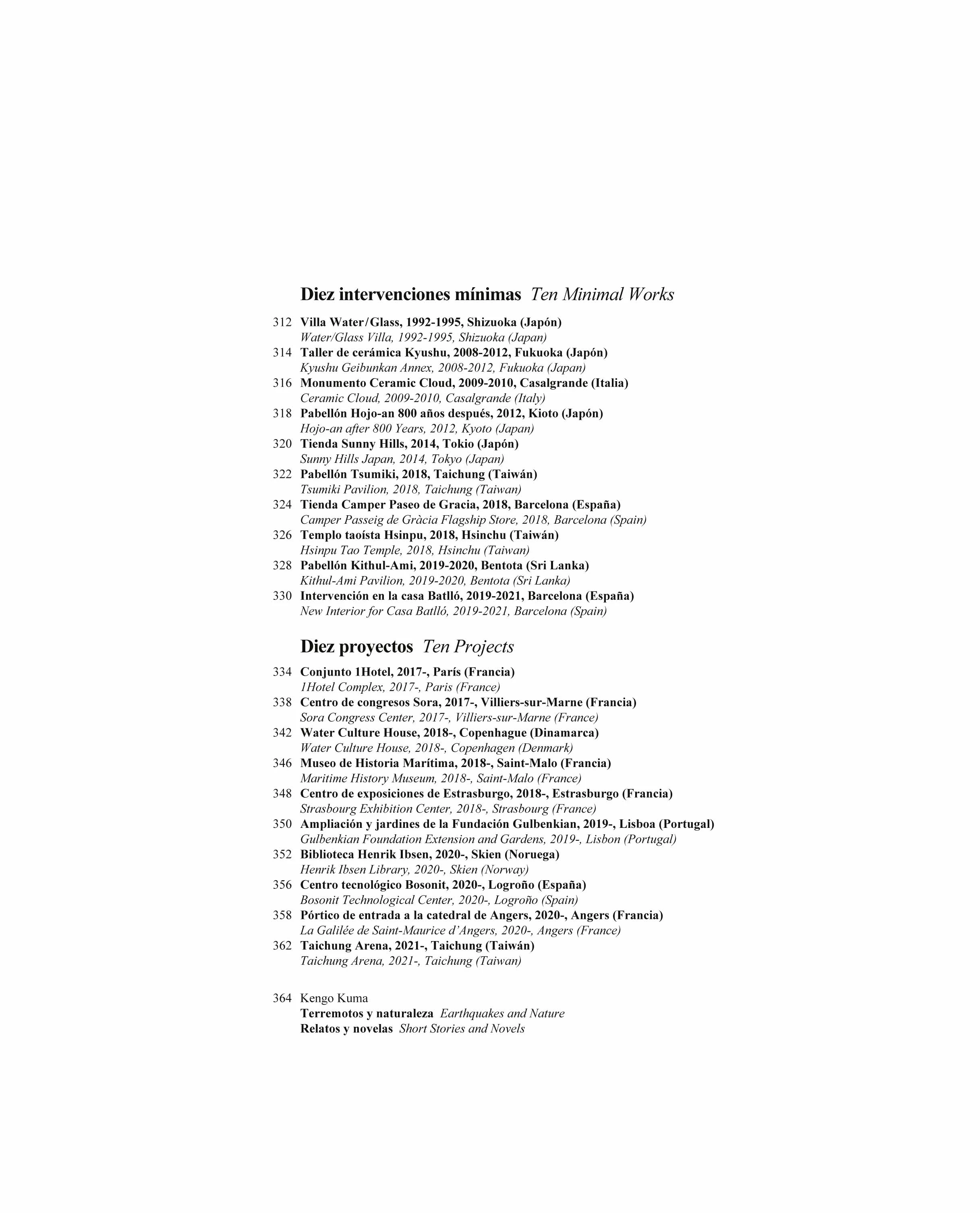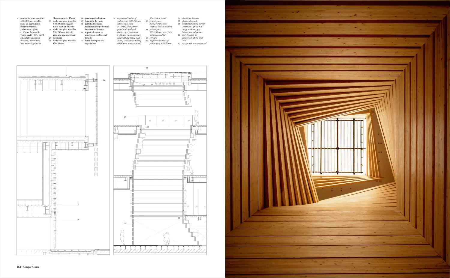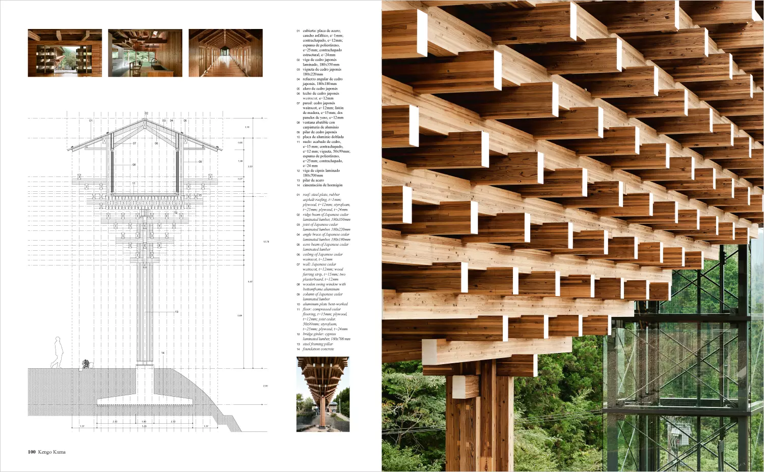 Setting himself apart from Japanese architects of his generation who are prone to pursue extreme simplicity and a bare materiality, Kengo Kuma prefers to pour his craftsman’s dexterity and his love of nature into comfortable spaces that, wth the sensitivity of ukiyo-e prints, seek to blend with the surroundings and recreate lyrical atmospheres. Arquitectura Viva now condenses a prolific creator’s corpus of buildings, minimal interventions, and projects in a large, 368-page bilingual (Spanish/English) hardbound volume that takes stock of the very wide register of strategies, scales, and materials of what is now a global enterprise, but maintains the simple refinement that is a trademark of the house. A presentation by Luis Fernández-Galiano and an in-depth essay by Juhani Pallasmaa complement Kuma’s own reflections, which close the publication.